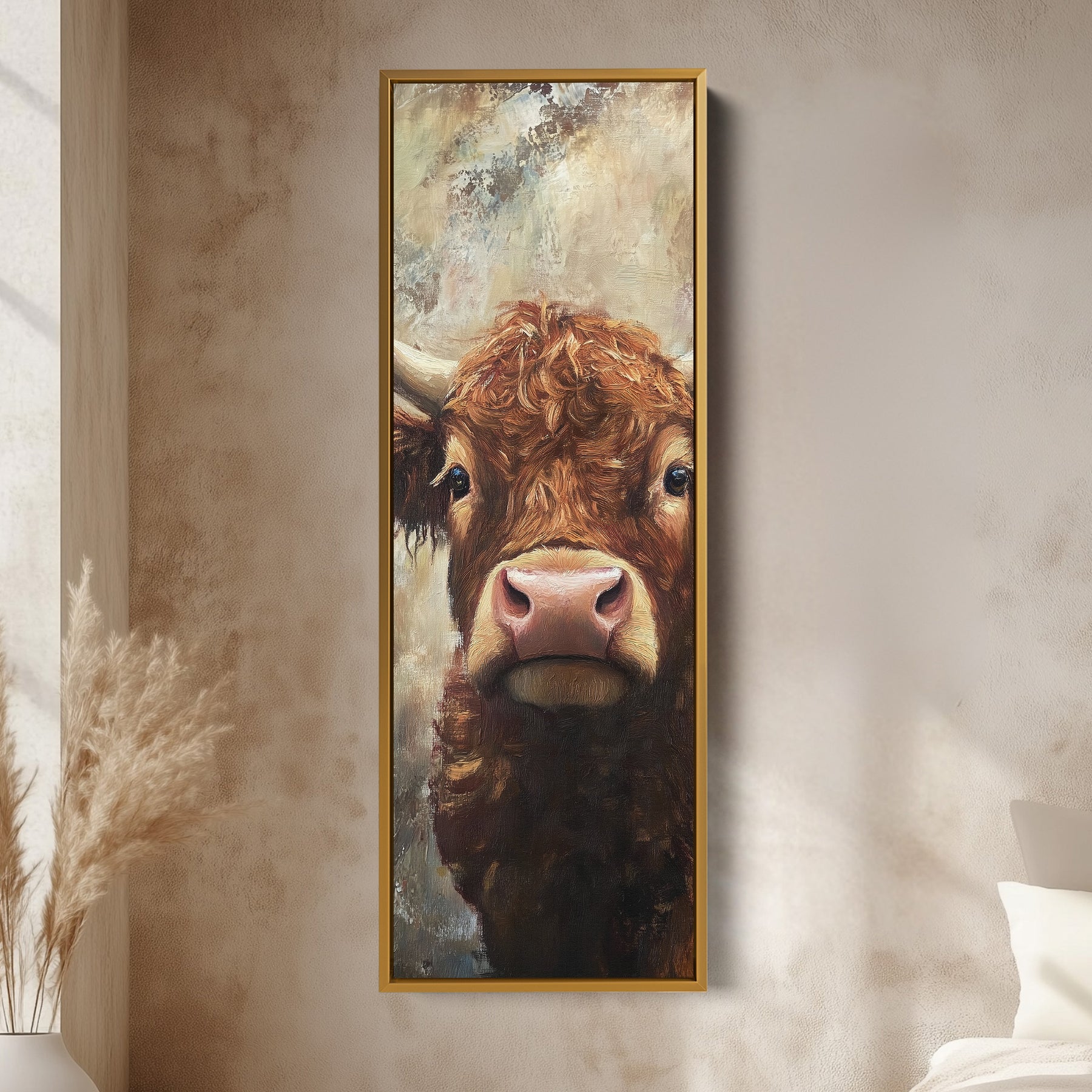 This tall slim wall art features a striking oil painting of a Highland cow, capturing its majestic presence with a close-up portrait. The detailed fur and meticulous attention to the eyes, nose, and mouth bring the cow’s character to life. Set against a textured background with a rustic farmhouse aesthetic, the neutral tones create a timeless and elegant piece perfect for any space.
