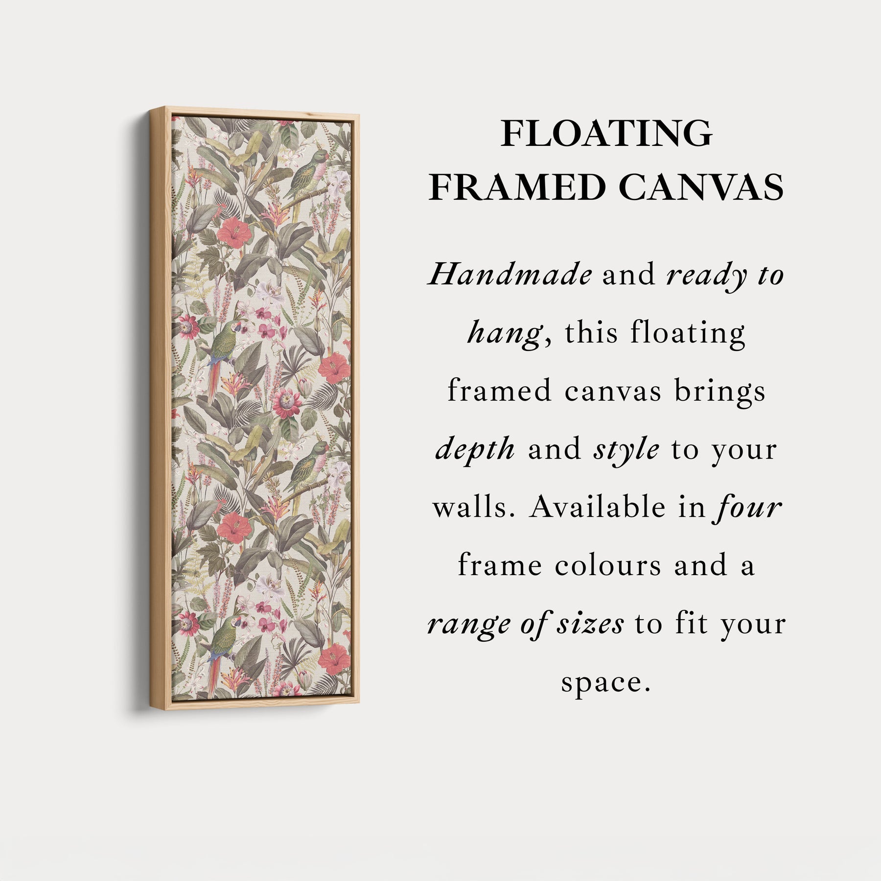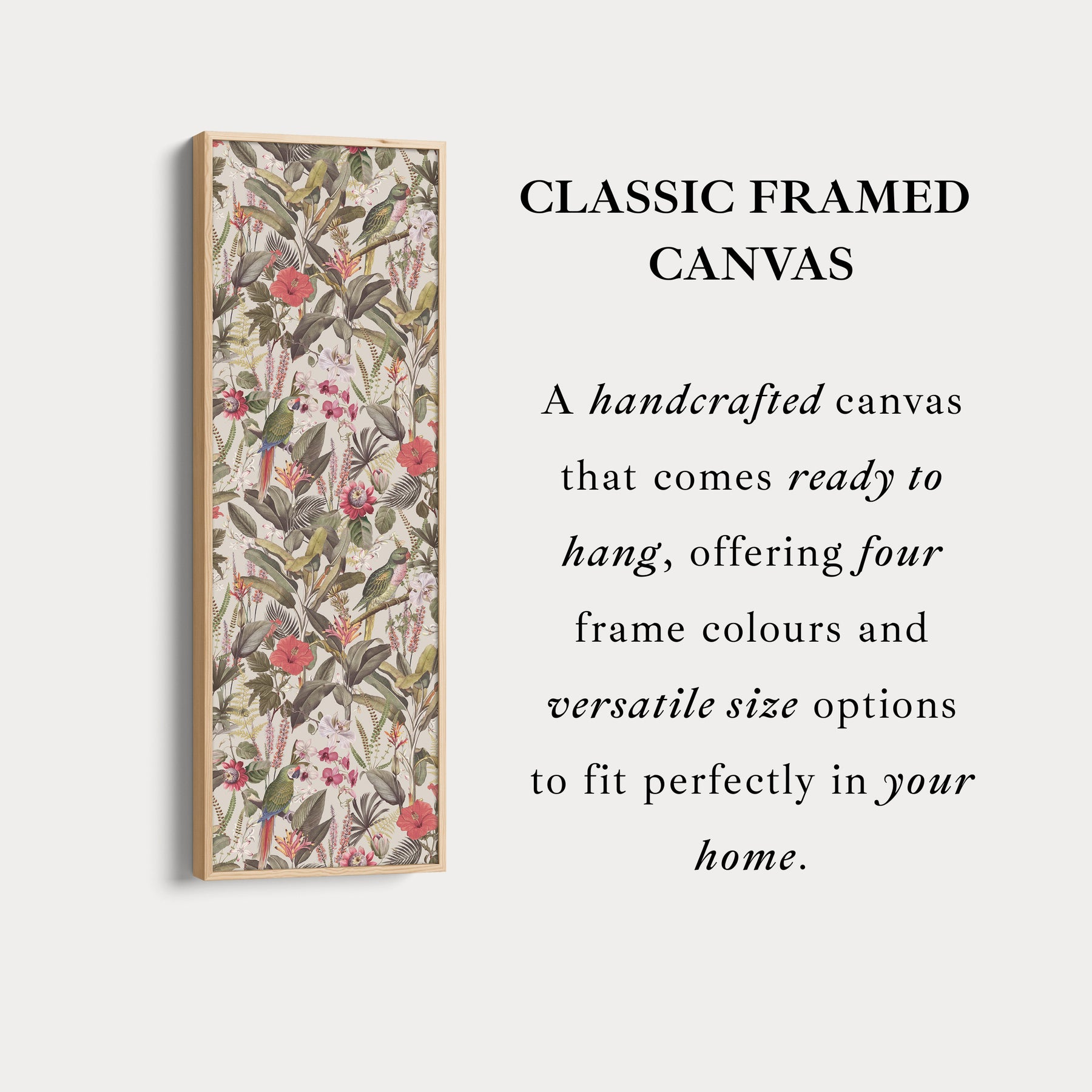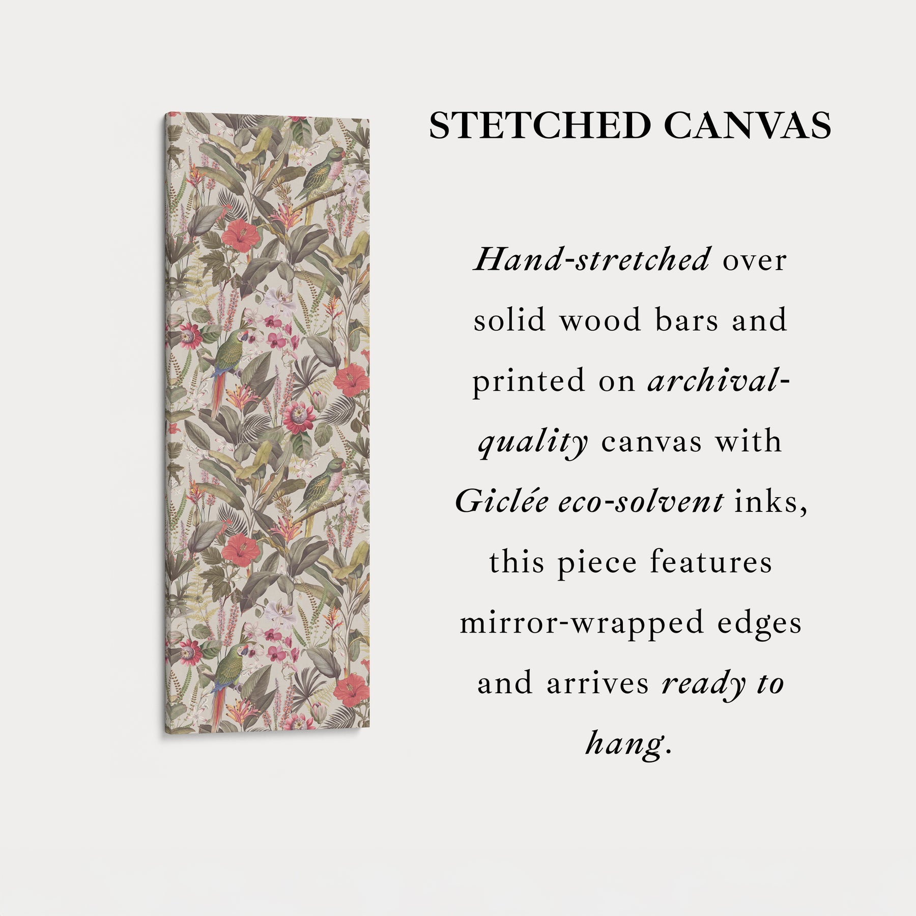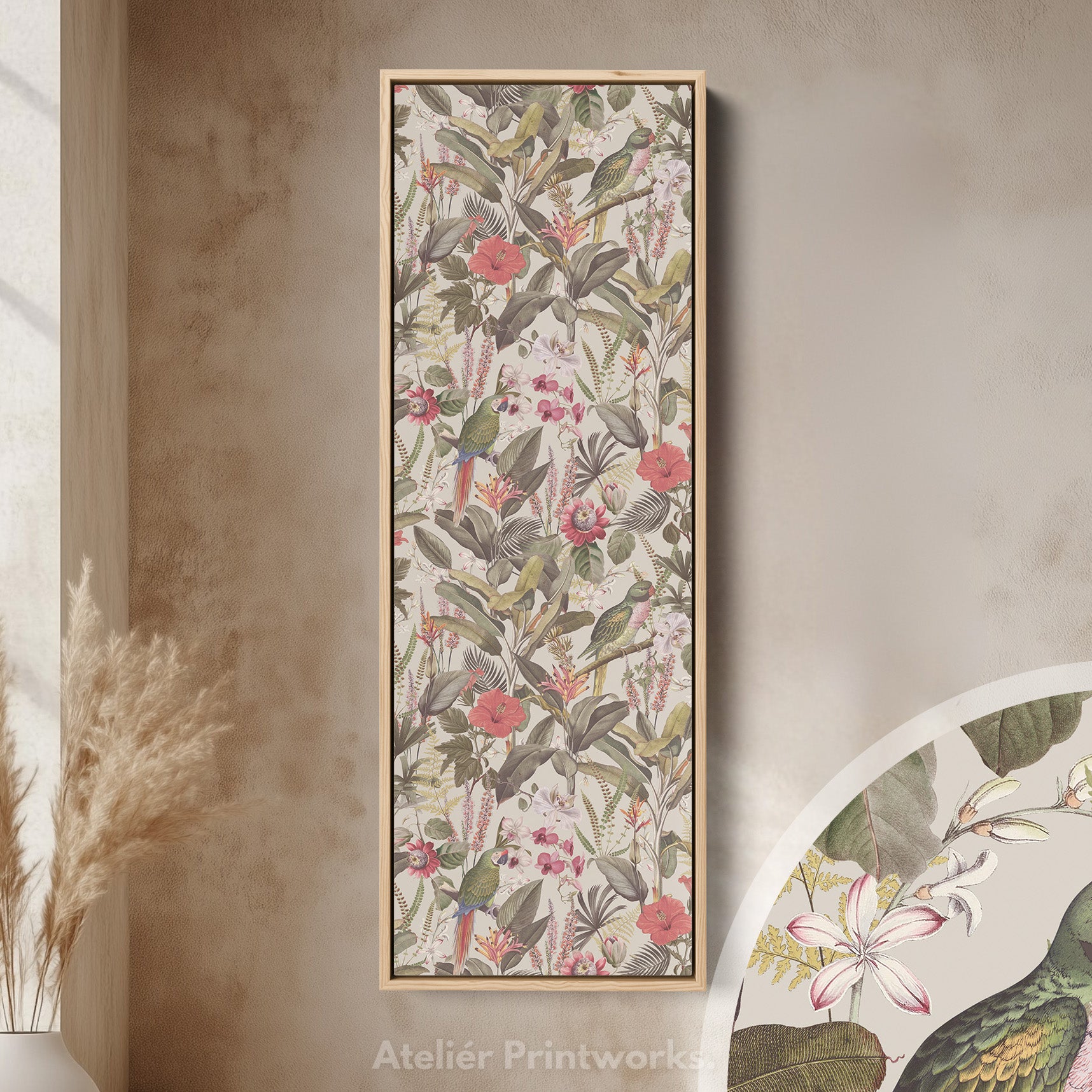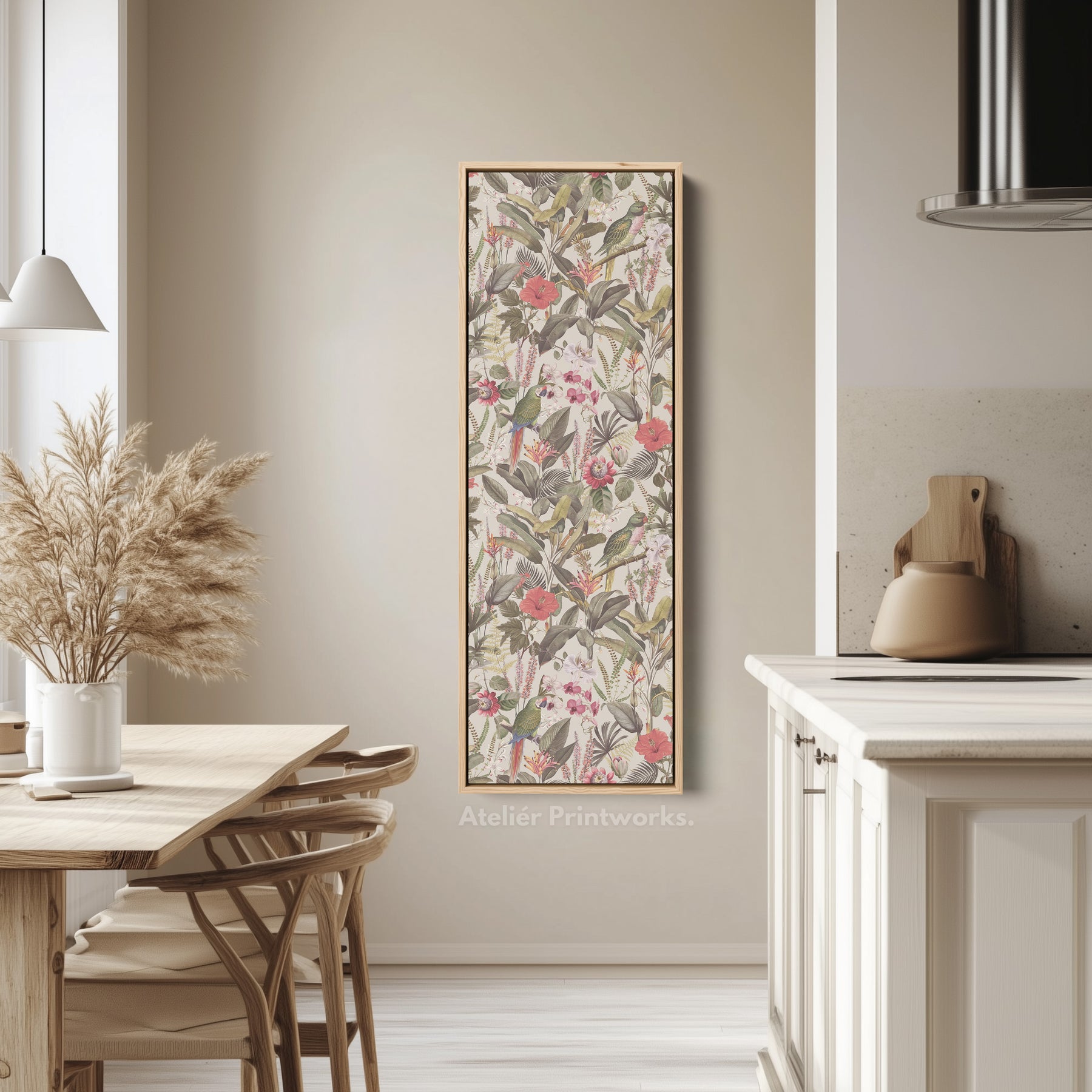 A tropical blend of vibrant florals and parrots adds energy and warmth to any space. This tall canvas wall art enhances narrow areas and creates a lively focal point without taking over the room. Ideal for hallways or statement spaces where vertical framed canvas art draws the eye upward.