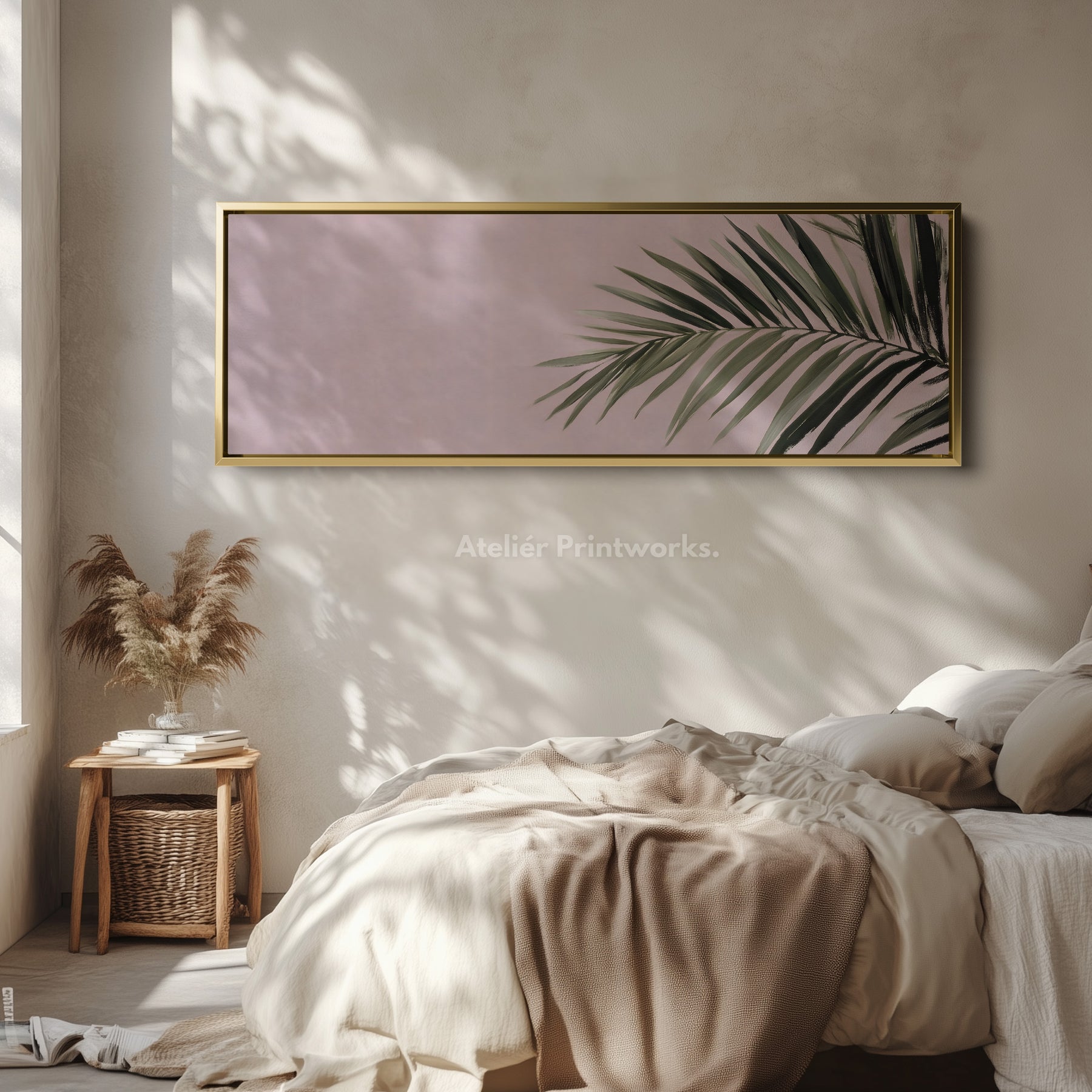 This piece features minimal palm leaf on soft pastel background with soft natural tones. It brings a calm aesthetic and blends well into a variety of interior styles. Ideal placement includes above a sofa, sideboard or bed. The long horizontal format visually expands the wall and creates a focal point. Printed as a framed canvas print and perfect as horizontal wall art, above bed wall art, long canvas, wide canvas or panoramic wall art