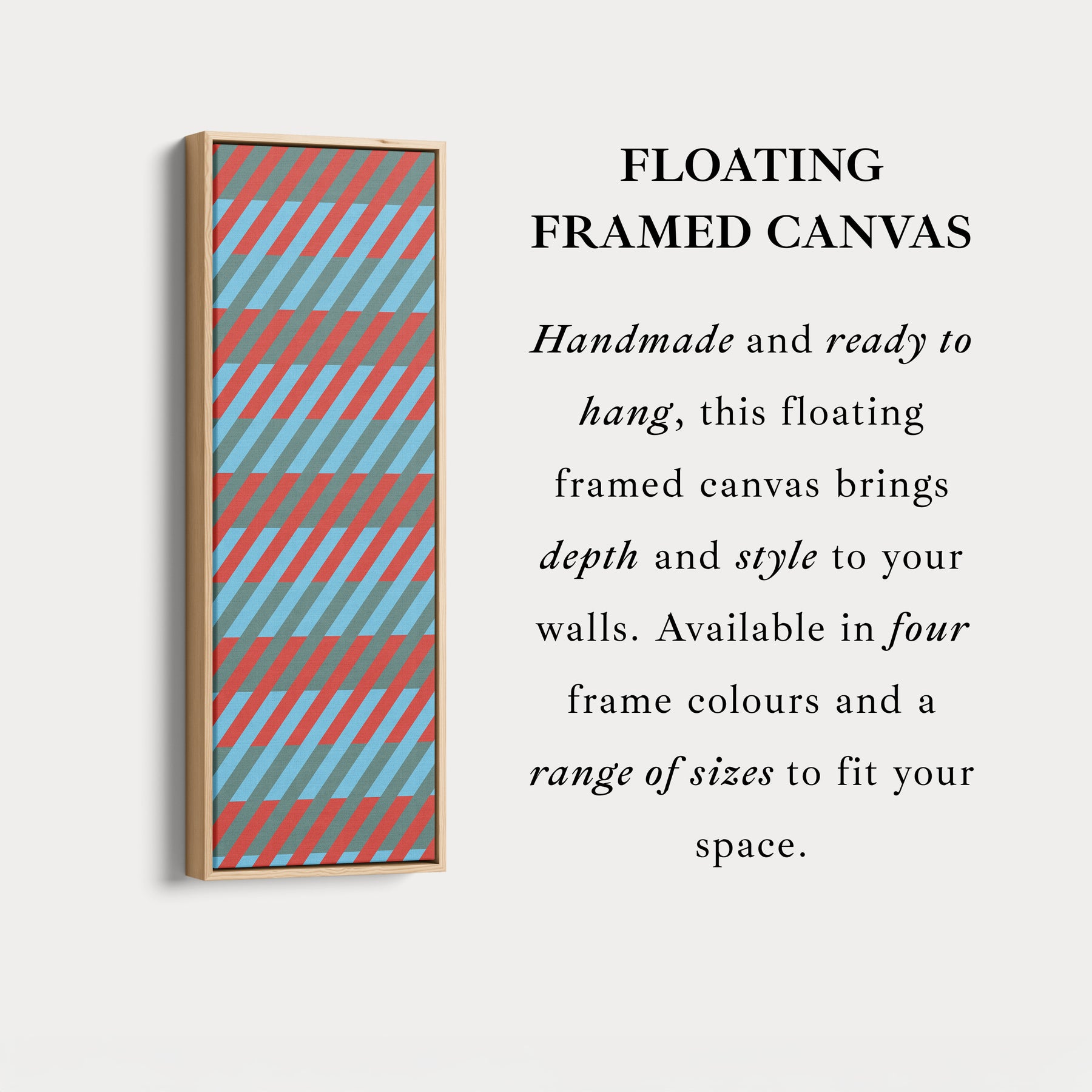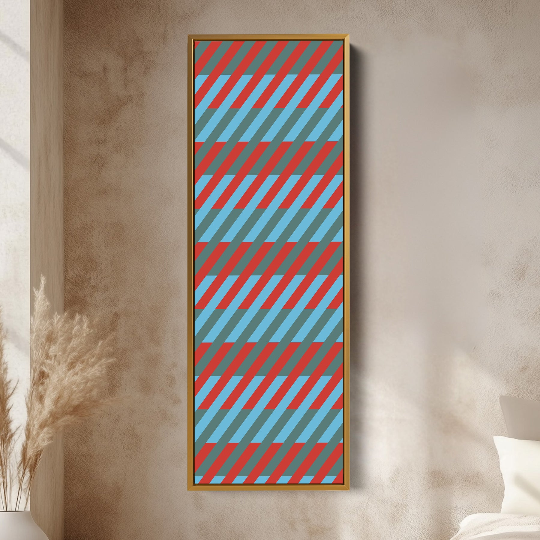 This abstract canvas highlights diagonal stripes in red, blue, and green set against a pale backdrop. A modernist geometric piece with bold contrast and energy. Perfect for bedrooms, studios, or hallways, this framed wall art brings color and structure.