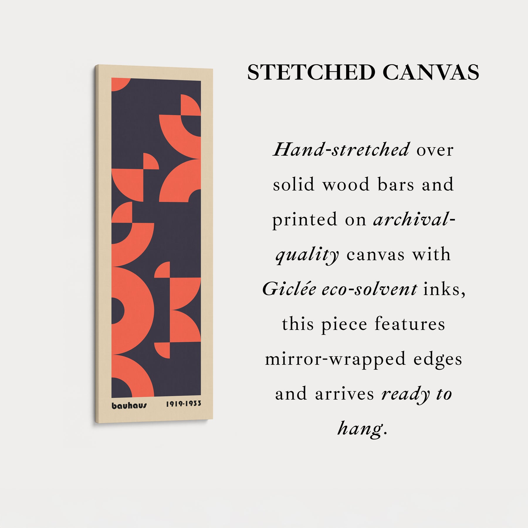 This Bauhaus-inspired framed canvas features repeating half circle arches in blue, cream, and orange on a golden background. Playful and structured retro design. Perfect for bedrooms, studios, or hallways, this vertical wall art adds balance and color.