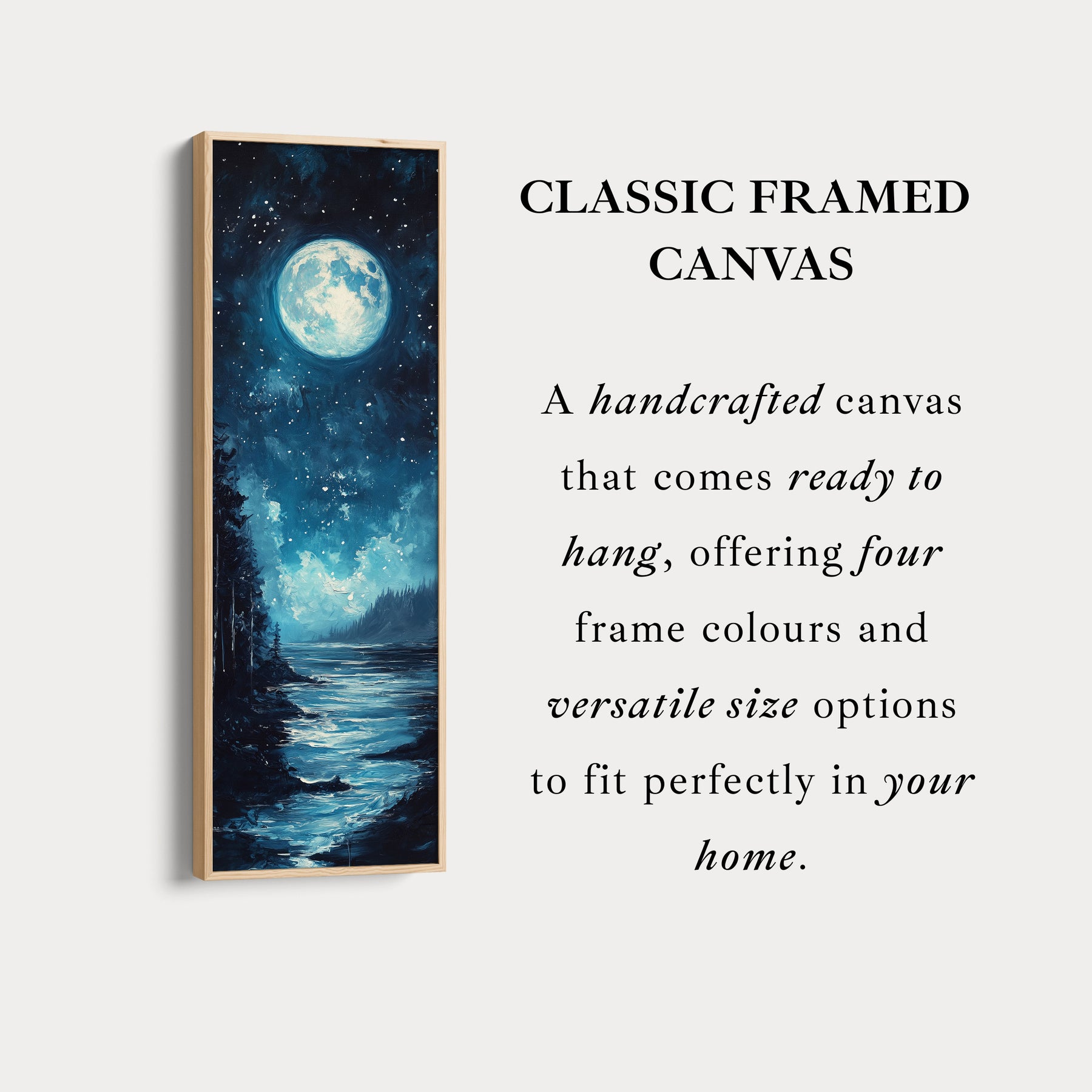 This tall slim wall art features a captivating painting of the moon illuminating a serene night sky over a forest lake. Rendered in stunning blue and white tones, the scene showcases shimmering stars, a glowing reflection on the water, and a tranquil atmosphere. The detailed fantasy illustration style brings the composition to life, creating a magical and calming aesthetic.