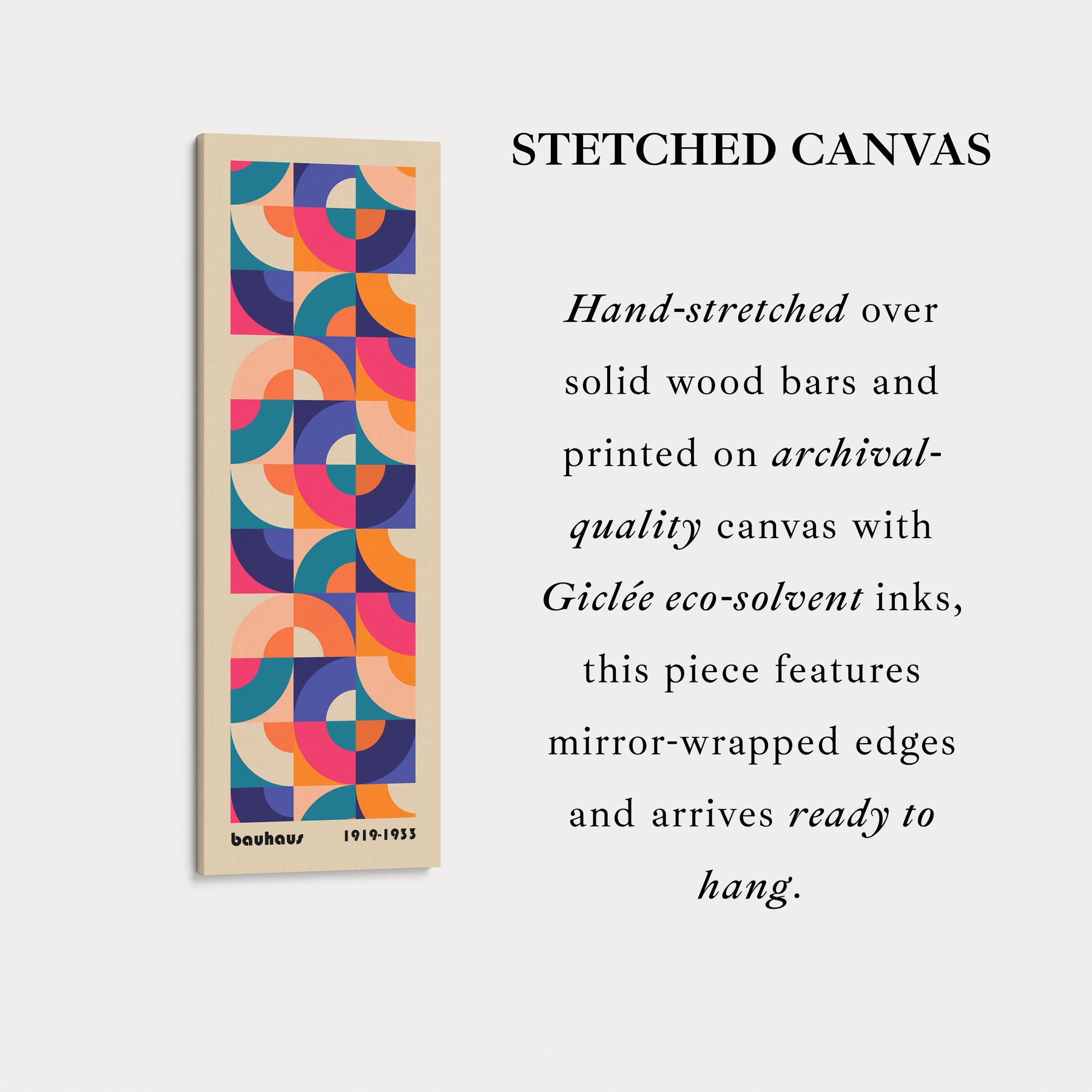 This Bauhaus-inspired design features structured half-circle arches in orange, blue, cream, and teal on a pink background. A balanced geometric composition. Perfect for bedrooms, living rooms, or hallways, this vertical framed canvas brings Bauhaus warmth.