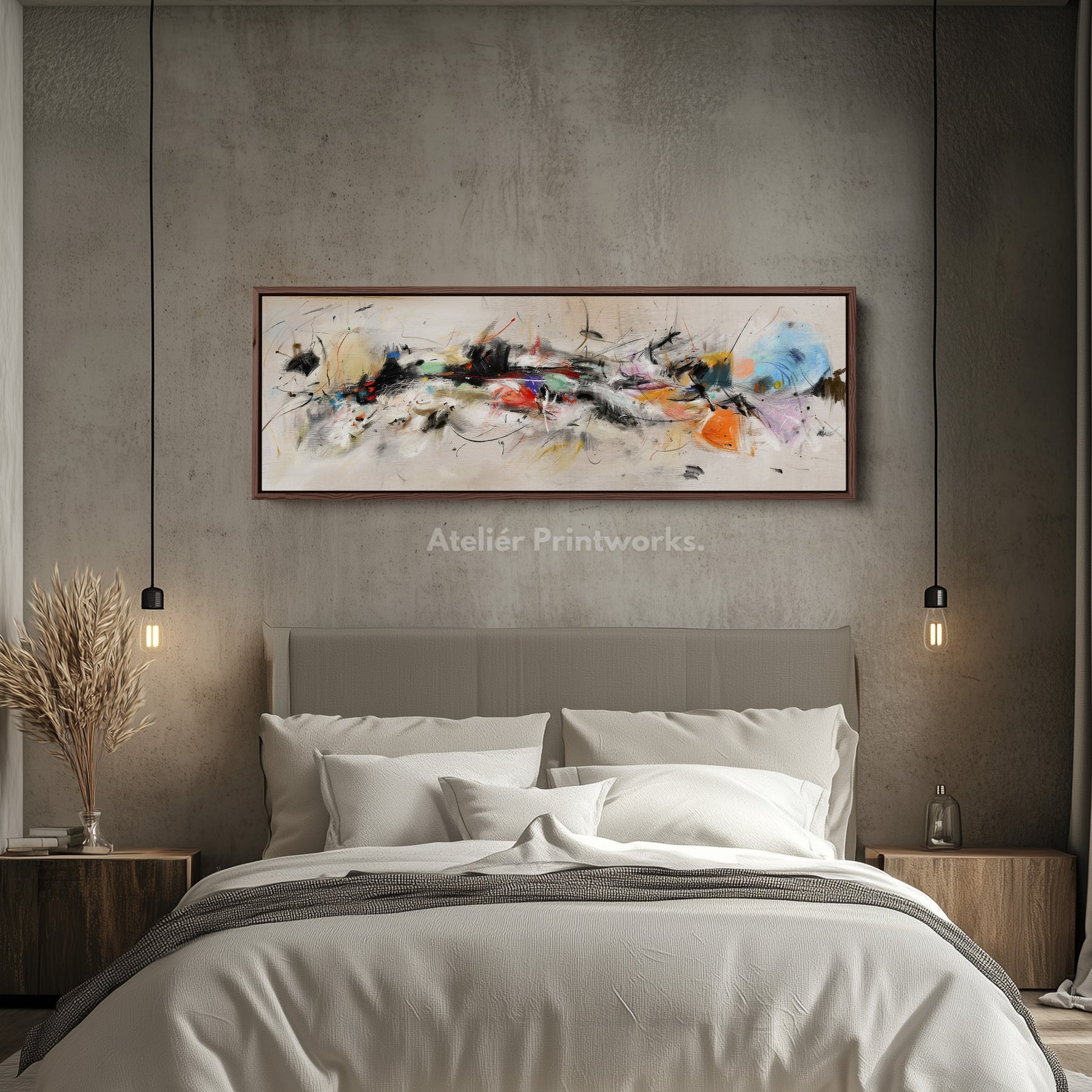 Dynamic abstract marks span the long canvas, mixing beige with pops of orange, blue and black. The composition feels expressive and full of motion. Perfect as above bed wall art or above a sofa, giving a dramatic focal point to the room. Great for contemporary living rooms and interiors seeking modern artistic expression.