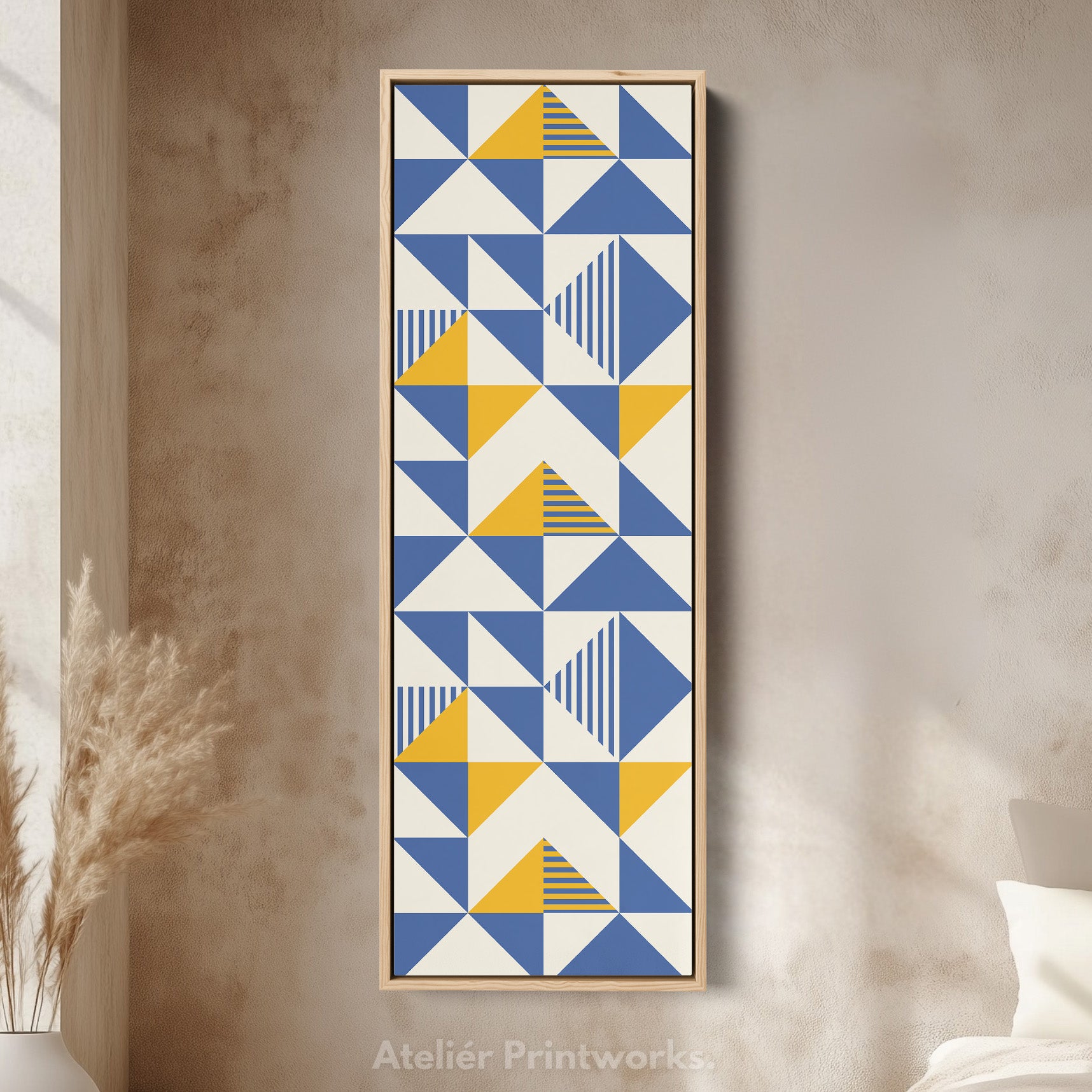 This retro-inspired framed canvas features a repeating triangle grid in blue and mustard yellow with striped accents, creating a playful geometric rhythm. Ideal for bedrooms, hallways, or creative workspaces, this vertical wall art brings bold retro energy to narrow wall spaces.
