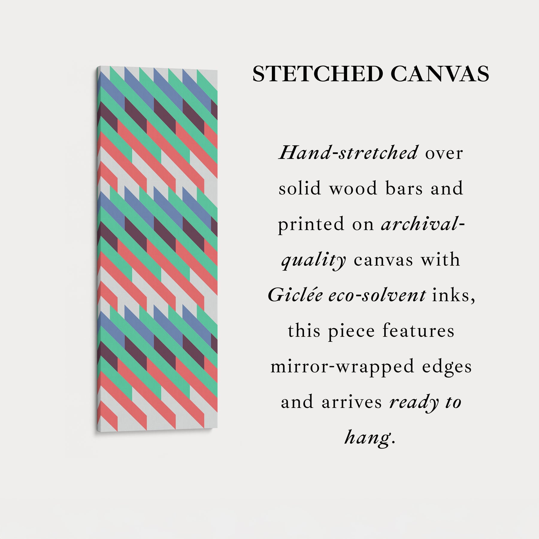 This framed canvas showcases colorful diagonal stripes in red, green, blue, and black across a pale backdrop. The repeating rhythm creates a striking retro-modern feel. Perfect for bedrooms, hallways, or offices, this vertical wall art adds playful structure.