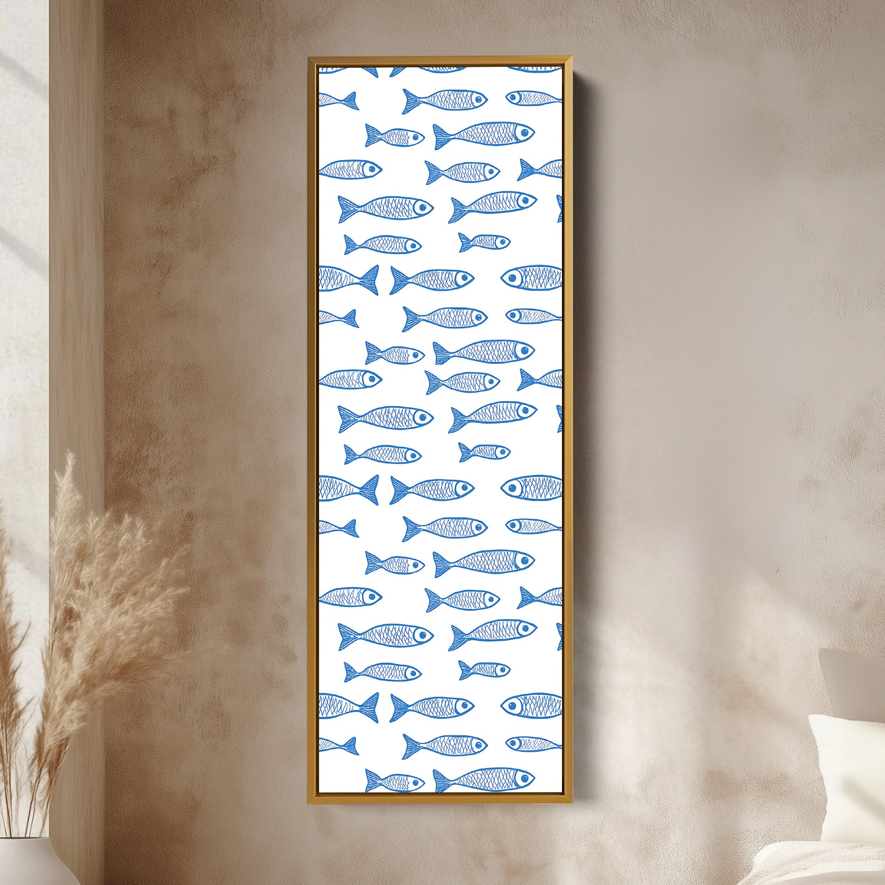 Ideal for vertical wall decor, this pattern brings a refreshing and coastal-inspired touch to tall, narrow spaces such as kitchens, bathrooms, or entryways. As tall narrow wall art, it serves as a playful yet elegant focal point, seamlessly blending with nautical, minimalist, or Scandinavian interiors. The combination of crisp white and classic blue makes this artwork a charming and adaptable addition to any space, perfect for those who appreciate marine-inspired designs with a modern touch.