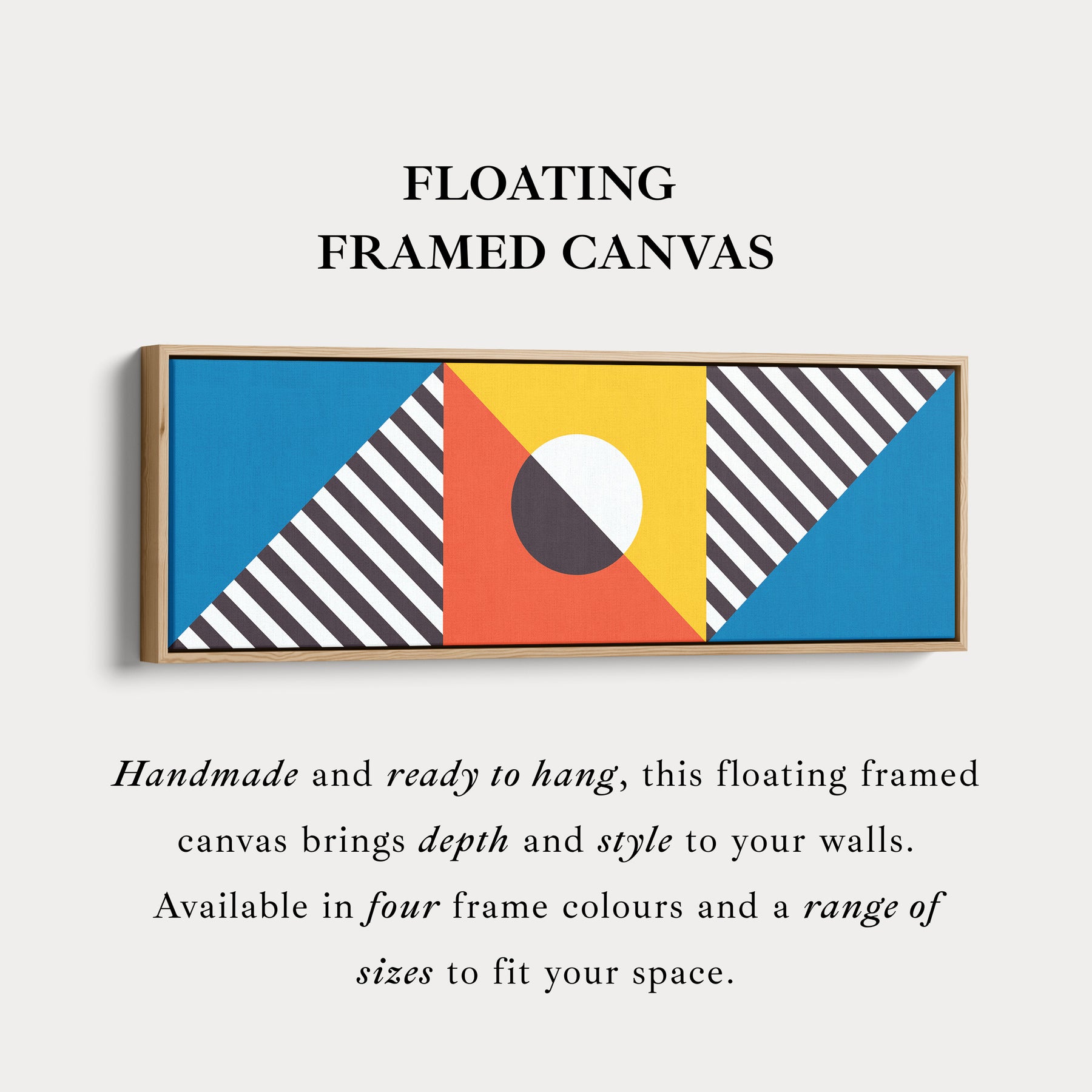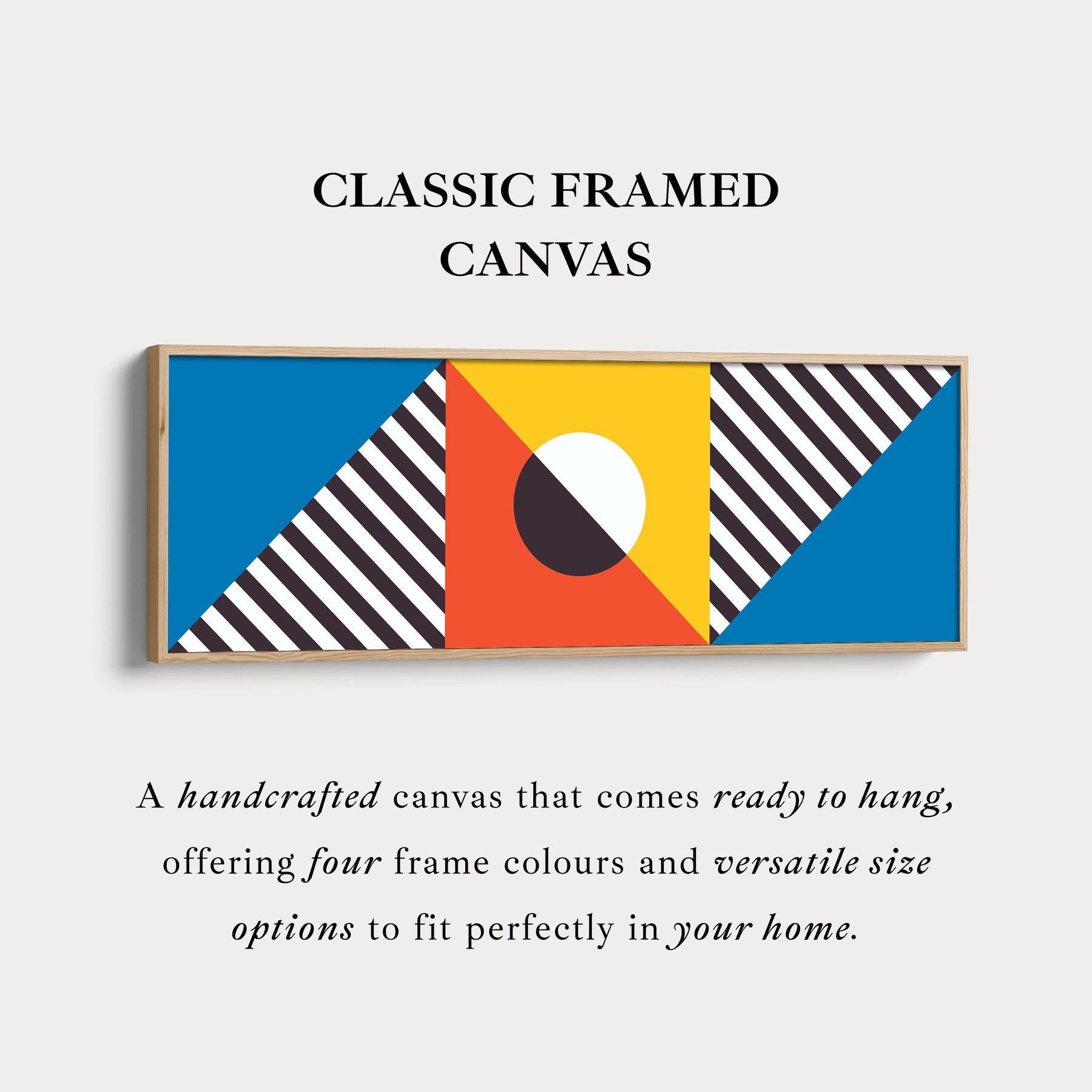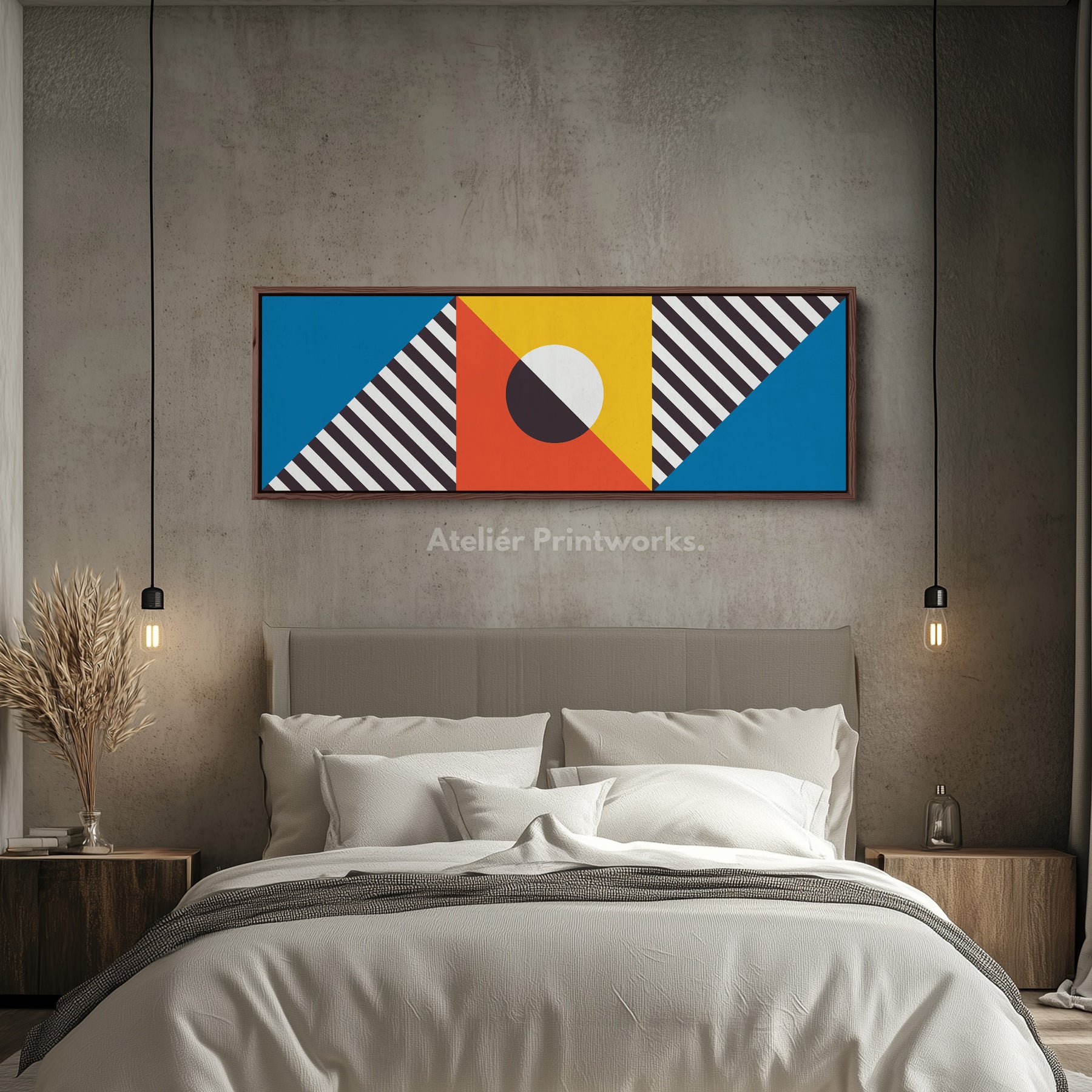 This repeating diagonal pattern mixes green, blue and red in a structured rhythm, perfect for adding energy to large horizontal spaces. The long canvas shape makes it visually striking. Ideal as above bed wall art or hallway art, the repeating forms add movement and balance. A modern and bright piece for contemporary homes.