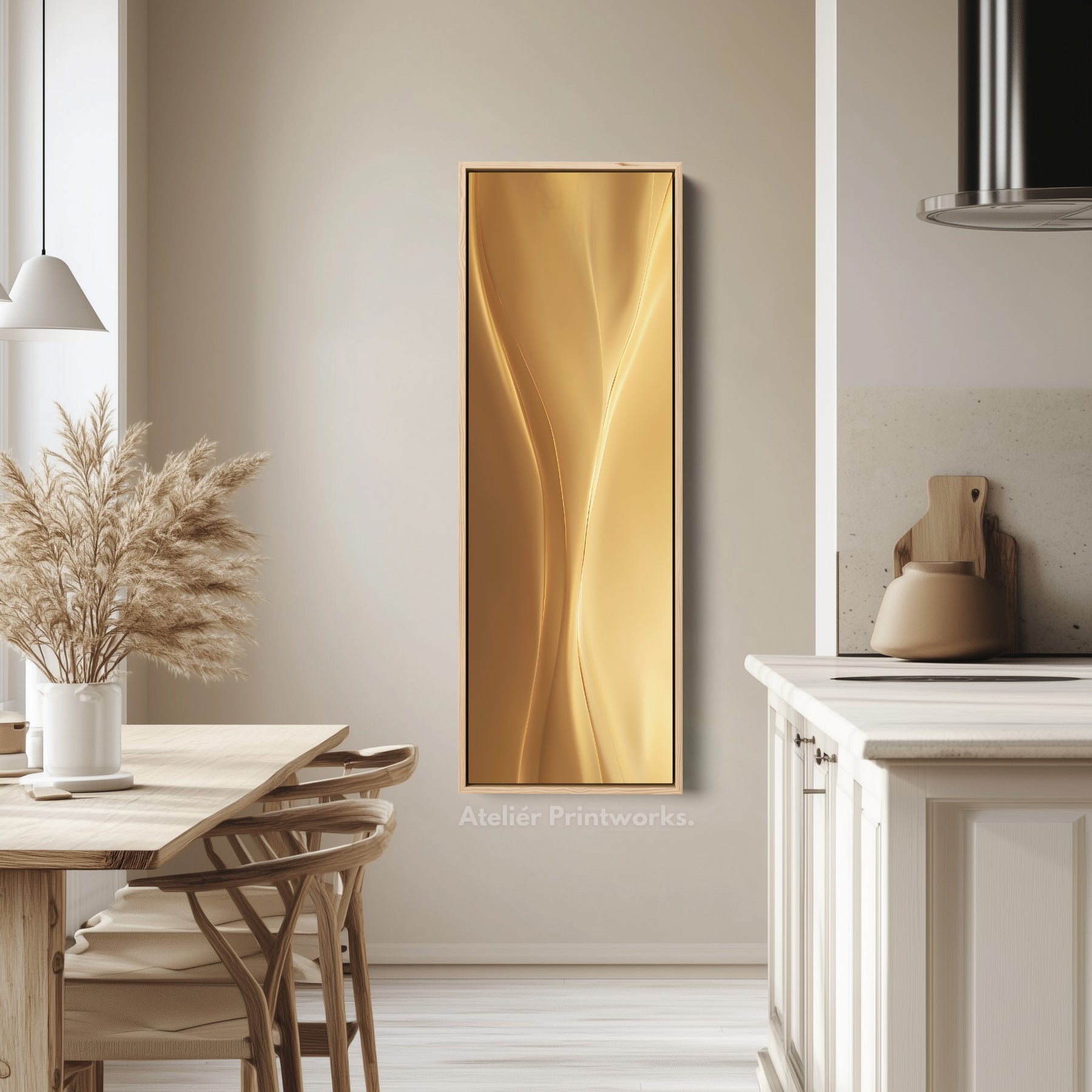 Luxurious golden folds create a soft flowing appearance. This vertical wall art adds warmth and elegance. The tall canvas brings height and works beautifully where narrow wall art elevates the room. Its warm tones pair with modern or classic interiors. Ideal as above console wall art in living rooms where a refined statement piece is needed.