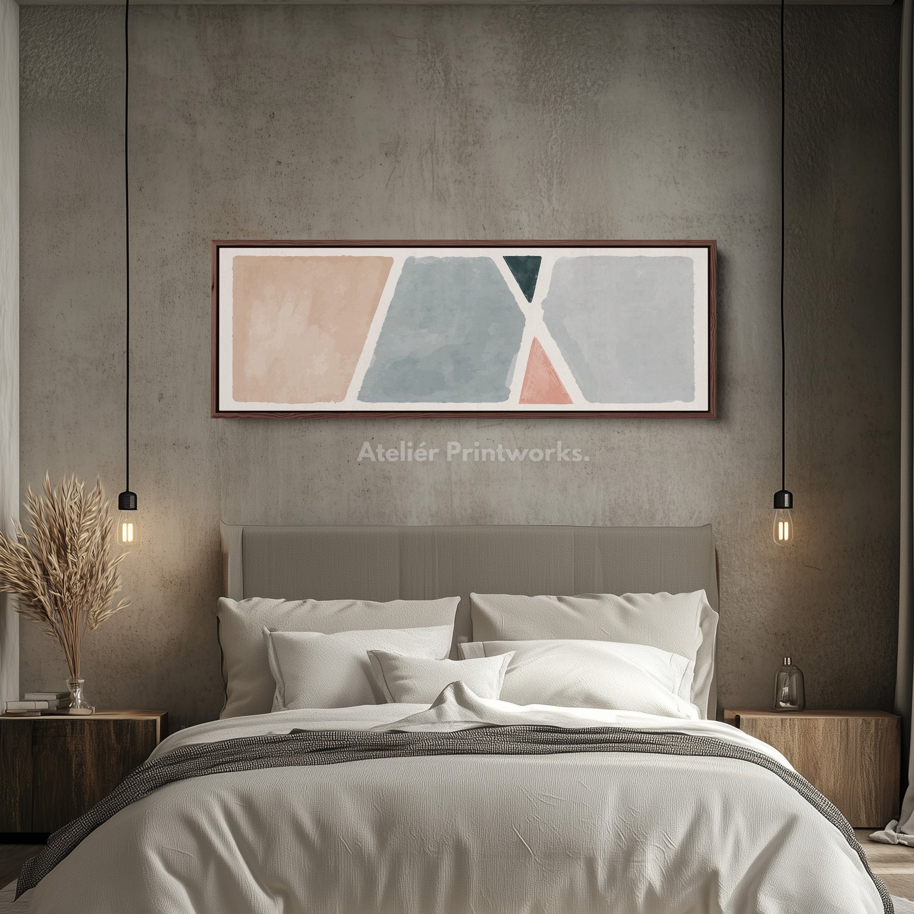 Soft angled blocks in beige and muted grey are paired with a subtle pink accent for a calm clean modern look. The arrangement creates balance without overpowering the room. Ideal as above bed wall art, the long canvas format stretches out across the wall and visually expands the space. This panoramic wall art works equally well across living room furniture. Perfect for minimalist interiors needing a quiet geometric statement in wide wall art proportions.