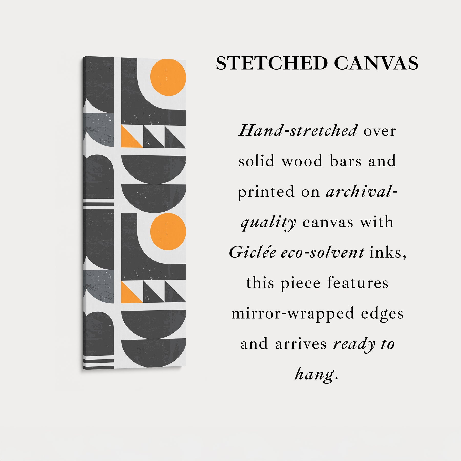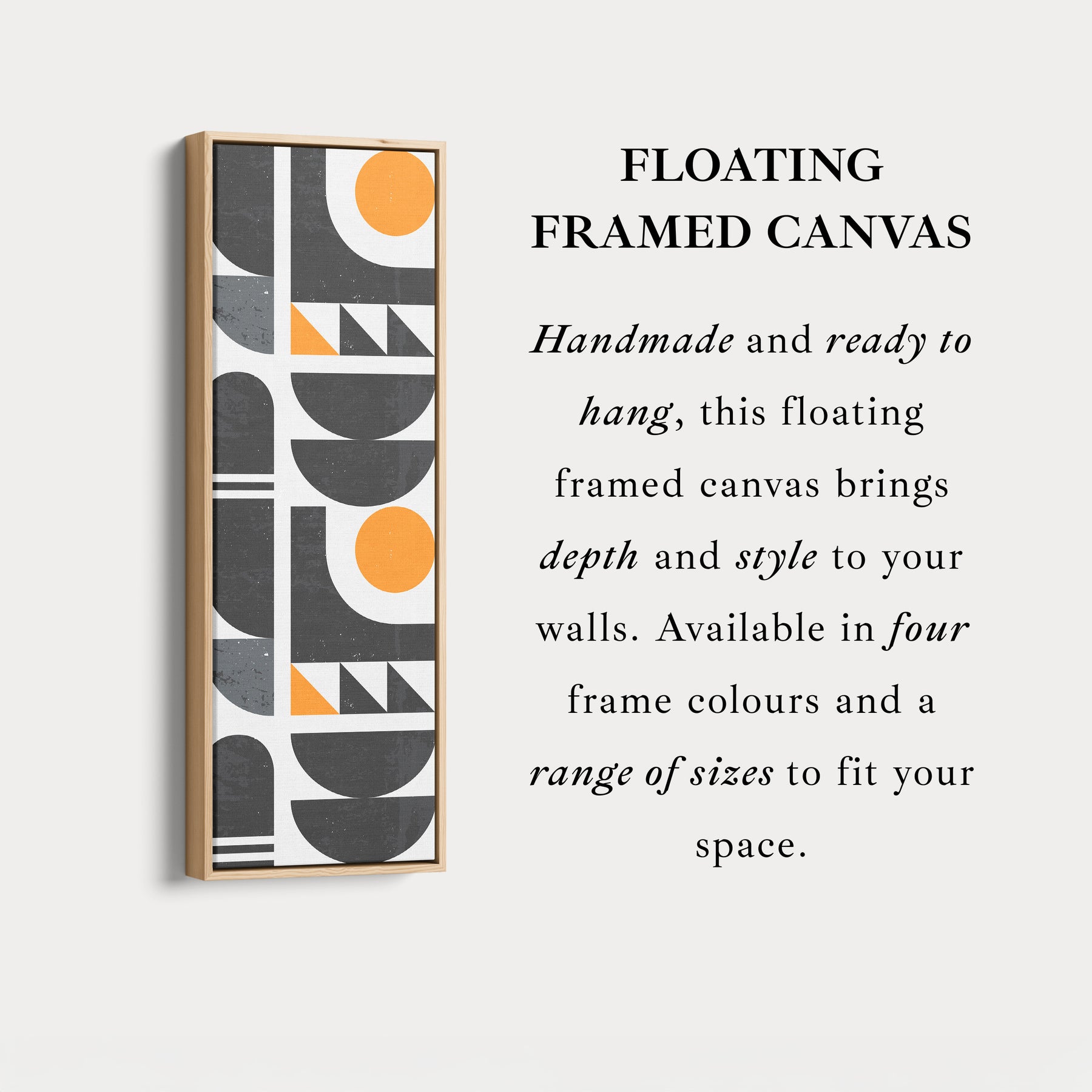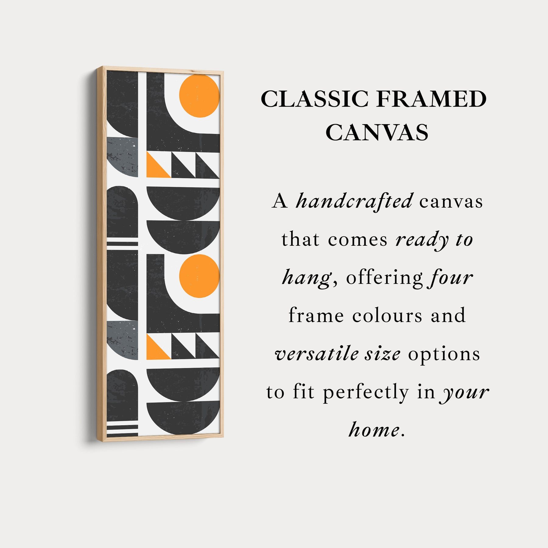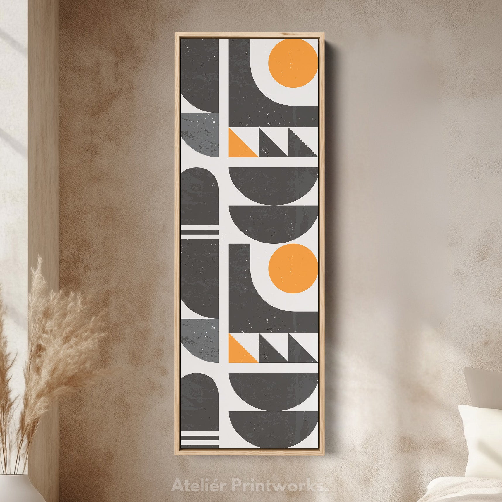 This framed canvas presents a modern geometric design with bright orange circles contrasted by bold black and grey semi-circles and triangles. A striking retro-modern piece in a tall format. Perfect as vertical wall art for offices, studios, or living rooms, it creates a dynamic focal point.
