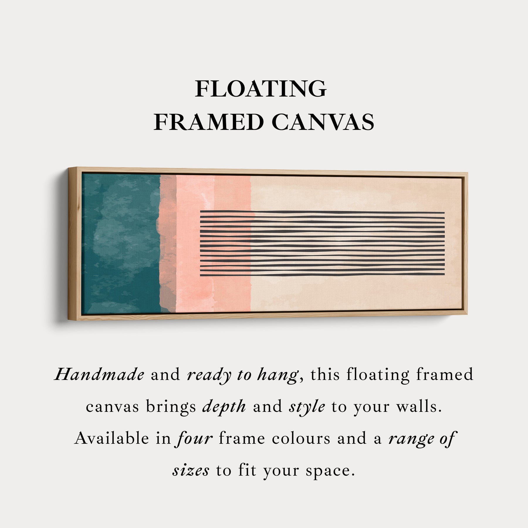 This abstract long canvas blends deep green tones with warm coral stripes and a horizontal field of organic black line details. The contrast of colour feels artistic and expressive without being loud. The horizontal wall art layout makes it ideal above a sofa long sideboard or dining space needing colour and movement. The soft brushy edges give a warm handmade feel. A strong option for wide wall art that adds creativity and shape into a minimalist room.