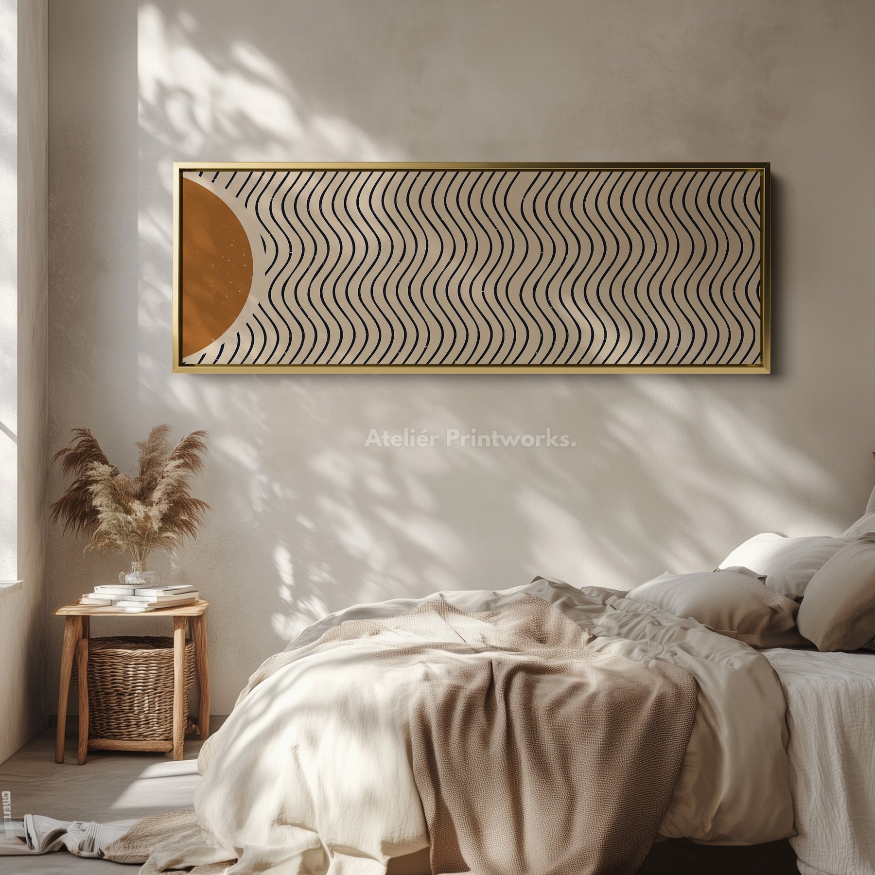 A warm brown circular form paired with flowing black wavy lines creates movement and calm within this long canvas. The brush effects feel modern yet organic. Ideal as above bed wall art or across long walls where soft movement and visual flow are desired. A perfect piece of wide wall art that feels stylish and balanced without overwhelming a space.
