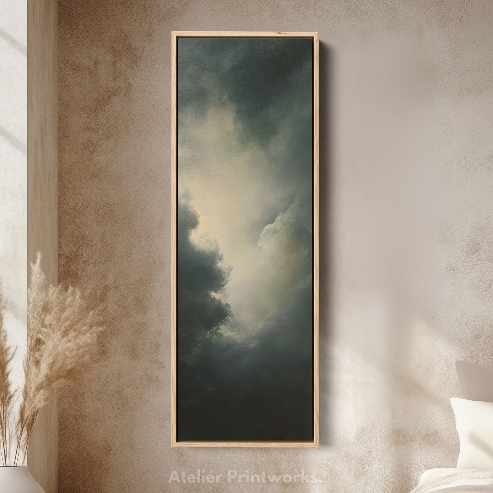Perfect as vertical wall art, this piece beautifully enhances tall, narrow spaces such as beside doorways or in cozy nooks. Its atmospheric design makes it an excellent choice for long vertical abstract wall art, adding depth and intrigue to hallways, offices, or entryways. For compact areas, it works wonderfully as thin wall art, offering a refined and dramatic accent to smaller spaces. This artwork complements modern, minimalist, and nature-inspired interiors, bringing the awe of a stormy twilight sky into your home.