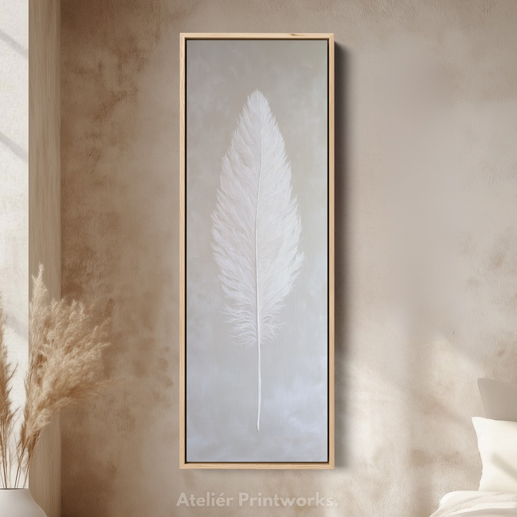 This piece is perfect as long wall art, adding sophistication to expansive spaces such as hallways or living rooms. As vertical wall art, it creates an eye-catching focal point in narrow spaces or entryways. For large wall decor, the feather’s minimalistic elegance complements modern, rustic, or minimalist interiors, bringing a sense of tranquility and refined charm. This painting celebrates the quiet beauty of nature, designed to inspire peace and simplicity in your home.