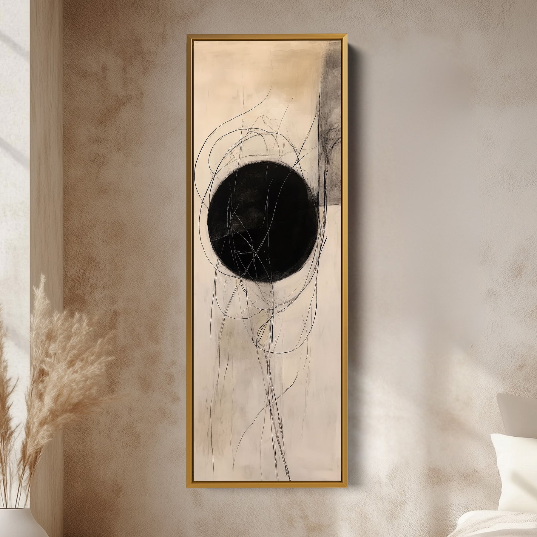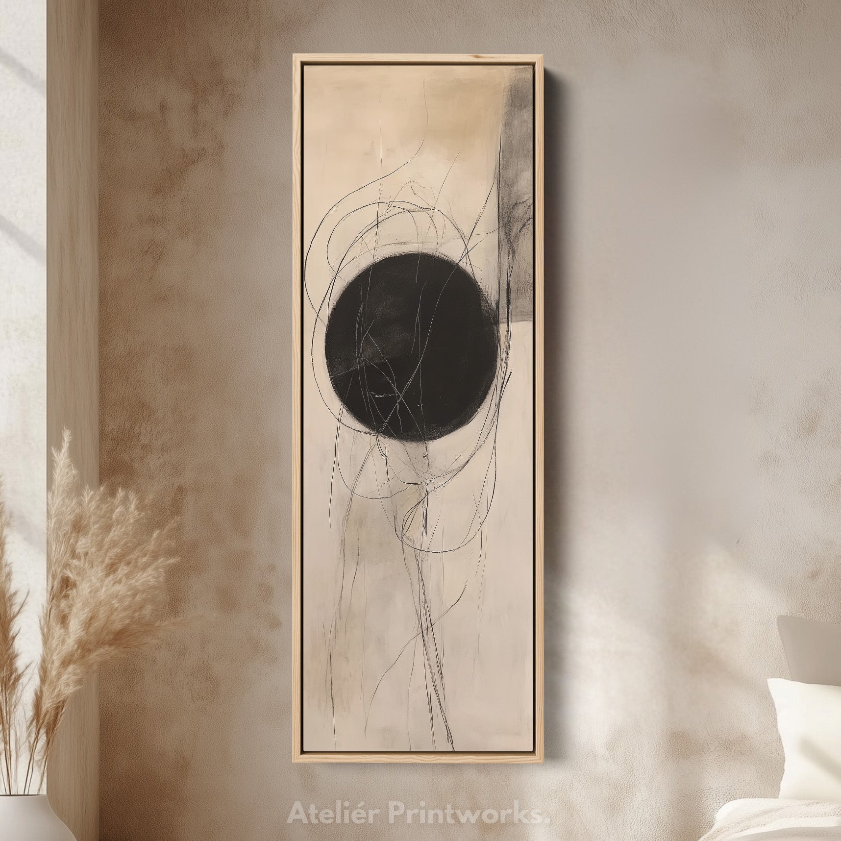 This tall slim wall art features a minimalist black and white oil painting of an abstract floating dark hole, set against a textured beige paper background. Thin, long lines complement the composition, adding balance and elegance to the design. The understated palette and simple forms create a modern and contemplative aesthetic, making it a sophisticated addition to any space.
