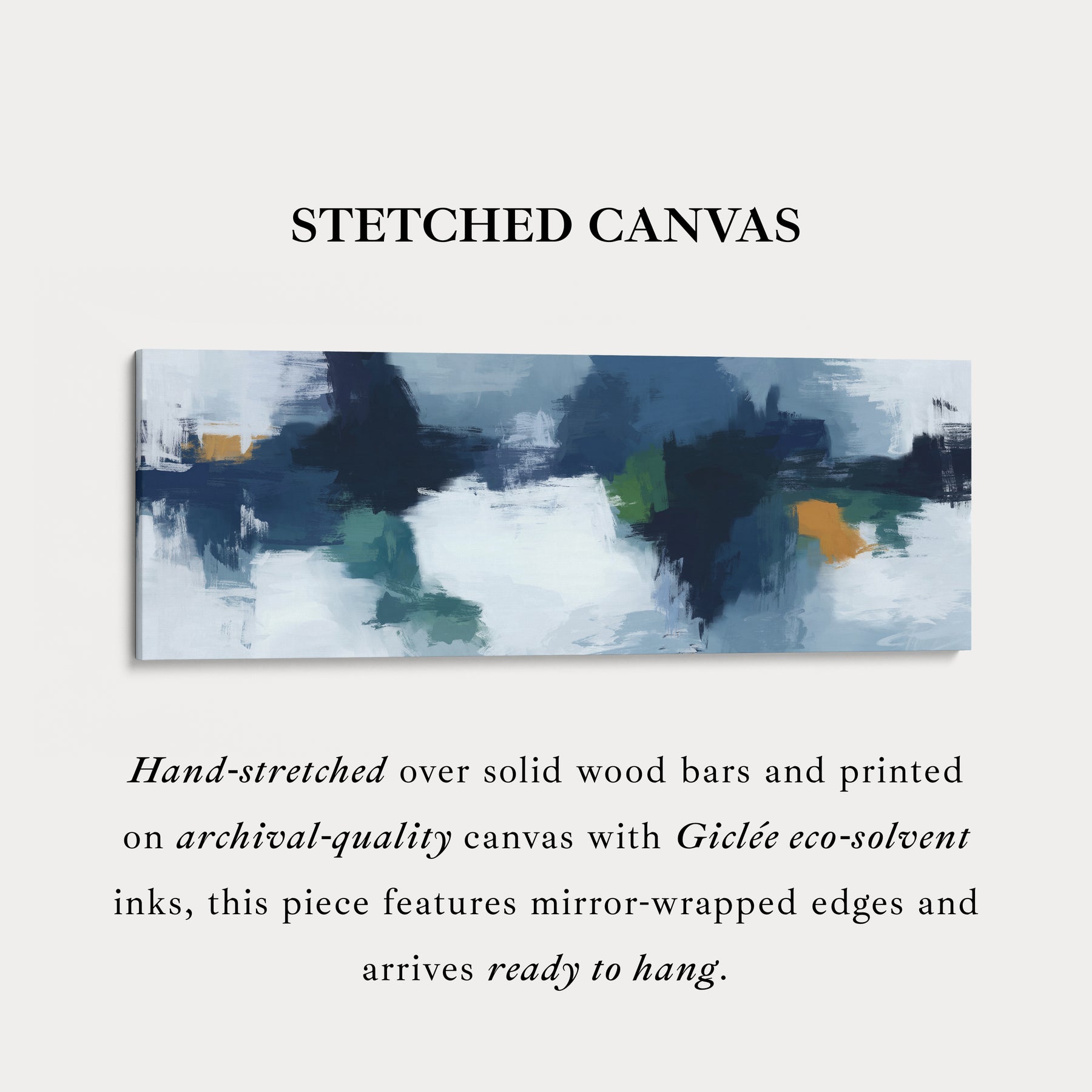 A bold abstract artwork with layered brushstrokes in navy, deep blue, and green accents. The contrast between dark tones and lighter whites gives the artwork depth and visual movement. Best placed in a modern living room above a sofa or console table, adding drama and sophistication. The horizontal composition helps visually widen the space. Perfect for contemporary interiors and works naturally as horizontal wall art, panoramic wall art, wide canvas or framed canvas print.