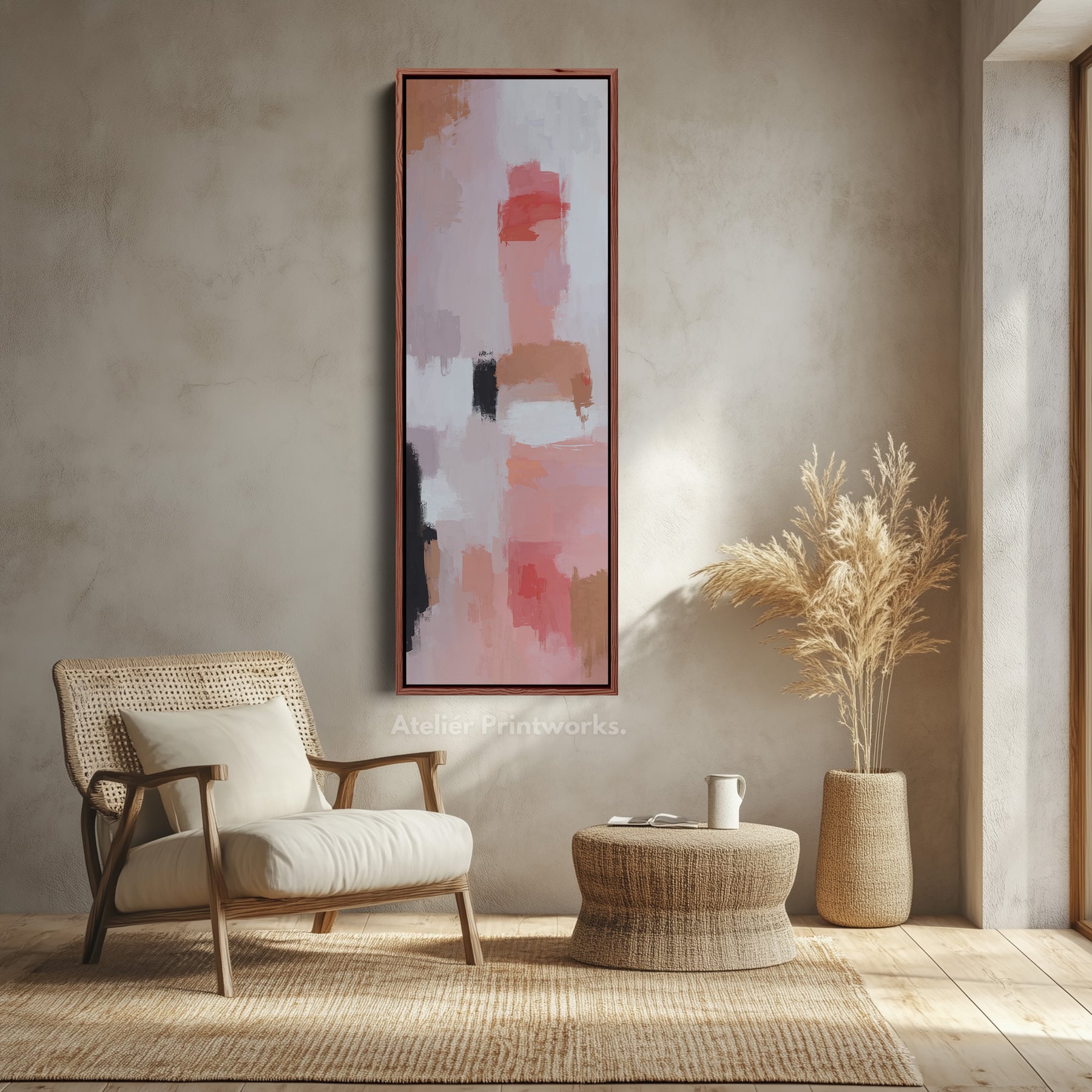 A modern abstract composition blending muted pinks, soft browns and subtle red accents creates a striking yet sophisticated vertical wall art piece. The tall canvas layout brings structure to open spaces. This narrow wall art works beautifully above a console wall art area, adding warmth without dominating a room. The skinny wall art format keeps it visually light and contemporary. Ideal for living rooms, hallways or bedrooms where subtle colour adds interest, this tall modern abstract wall art fits effortlessly with minimalist or Scandinavian décor.