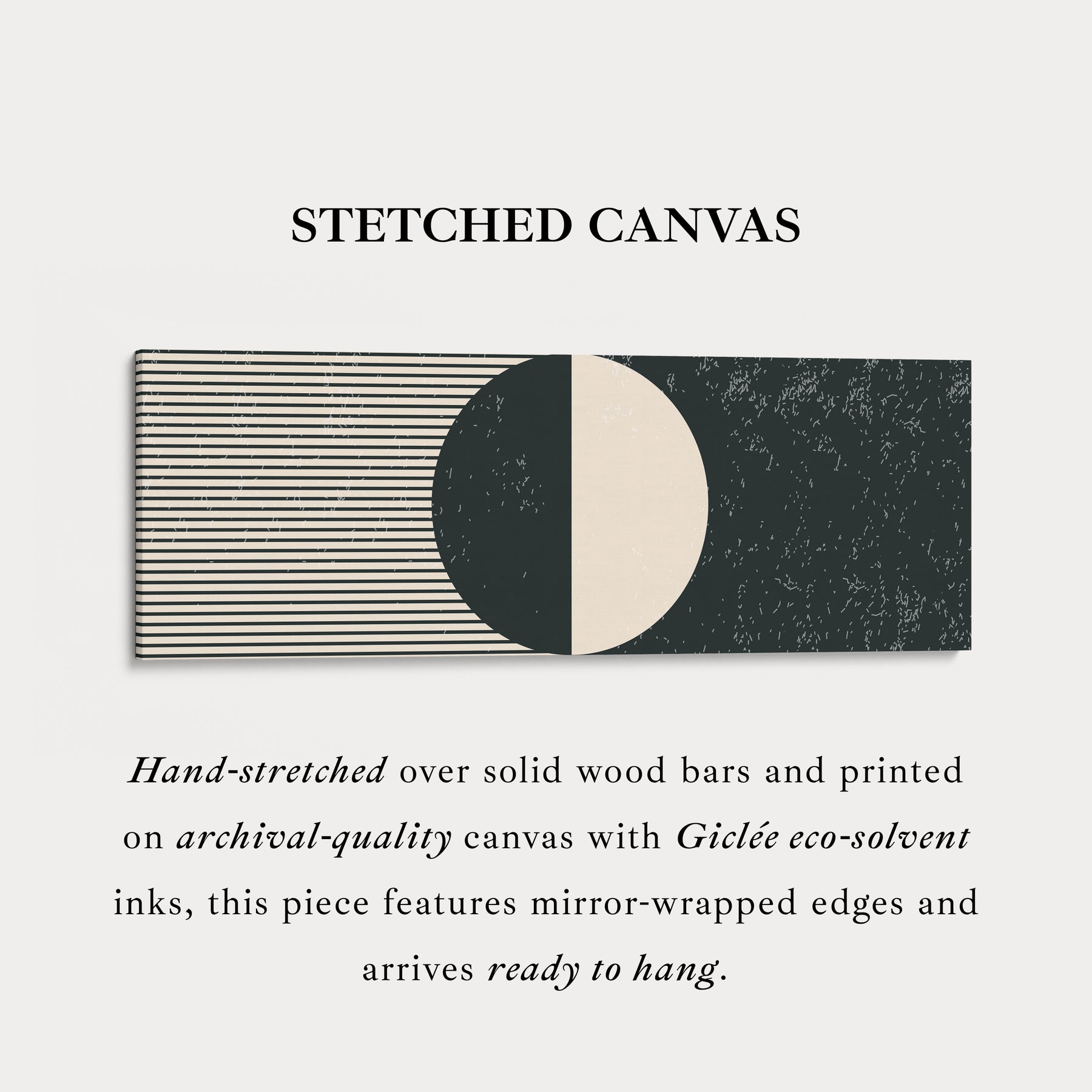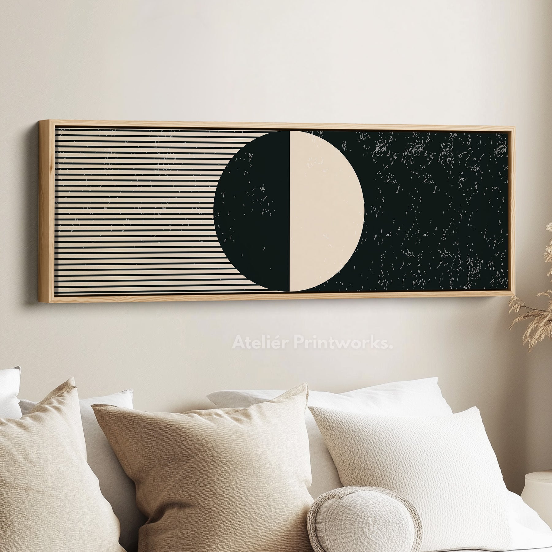 This horizontal wall art features a bold beige circle against a deep black background, balanced with horizontal beige linework extending from the center. The minimalist contrast gives the piece a calm yet structured presence, ideal for contemporary interiors. Perfect as above bed wall art or to fill a long wall space in a hallway or living room as wide wall art.