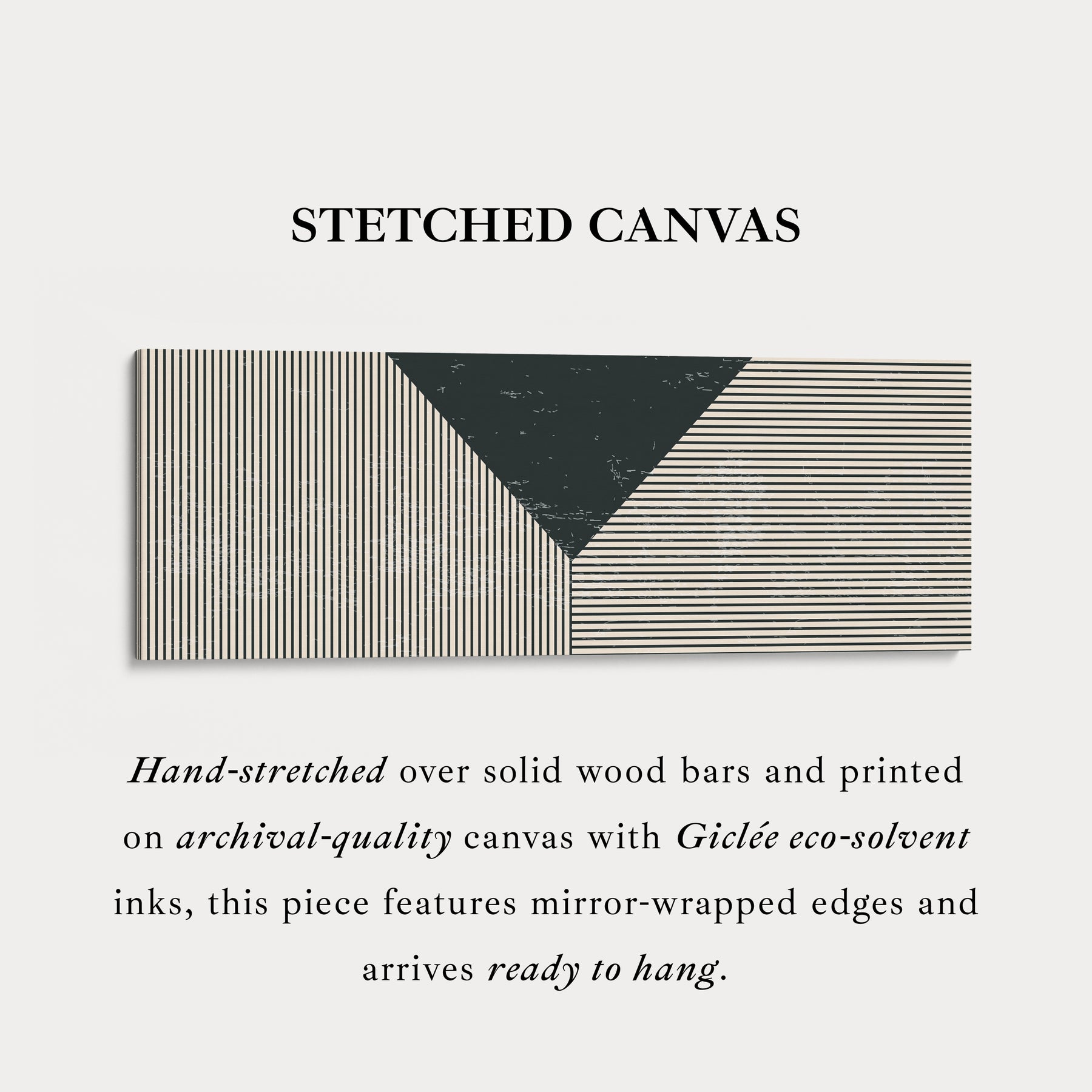 A diagonal black shape meets thin horizontal linework across a beige background, forming a dramatic geometric composition. The contrast gives structure without overwhelming a space. Ideal for modern hallways, office spaces, or above a console table as panoramic wall art.