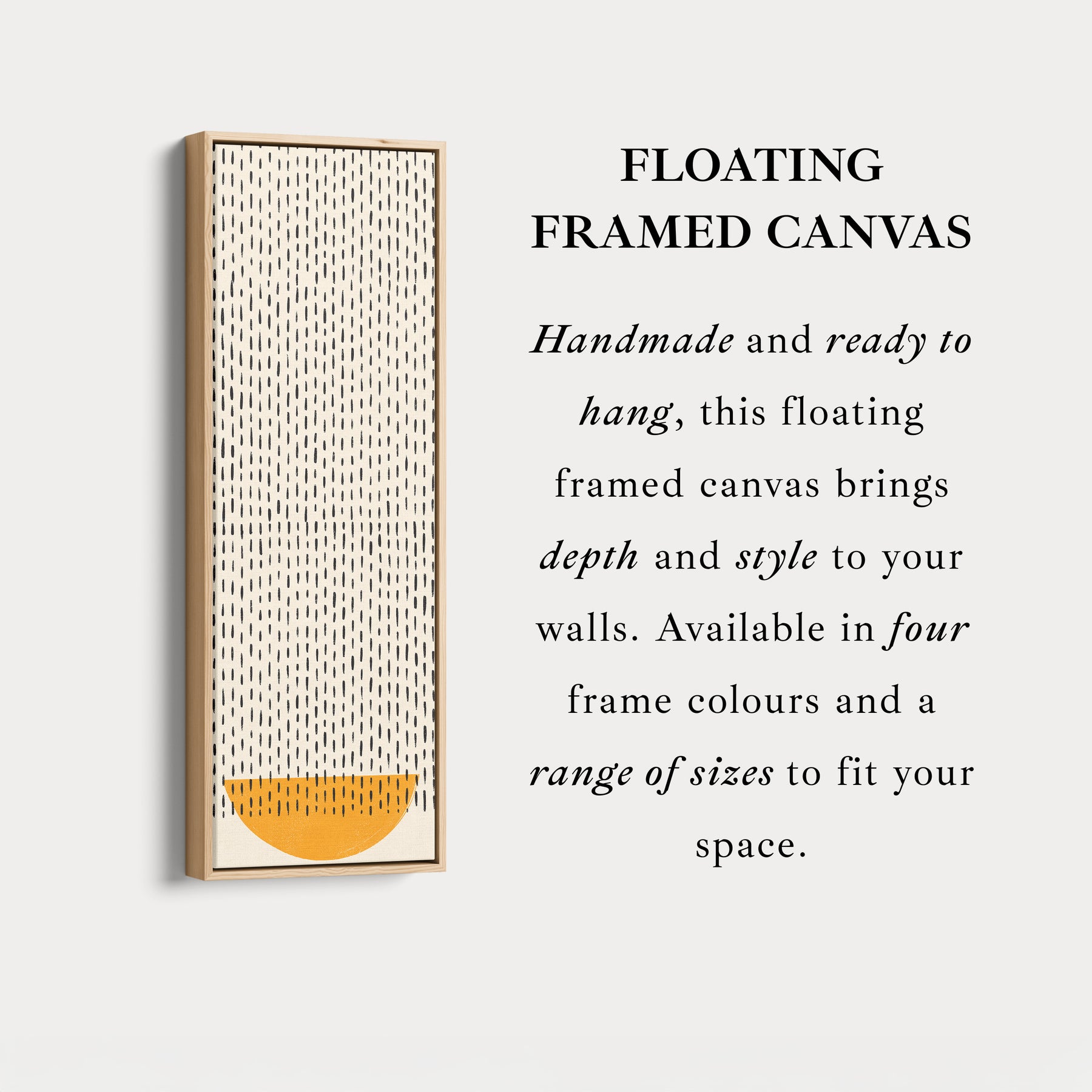 This minimalist framed canvas features scattered black brush dots cascading above a bold orange half-circle base. The clean composition creates balance between playfulness and structure. Ideal as tall narrow wall art for hallways, bedrooms, or offices, this piece brings modern energy into any space.