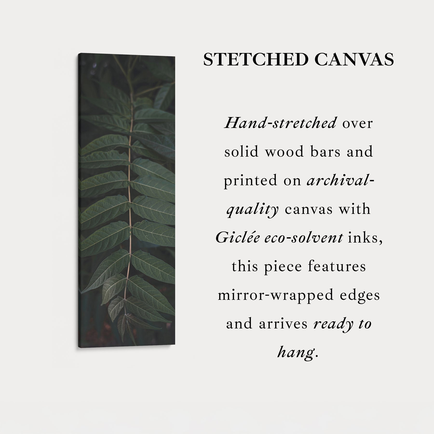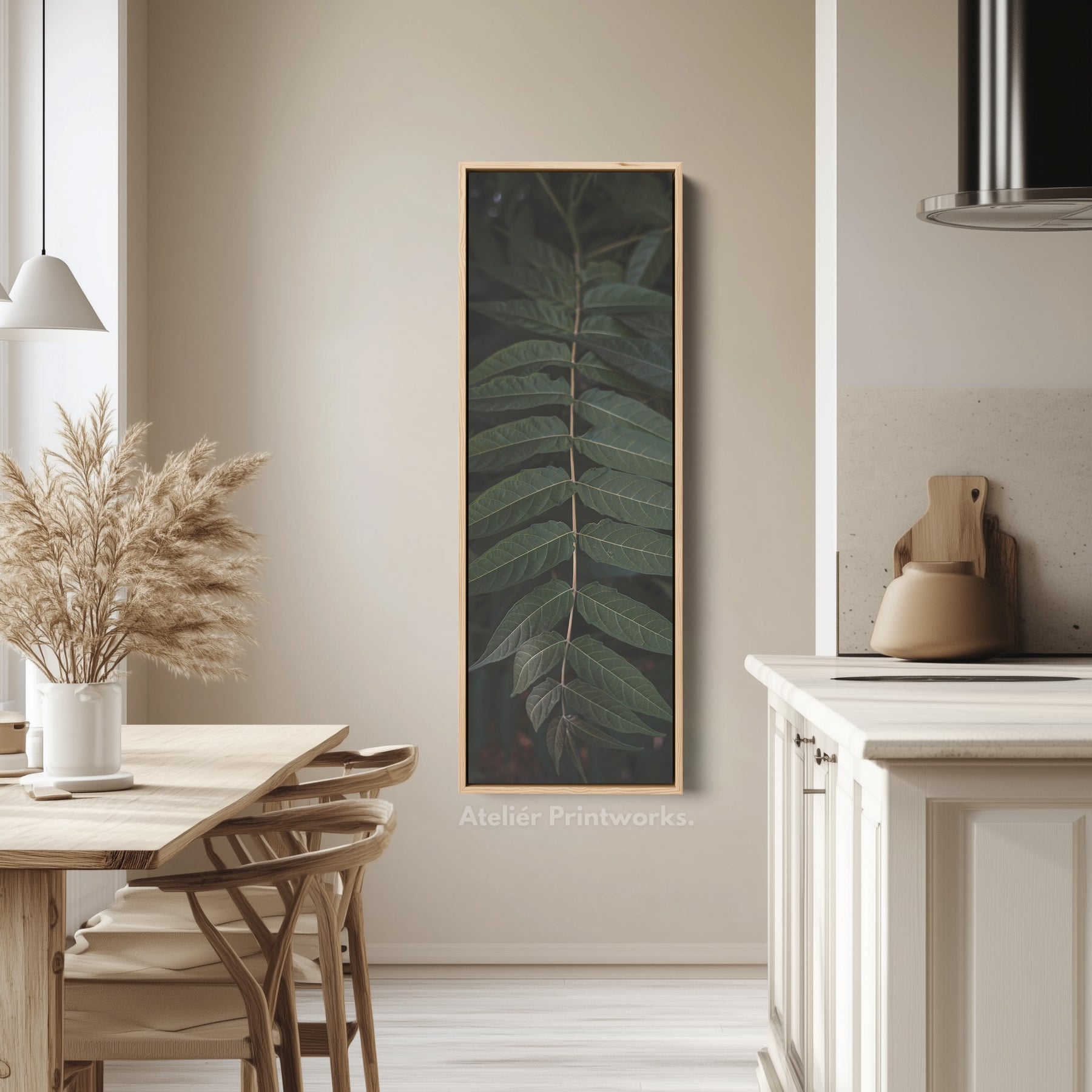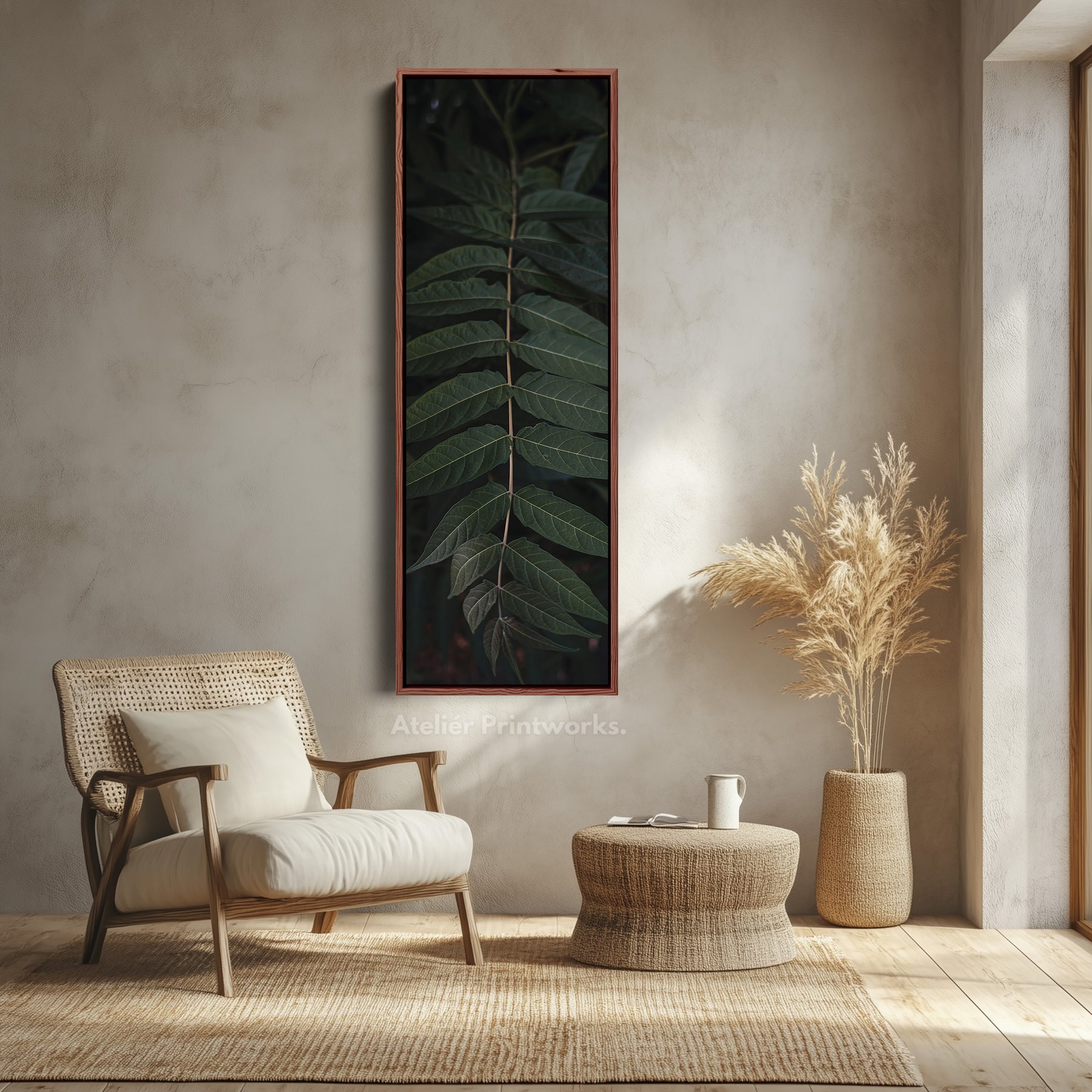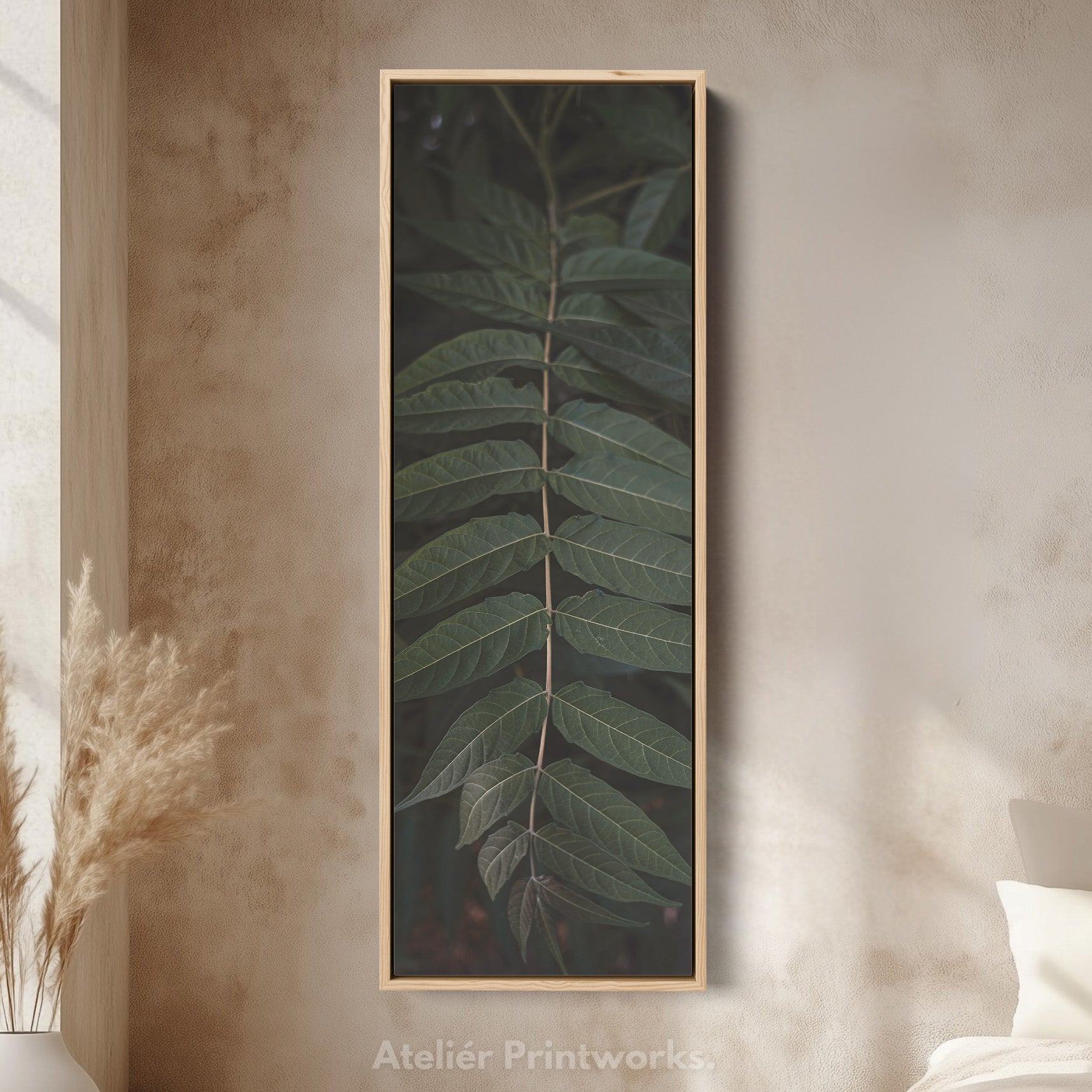 Deep green leaves on a dark background create a modern natural look that blends seamlessly with contemporary interiors. This tall canvas wall art fits beautifully in narrow wall spaces and adds organic calm to the room. Perfect as hallway wall art vertical or to style beside bookshelves.