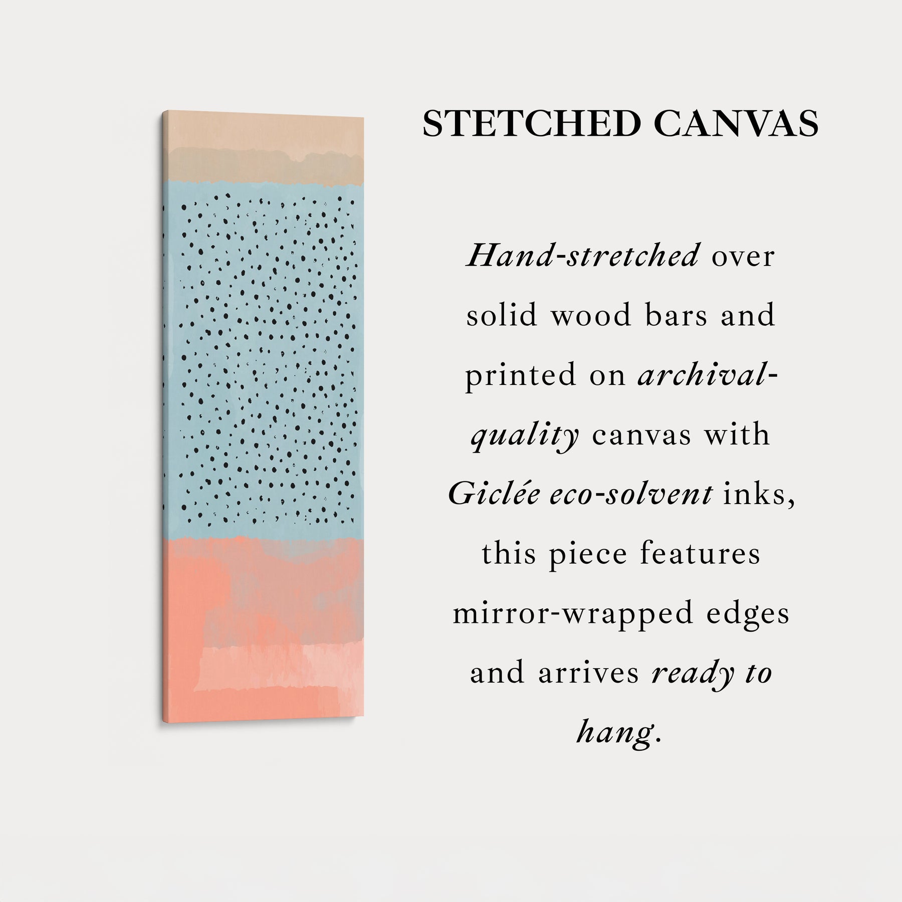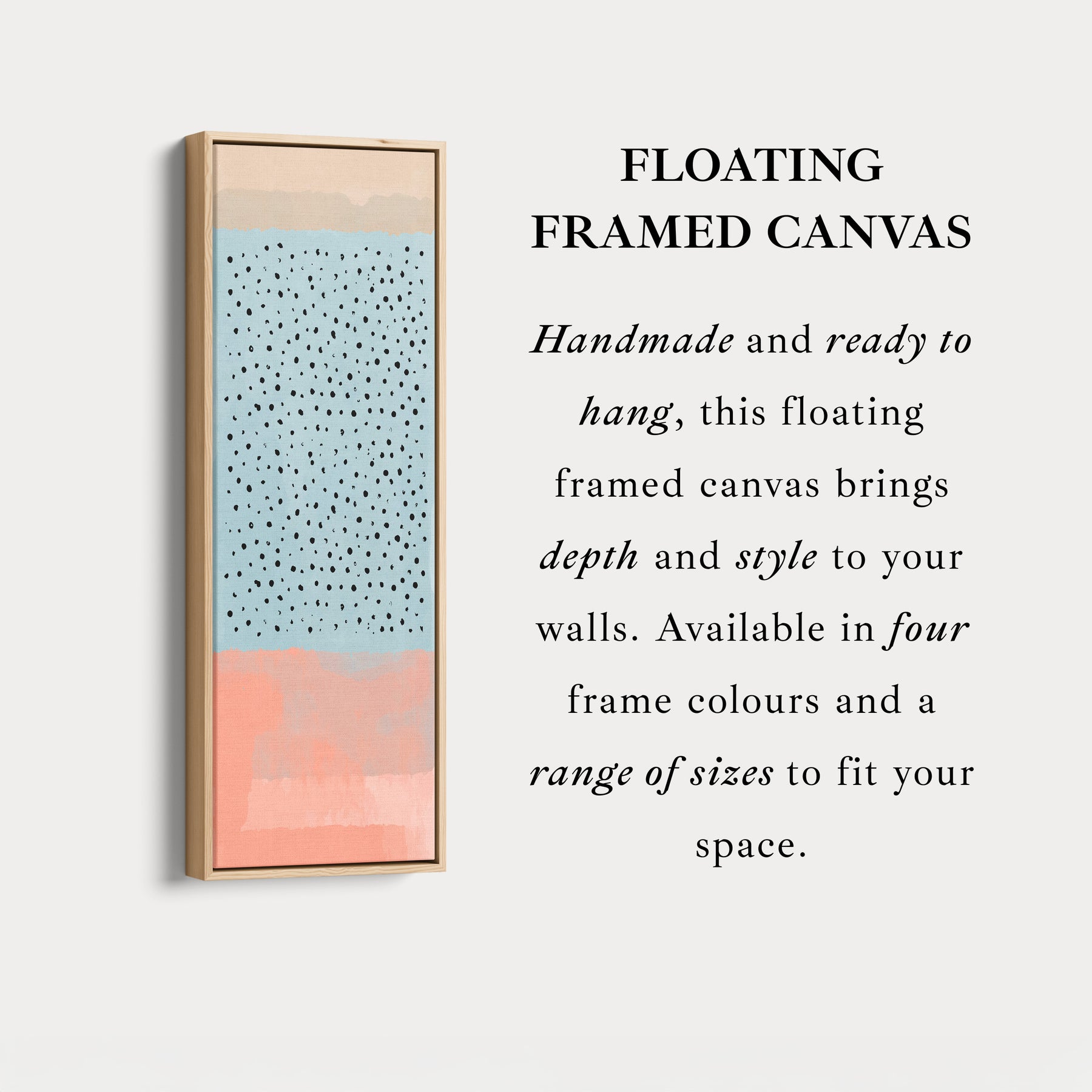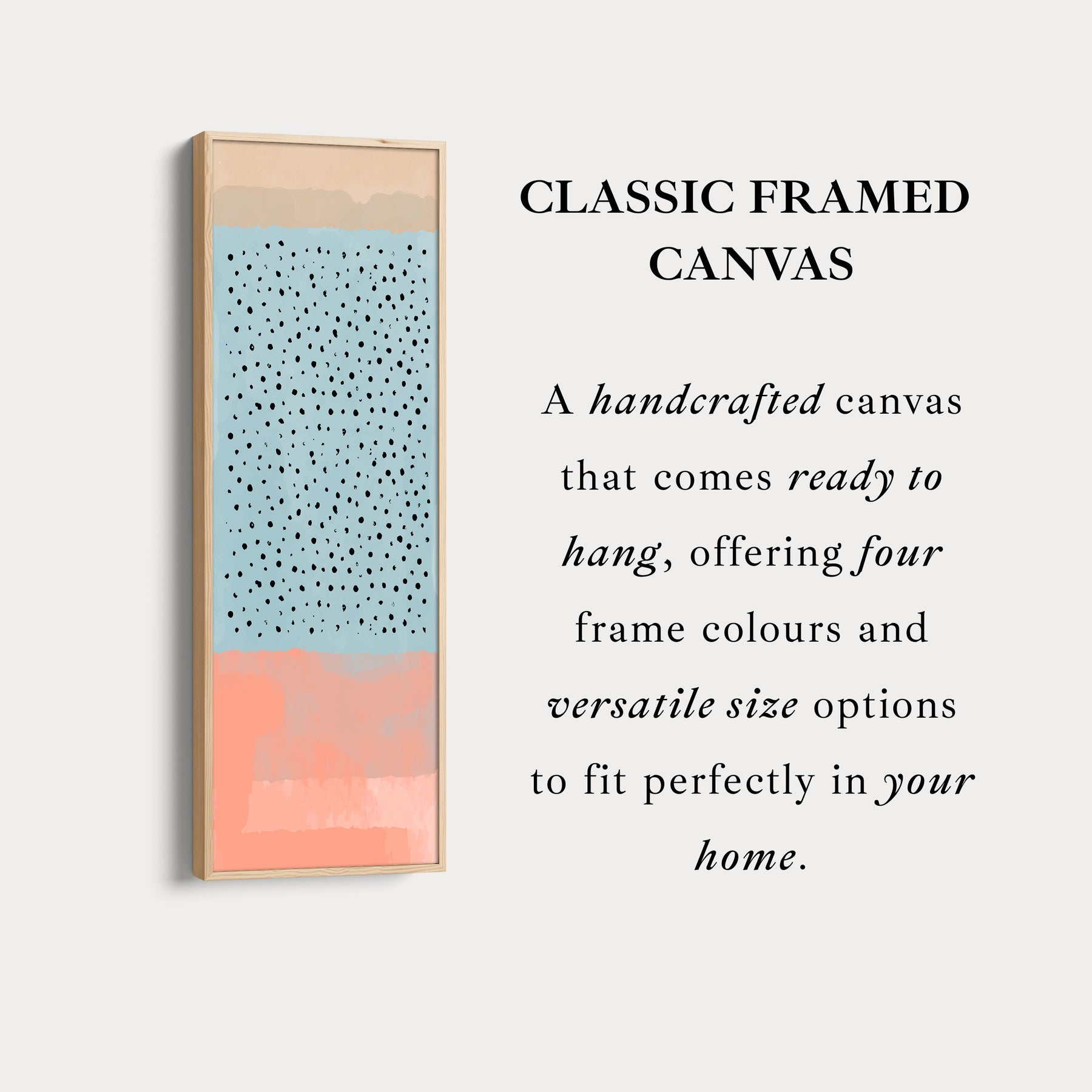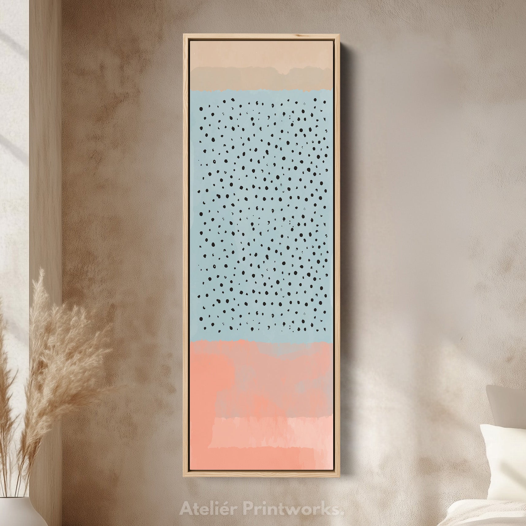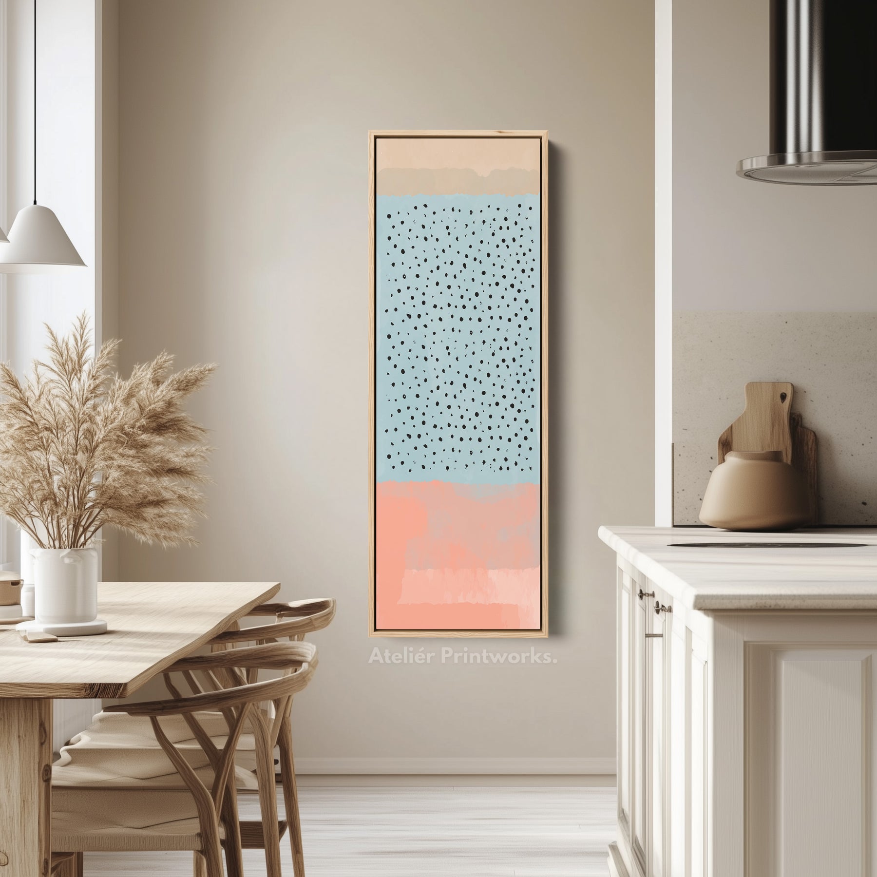 A field of blue tones is dotted with modern black marks for a playful contemporary style. This thin wall art works beautifully as a subtle accent. The tall canvas design enhances narrow wall art spaces and offers vertical balance. Skinny wall art is perfect between cabinets or shelving. Ideal for kitchens where above console wall art needs colour without dominating.