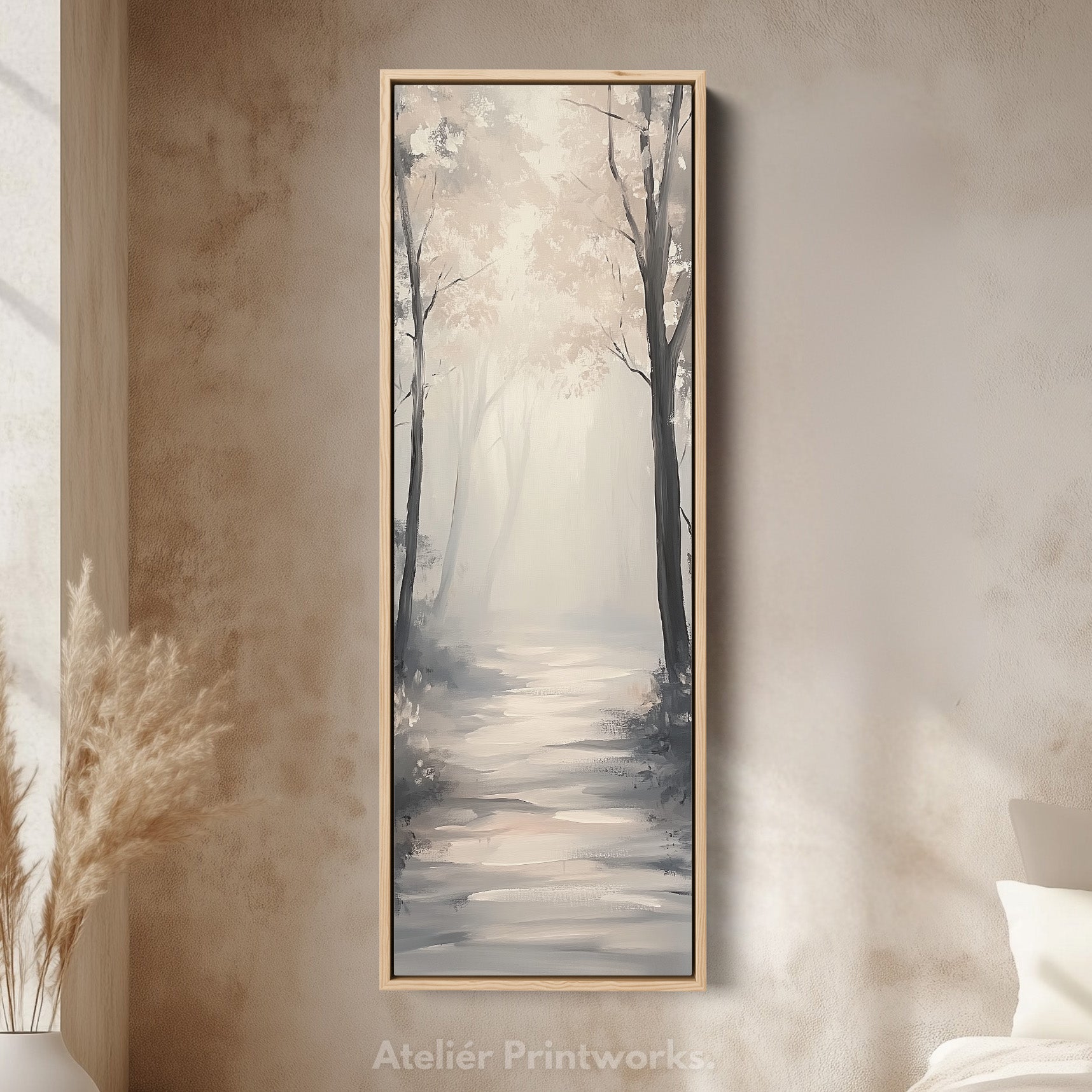 Perfect as vertical wall art, this piece beautifully enhances tall, narrow spaces such as beside doorways or in cozy corners. Its minimalist design makes it an excellent choice for long narrow wall art, bringing understated elegance to hallways, offices, or entryways. For compact areas, it works wonderfully as thin wall art, offering a refined and calming accent to smaller spaces. This artwork complements modern, minimalist, and nature-inspired interiors, adding the soothing beauty of a misty forest to your décor.