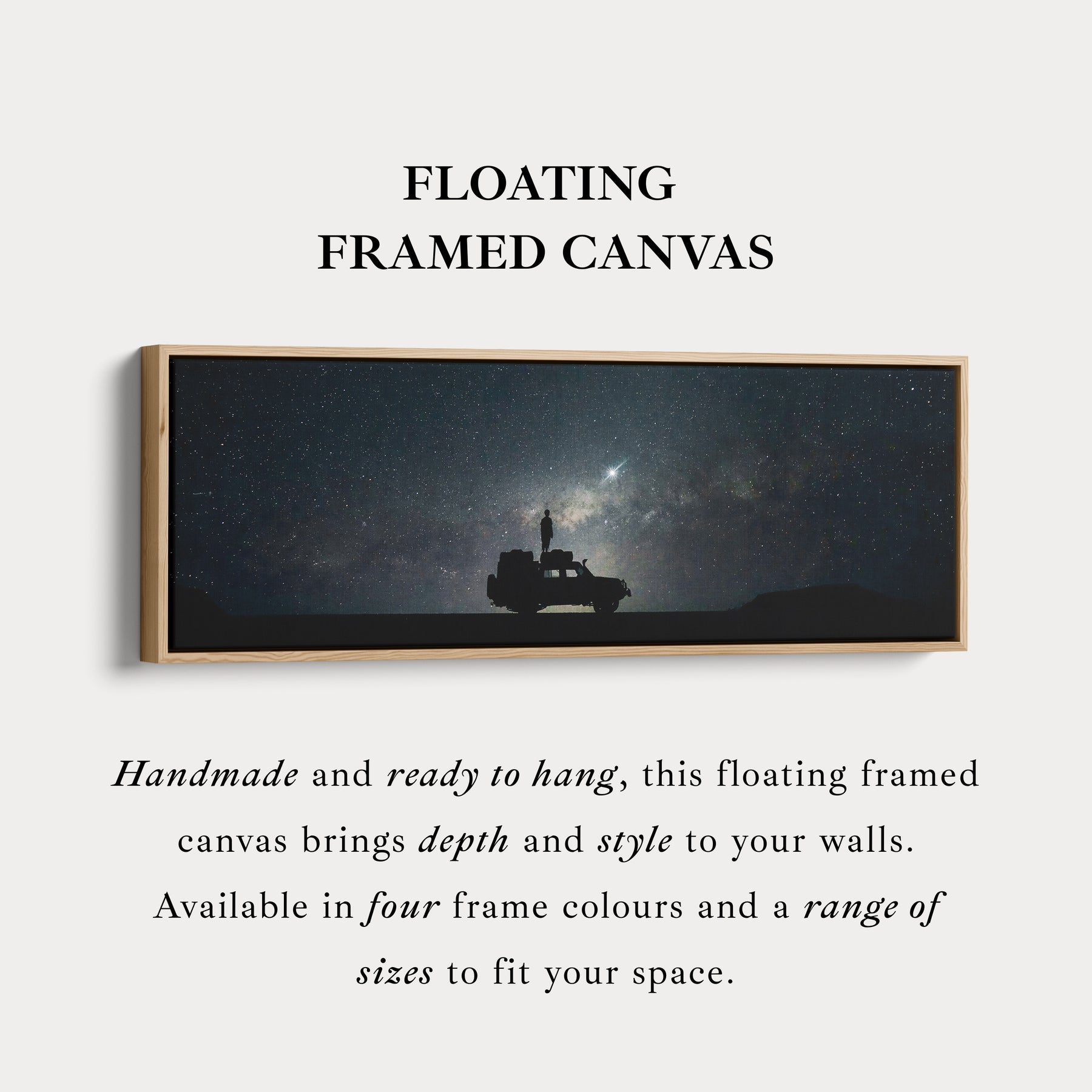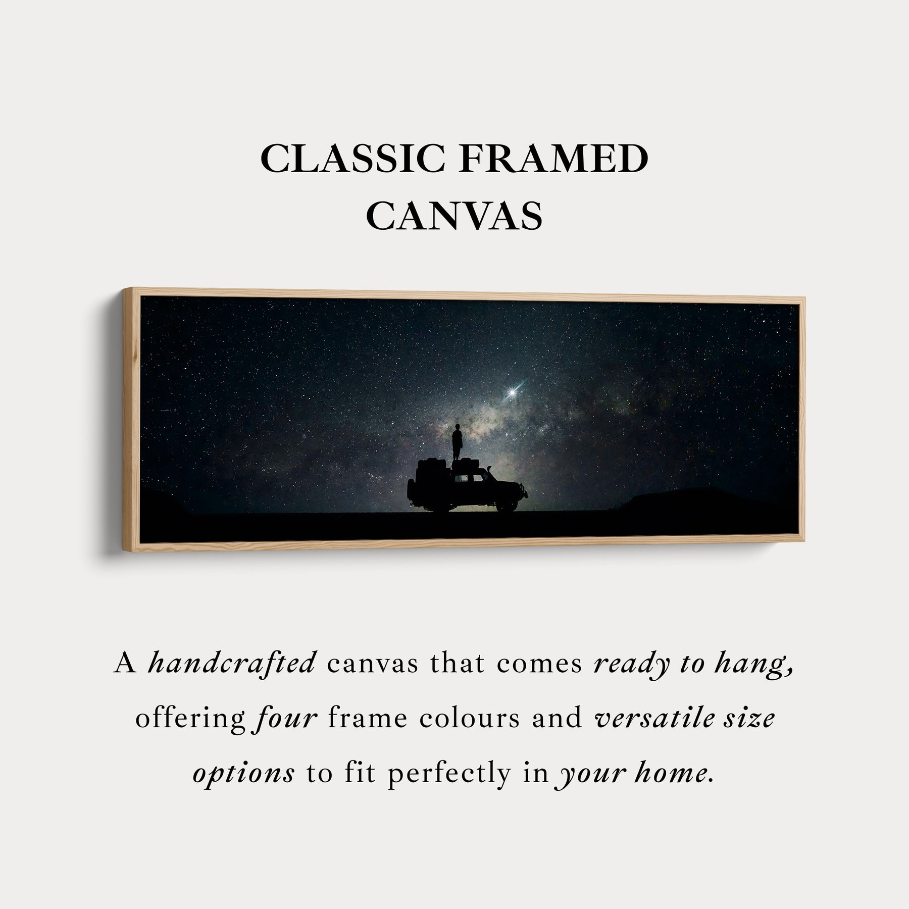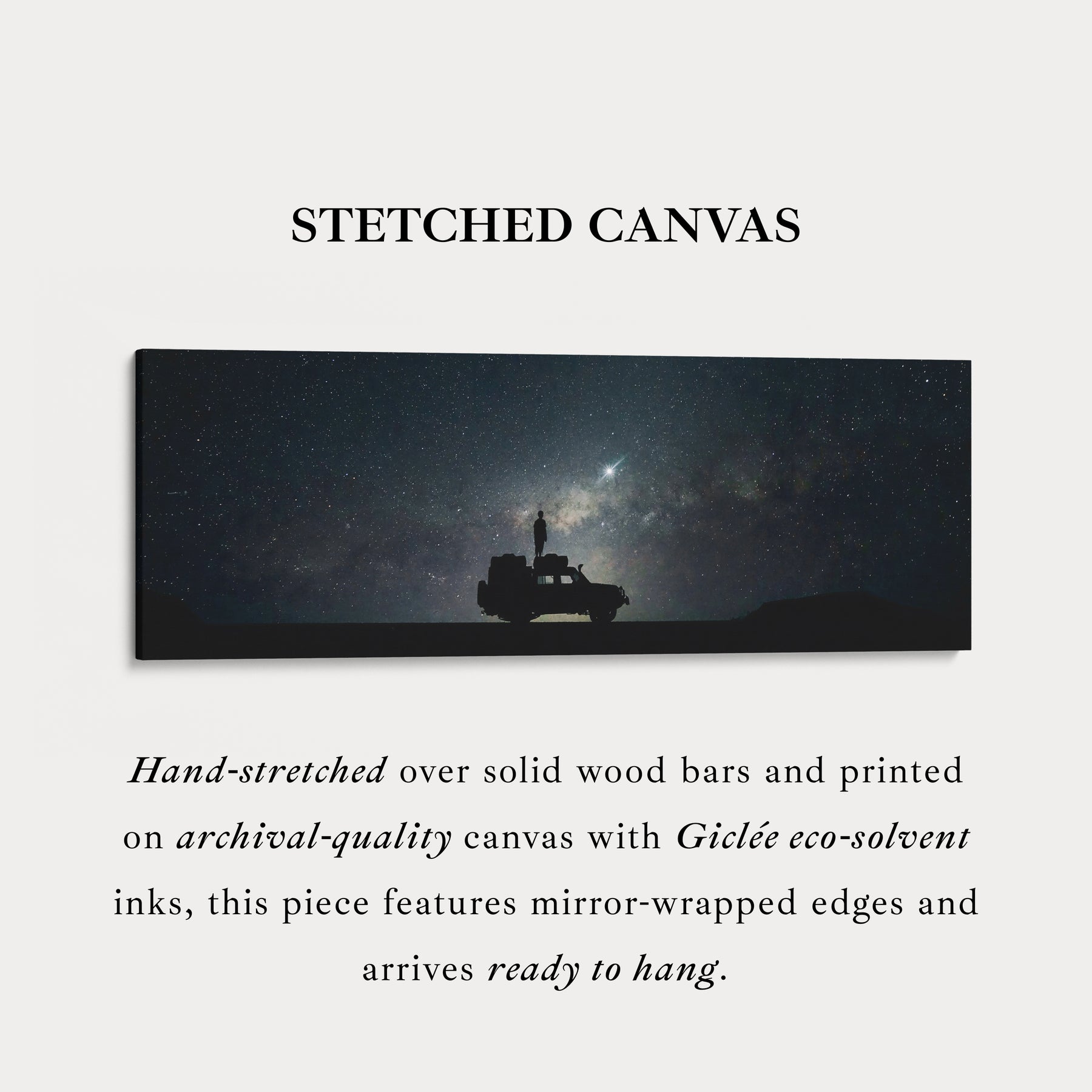 Ideal for horizontal long narrow wall decor, this piece adds a bold and inspiring touch to wide spaces such as living rooms, offices, or creative studios. As a large framed canvas, it serves as a mesmerizing focal point, seamlessly blending with modern, minimalist, or nature-inspired interiors. The combination of a vast celestial sky, rugged exploration, and dramatic lighting makes this artwork a captivating addition to any space, perfect for those who appreciate the beauty of the night and the spirit of adventure.