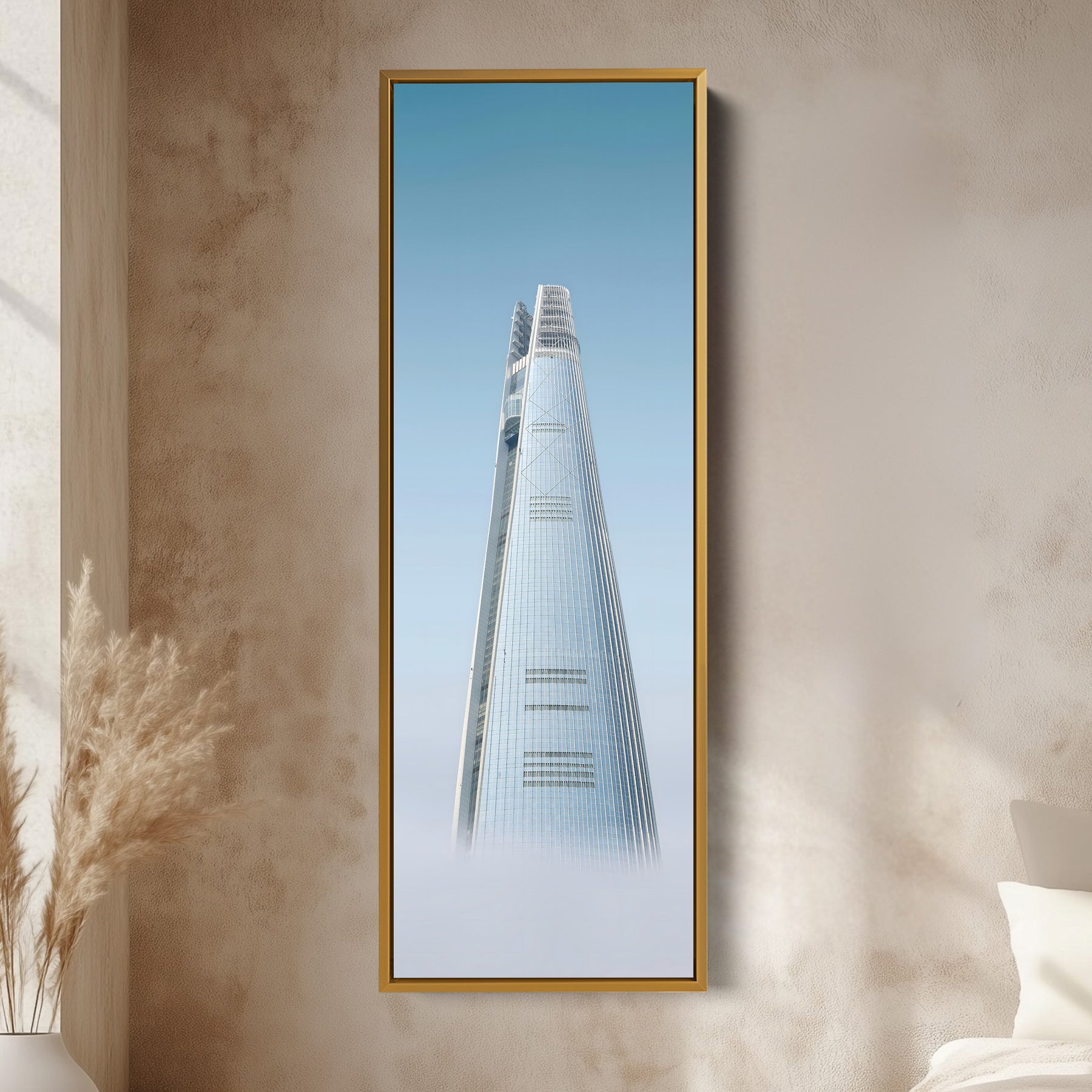 A tall sleek skyscraper rises from soft morning mist creating a futuristic calm mood. This vertical framed canvas introduces scale and architectural drama without clutter. The long vertical canvas direction draws the eye up and makes small spaces feel taller. Narrow wall art is perfect for adding height along office or hallway walls. Ideal for modern interiors where above console wall art or skinny wall art needs a clean minimalist focal point.