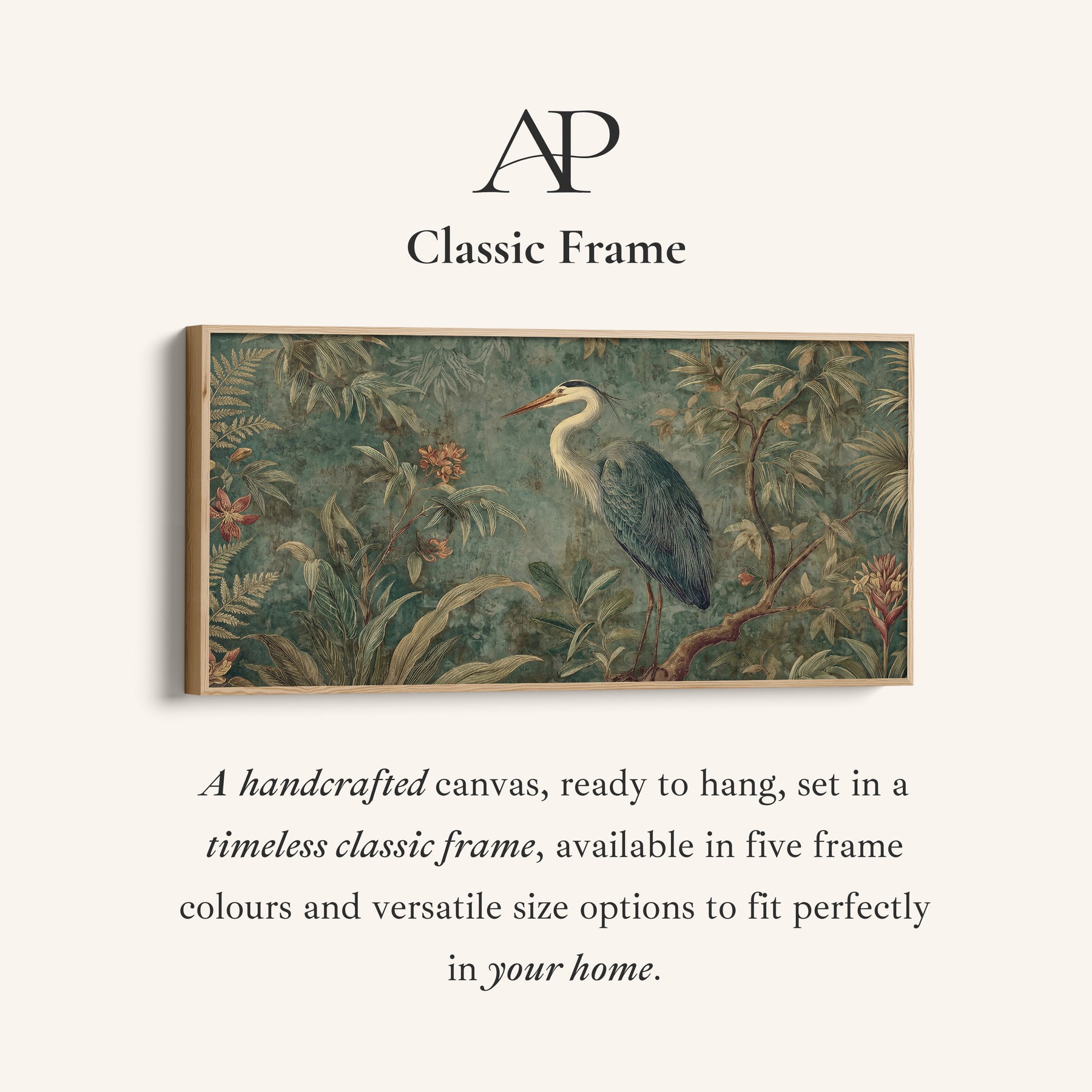 A blue and beige heron stands on a branch among green leaves and flowers against a muted green background. The blue and beige tones of the bird blend with layered green foliage, forming a detailed botanical scene that extends gracefully across a horizontal canvas. The balanced composition makes it well suited to above soft wall art placement in transitional spaces. Displayed as panoramic wall art in a hallway, the elongated layout enhances the sense of flow while keeping the focus on the poised heron and surrounding greenery.