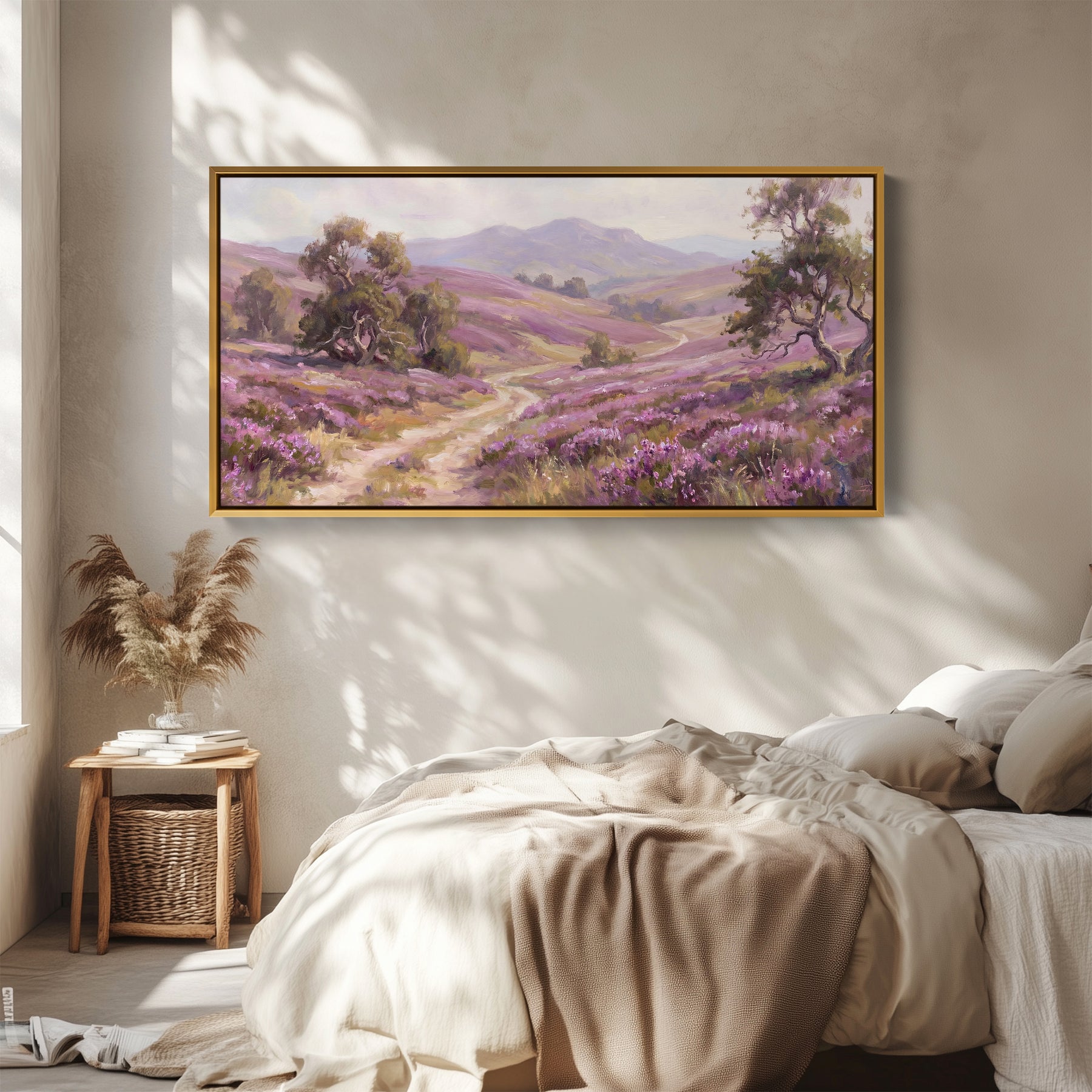 Rolling green hills are covered in pink heather beneath a soft beige sky, with a winding path leading through the landscape. The combination of pink, green and beige defines the sweeping countryside view. This panoramic wall art format stretches the moorland scene across the wall, making it a natural statement in a living room. Its wide wall art composition draws the eye along the path and across the hills, offering a sense of depth and openness.