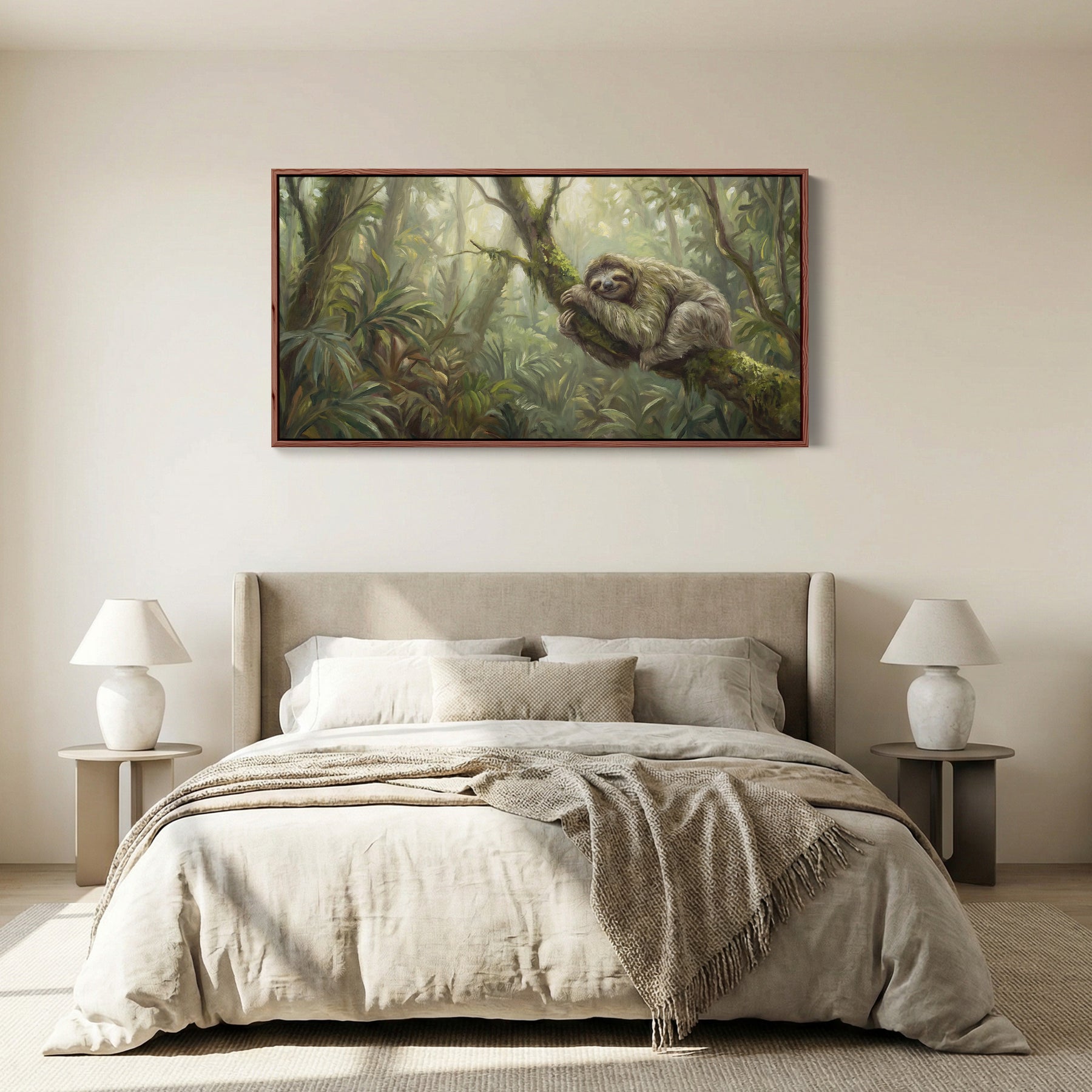 A sloth rests comfortably on a mossy tree branch surrounded by green jungle plants. The relaxed pose of the sloth contrasts with the layered green foliage and brown branches, creating a balanced horizontal canvas scene. Beige tones in the animal’s fur soften the overall palette. As large wall art for a bedroom, this tranquil wildlife image adds warmth and character while maintaining a calm natural atmosphere.