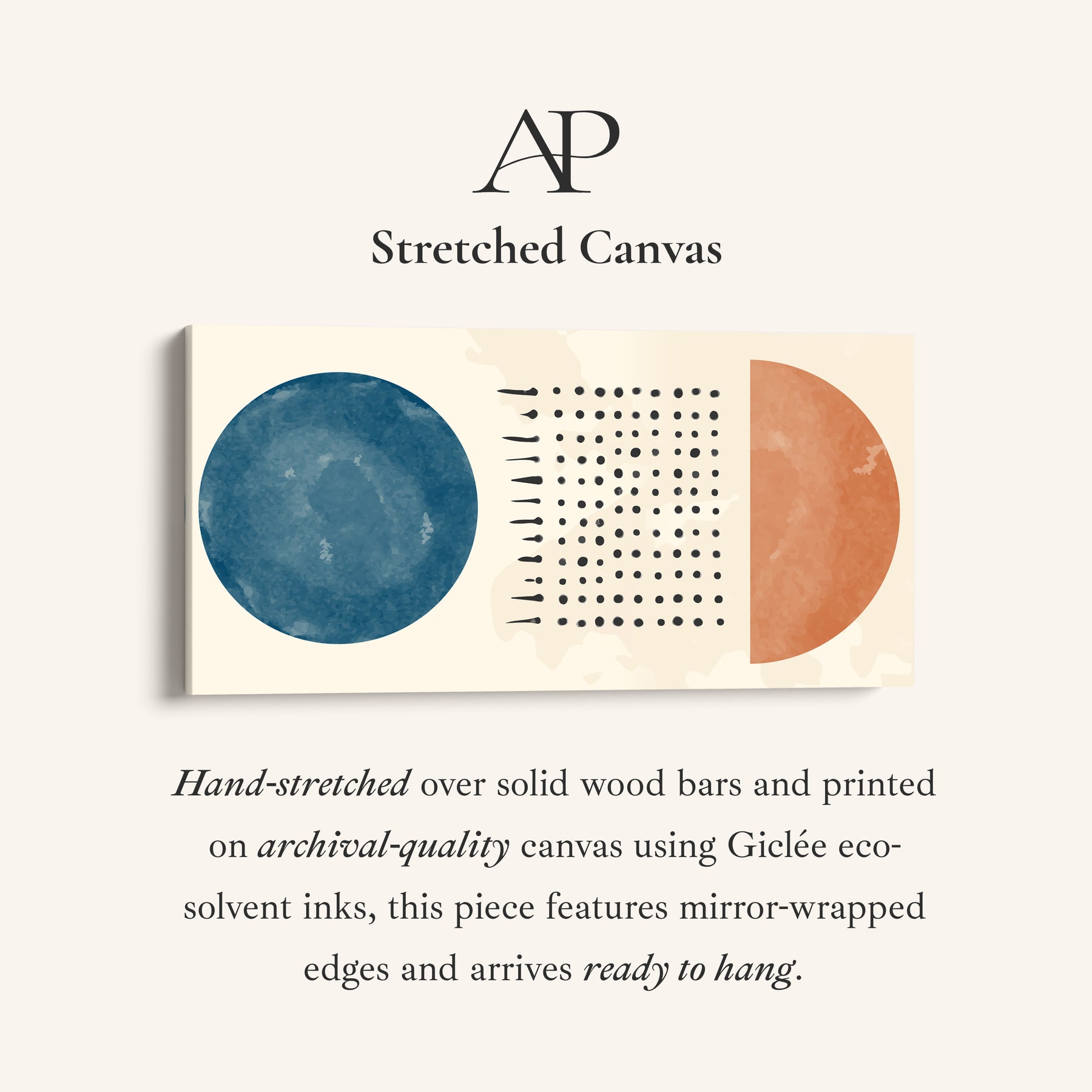 A blue circle and an orange half circle sit on either side of a central grid of small black dots against a beige background. The bold combination of blue, orange, black, and beige gives this large wall art composition strong visual balance. The structured dot grid contrasts with the solid circular forms, creating a clean geometric arrangement across the panoramic wall art format. Placed in a living room, this horizontal canvas print introduces colour and symmetry while remaining crisp and modern.