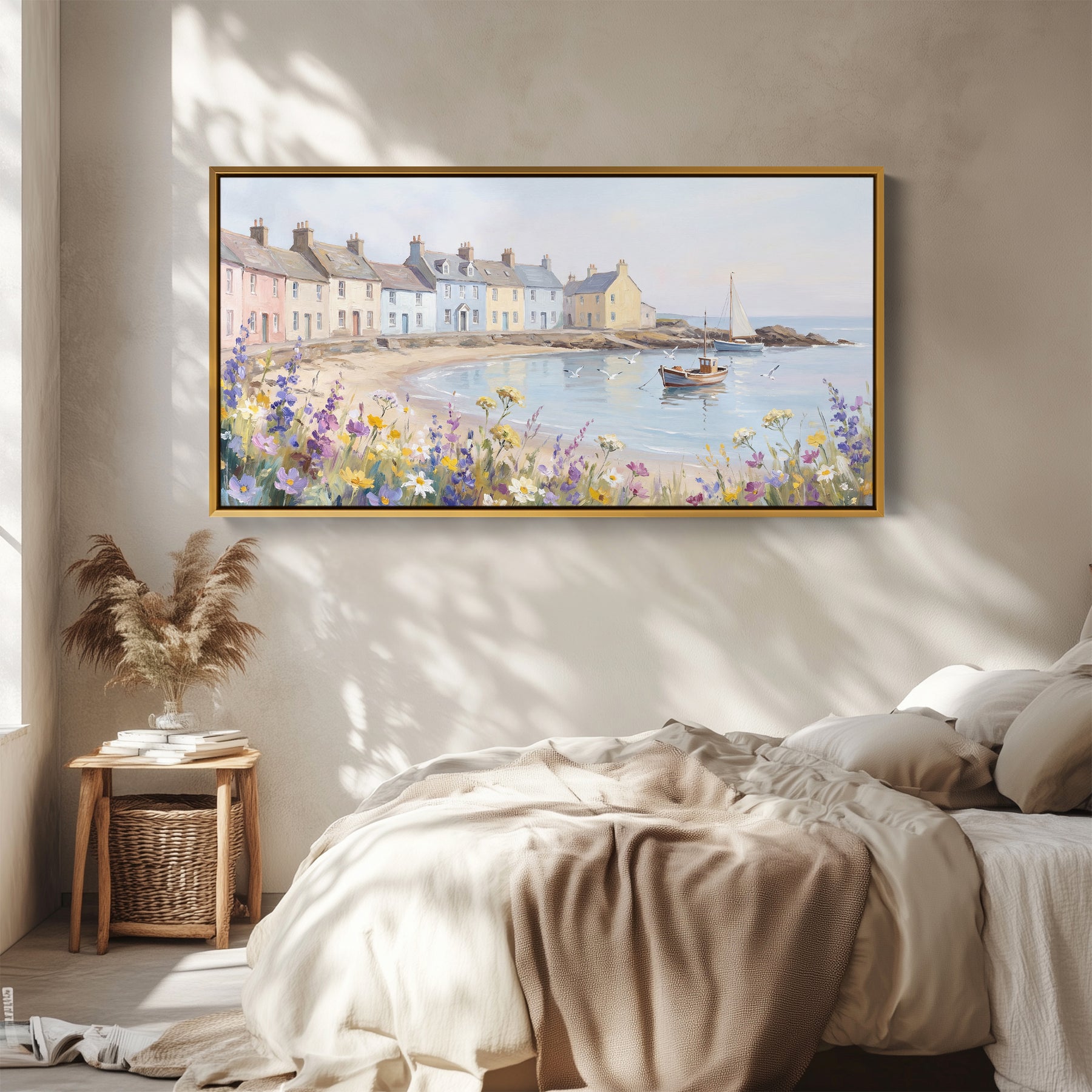 Pastel houses line a sandy beach beside calm blue water, with small boats anchored near the shore and yellow and purple flowers in the foreground. The soft blue sea and beige shoreline stretch across the composition, while the row of colourful houses adds depth and character. The wide layout enhances the sense of open space typical of large wall art. Well suited to a living room, this panoramic wall art captures a peaceful coastal setting using blue, beige and yellow as the dominant tones.