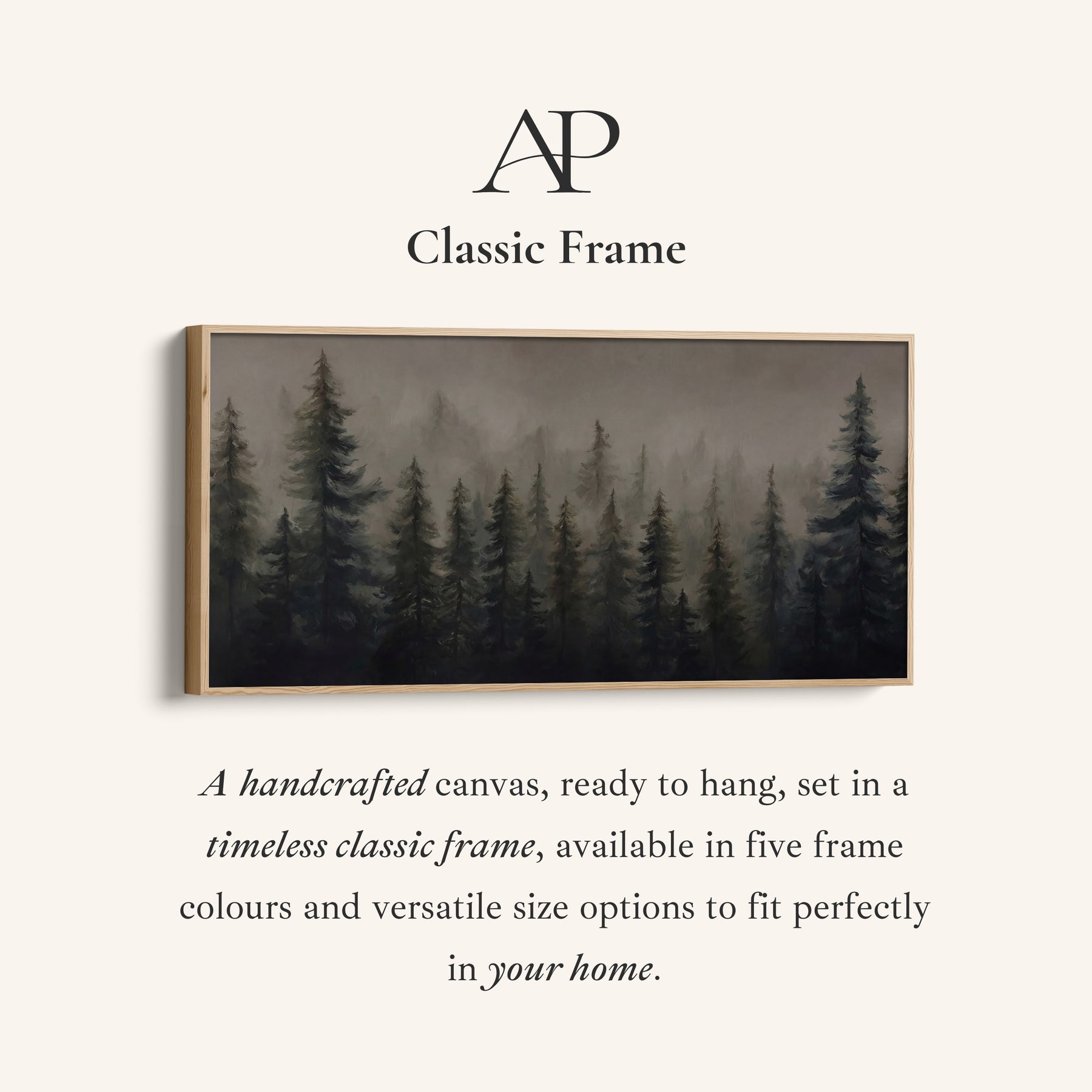 Dark pine trees stand in layered rows while grey mist drifts through the forest background. The fading silhouettes create depth as the trees gradually soften into the distance. Grey, green and black tones dominate this large wall art composition, forming a moody landscape that stretches across the frame. The layered arrangement enhances the sense of scale, making it well suited to a panoramic wall art display. Designed for an office, this wide canvas scene adds a grounded natural presence while maintaining a calm and focused atmosphere through its restrained colour palette.