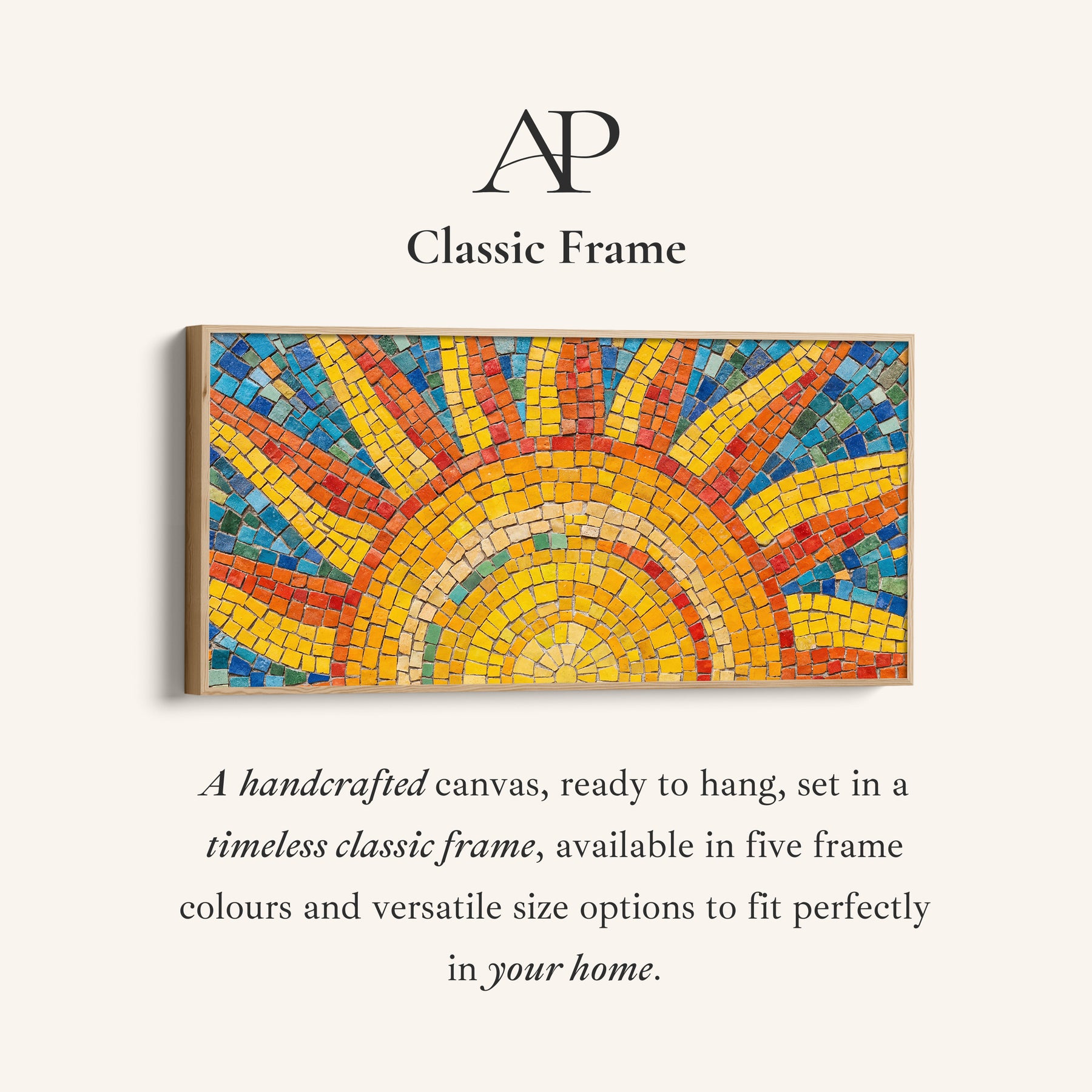 A detailed mosaic sunburst pattern in yellow and orange spreads across a blue tiled surface. Radiating shapes in yellow and orange extend outward from the centre, contrasted by surrounding blue tiles. This horizontal wall art captures attention through symmetry and strong colour contrast. Placed in a hallway, this wide wall art adds brightness and movement, making transitional spaces feel vibrant and inviting.