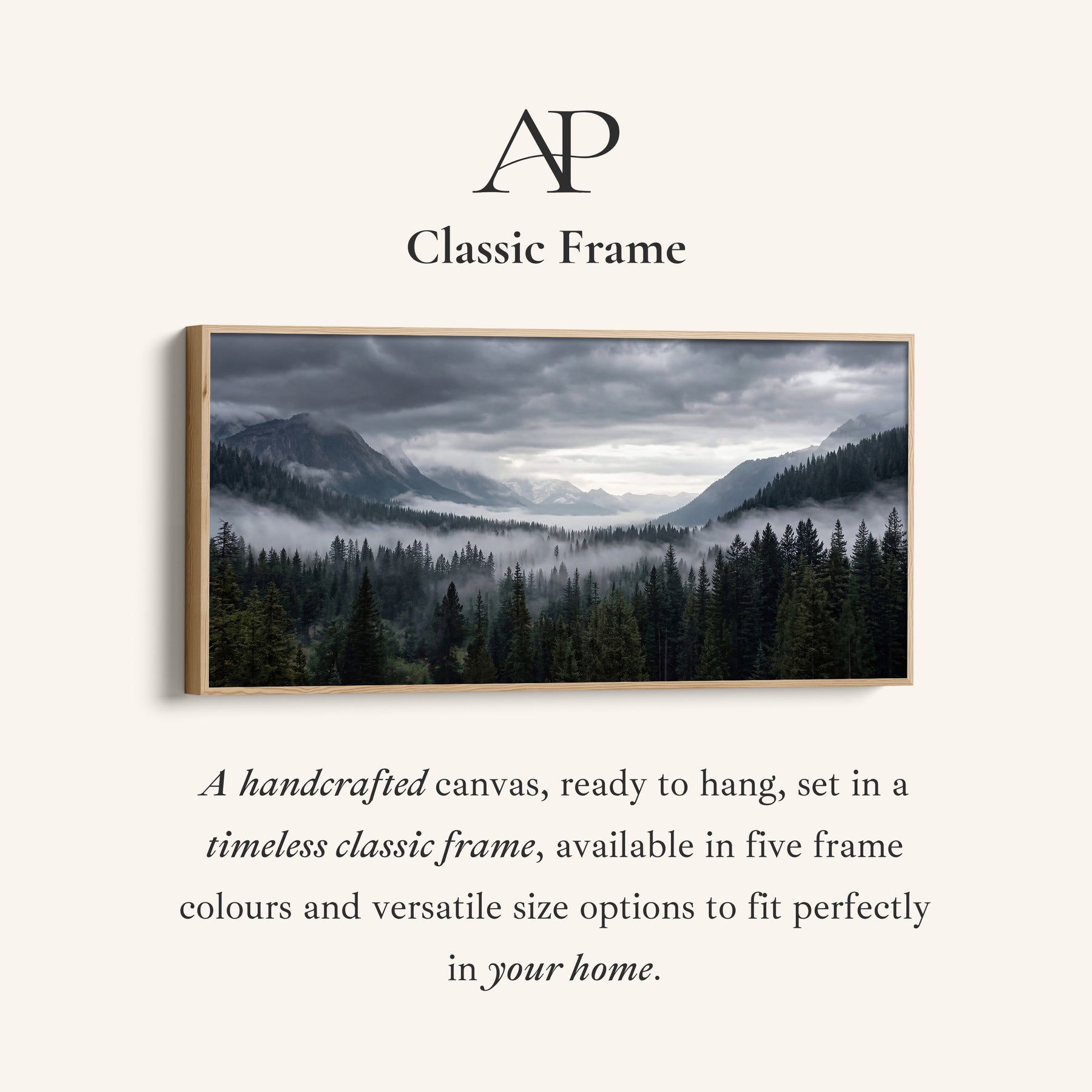 A dense green pine forest fills the foreground while grey mountains rise in the distance under low cloud. Mist drifts through the trees, softening the valley. Green and black tree forms contrast with the grey mountain backdrop in this large wall art composition. The extended width allows the forest and peaks to unfold gradually across the frame. Placed in a living room, this extra wide canvas delivers a strong natural landscape presence while maintaining a restrained and cohesive colour palette.