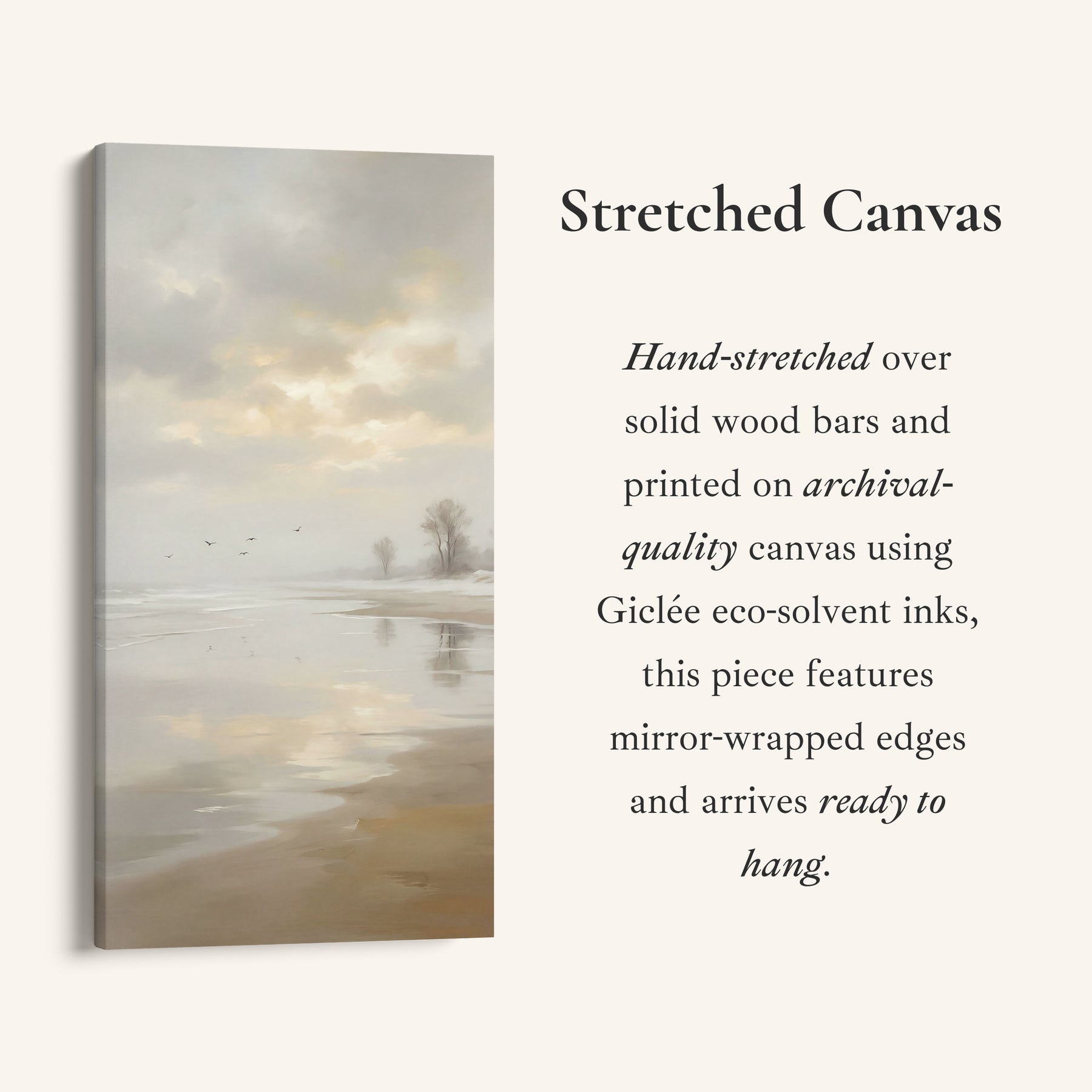 A pale shoreline curves beside calm water with birds and distant trees. The visible colours stay within beige, green and grey. This vertical wall art suits walls that need height and balance, keeping the layout calm and proportion-led. Use it as a large vertical wall art in a kitchen to add scale without taking up extra width.