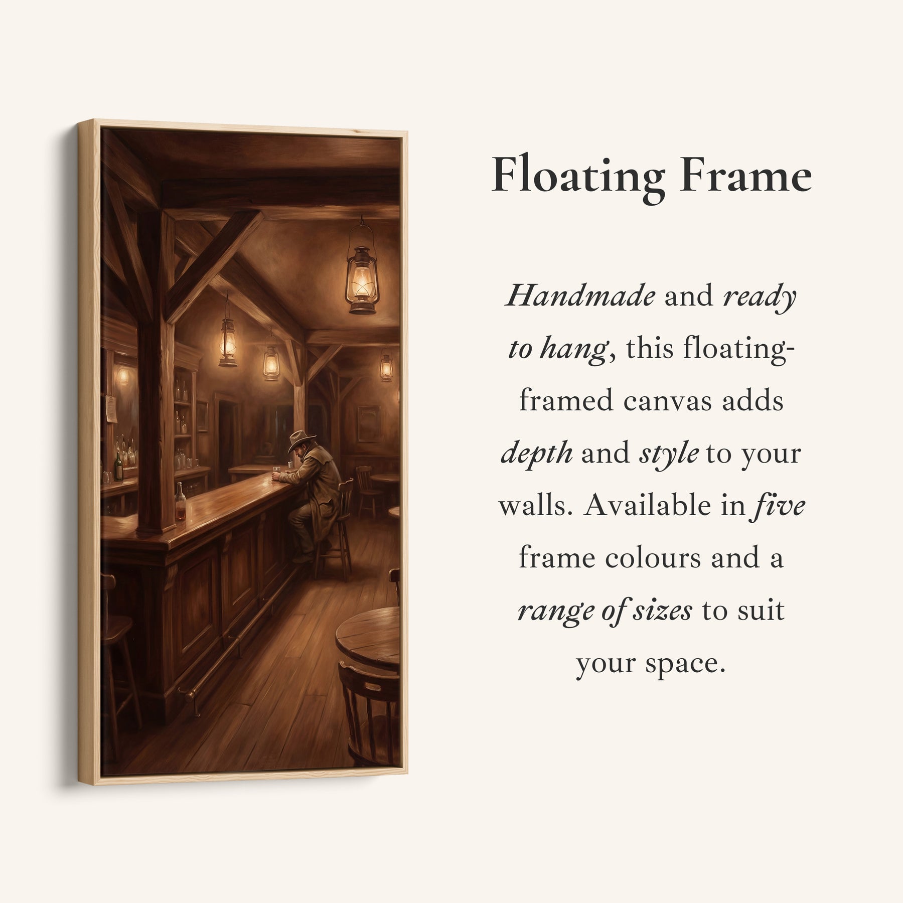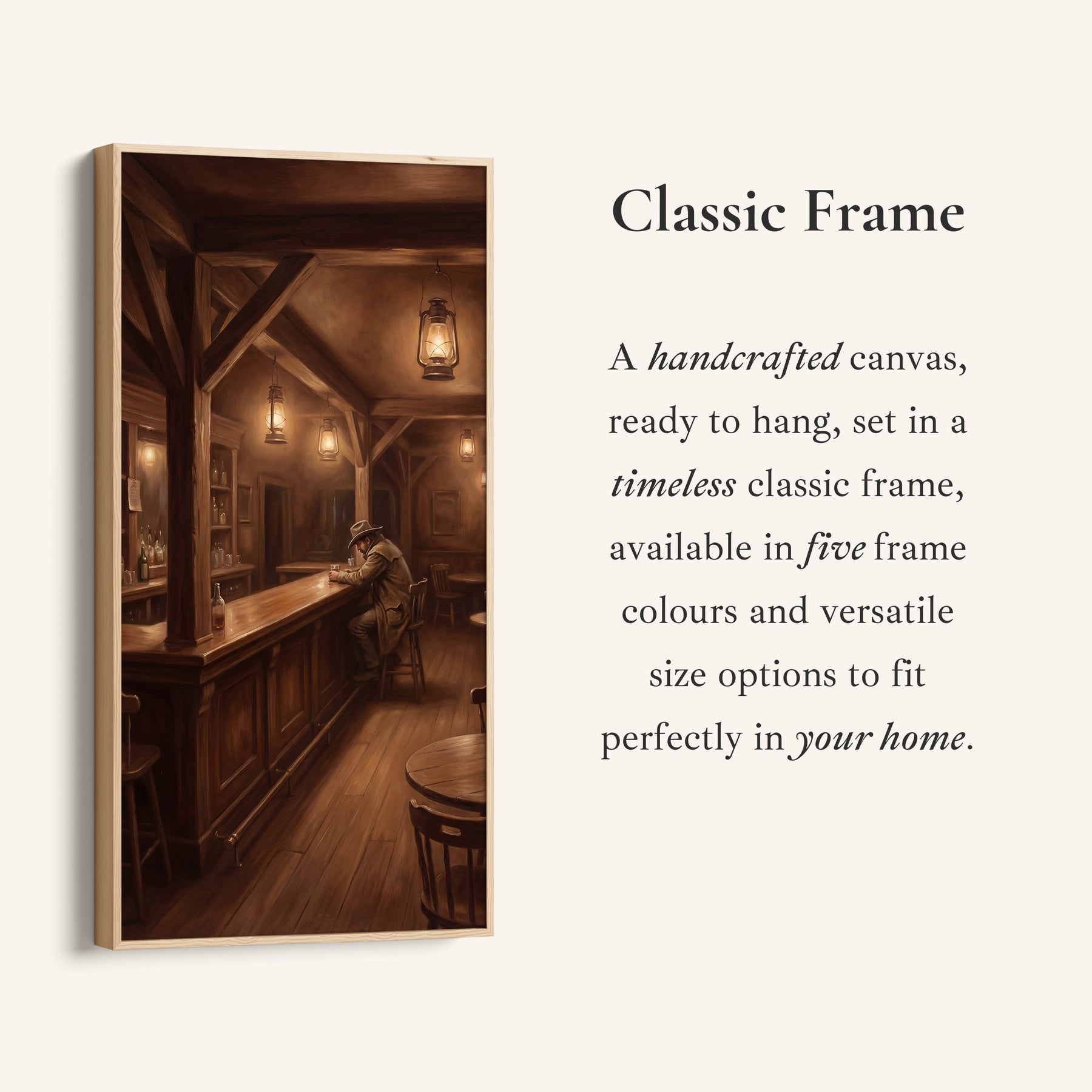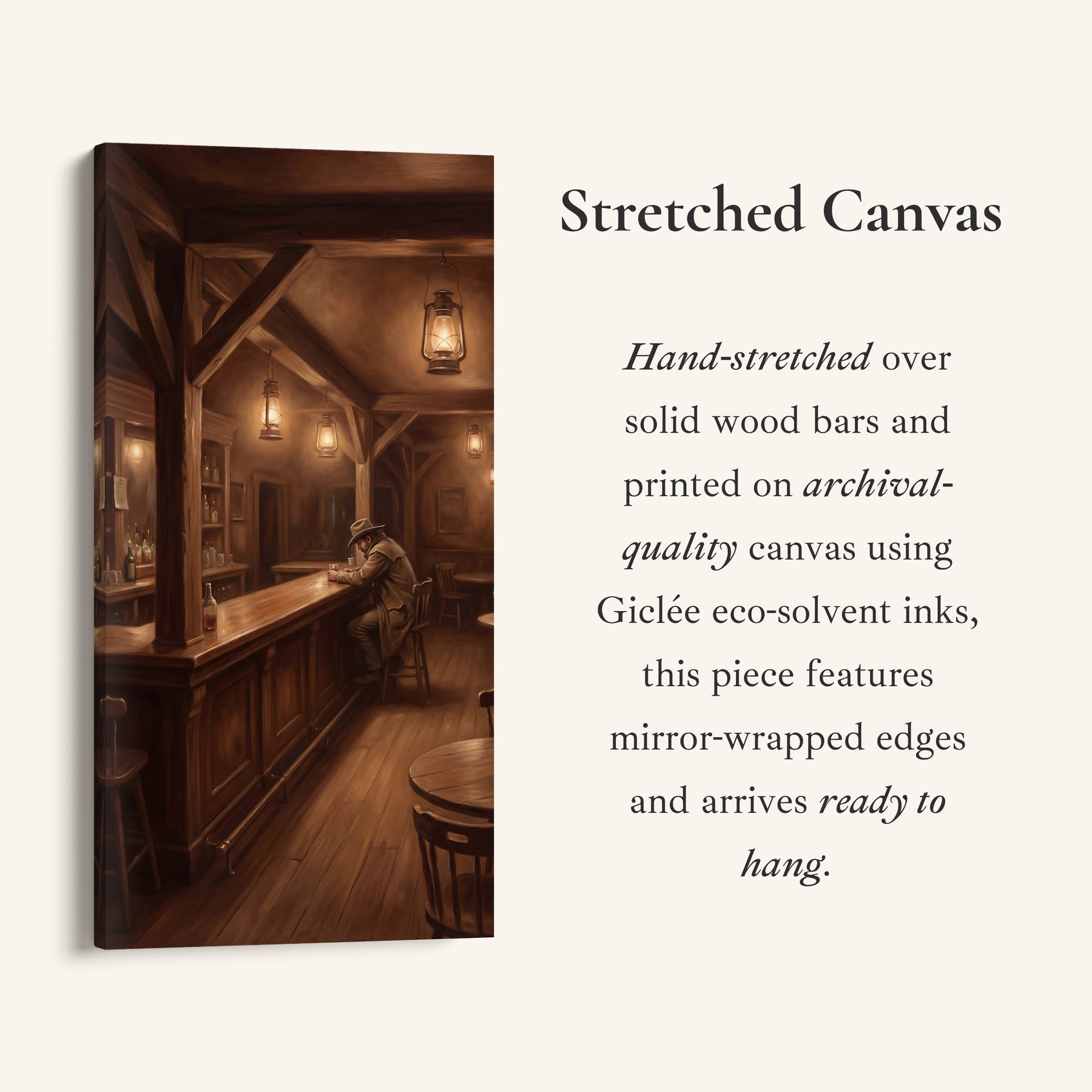 A warm lit saloon interior shows a wooden bar and hanging lanterns. The visible colours stay within brown and black. This vertical wall art suits walls that need height and balance, keeping the layout calm and proportion-led. Use it as a large vertical wall art in a hallway to add scale without taking up extra width.