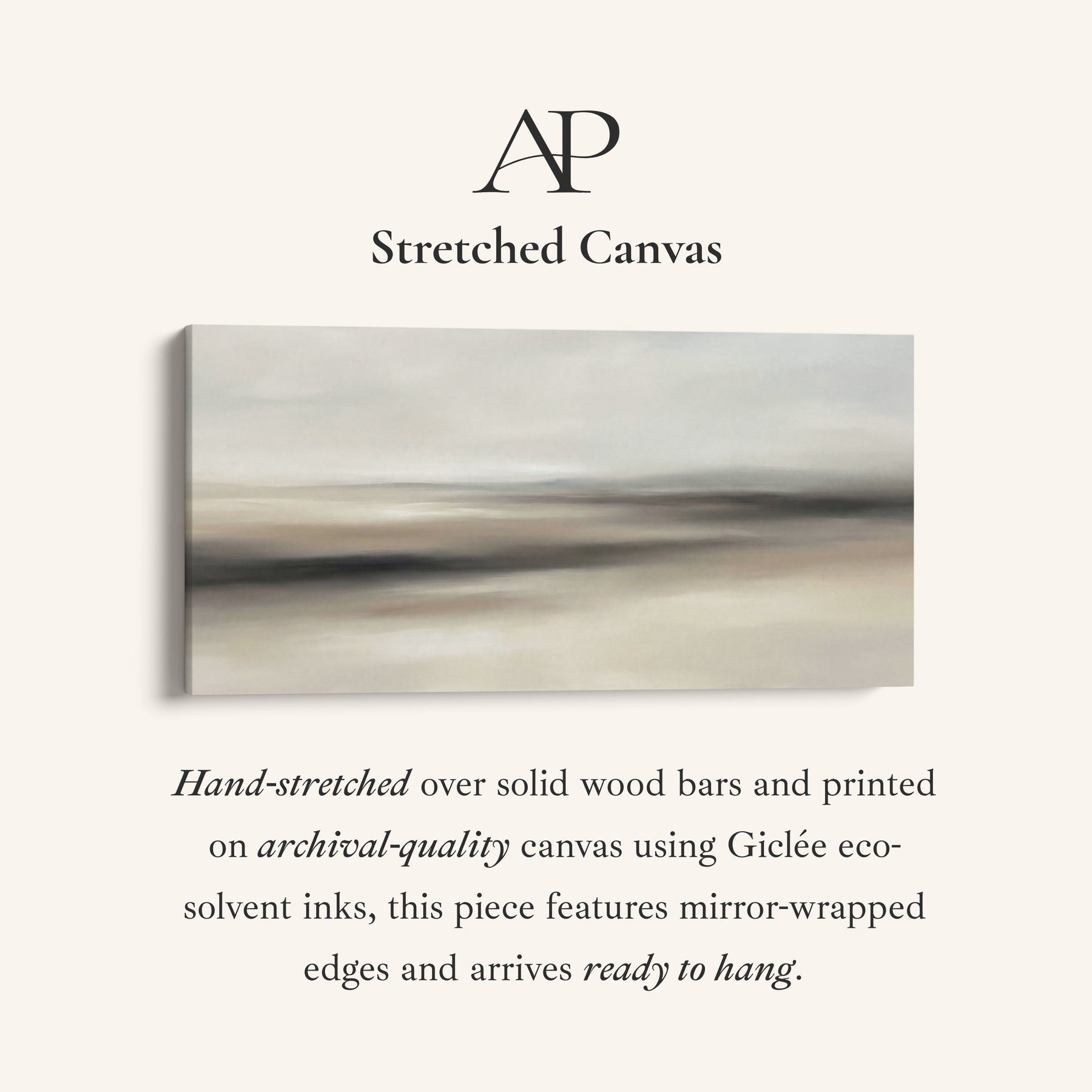 A soft beige and grey blurred horizon stretches across a white toned shoreline. The subtle transition between beige, grey and white creates a calm minimal scene with very little detail. As a wide framed canvas composition, the long format emphasises the quiet horizontal line of sea and sky. Placed in an office, this minimalist horizontal wall art keeps the room feeling open and uncluttered.