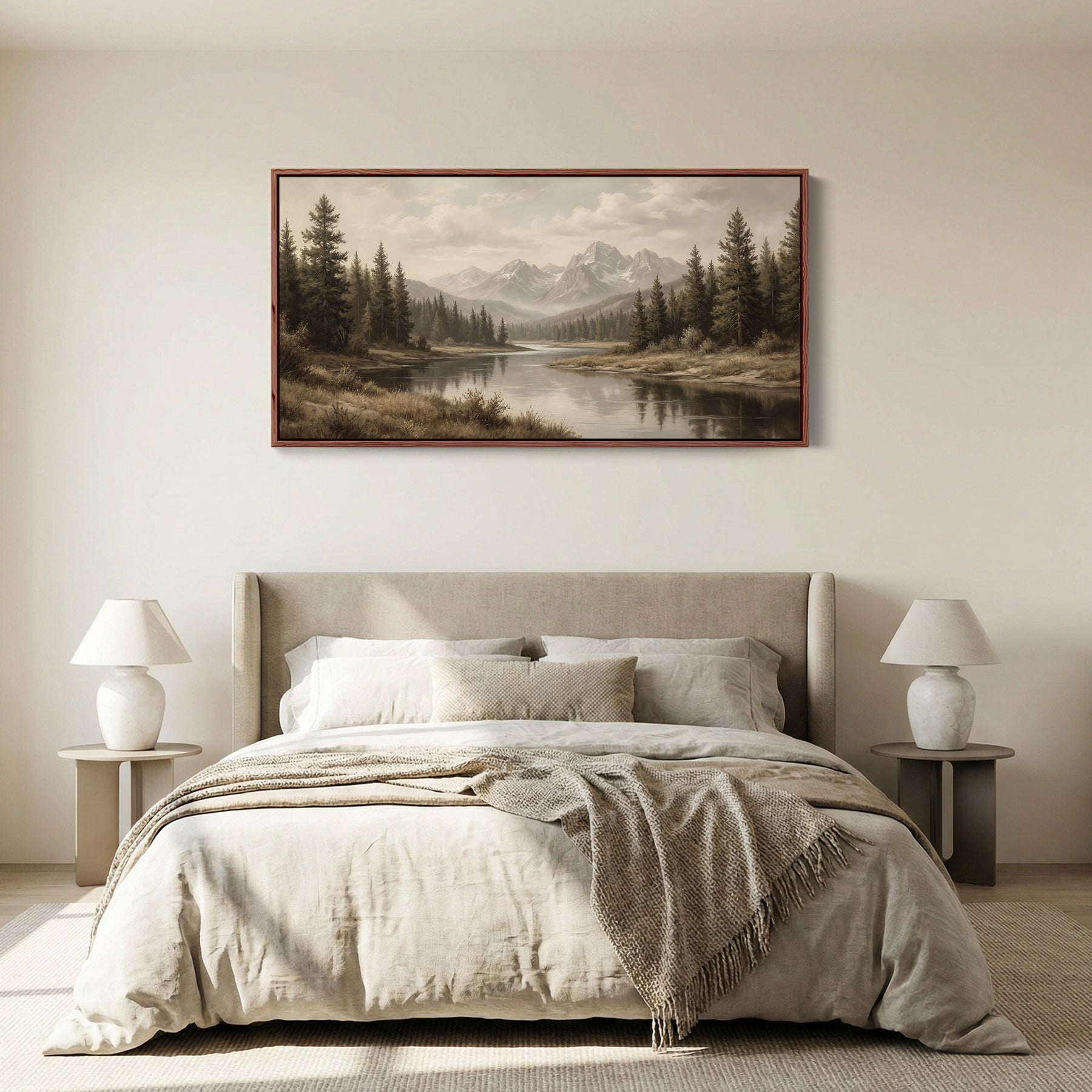 A calm river flows between green trees with beige mountains rising in the distance. The landscape is framed by forest on both sides. This horizontal wall art combines green woodland with brown and beige mountain tones, creating layered depth across the scene. The reflective river adds balance to the composition. Suitable as large wall art in an office, this panoramic wall art introduces a serene natural setting while maintaining neutral harmony.