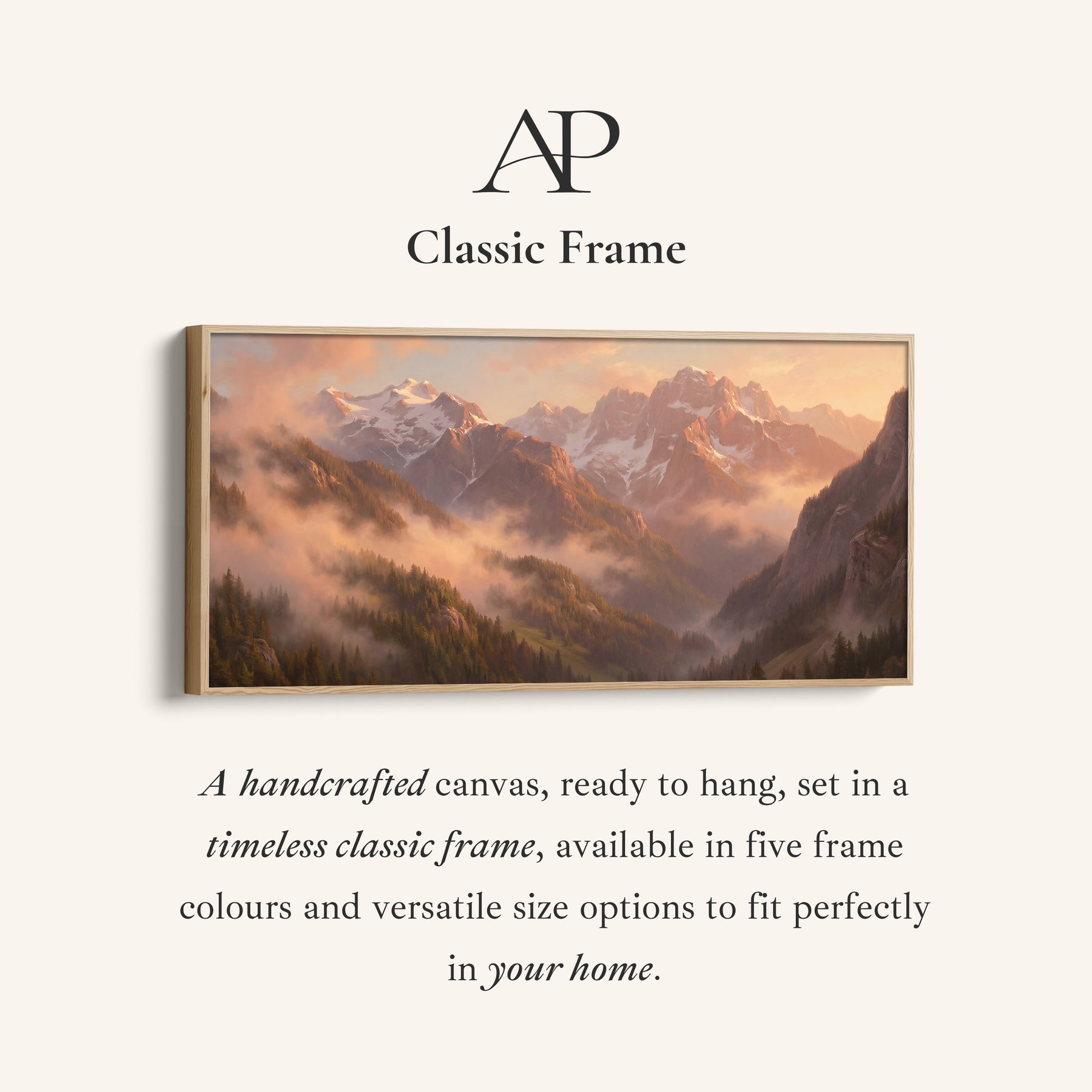 Sunlight glows over orange and brown mountains with green trees and drifting mist through the valley. The layered peaks and warm sunrise tones create a dramatic wide framed canvas focal point. Orange light blends with green forested slopes, giving this horizontal wall art strong depth and atmosphere. In a living room, this panoramic scene brings warmth and expansive scale while keeping the colour story cohesive and natural.