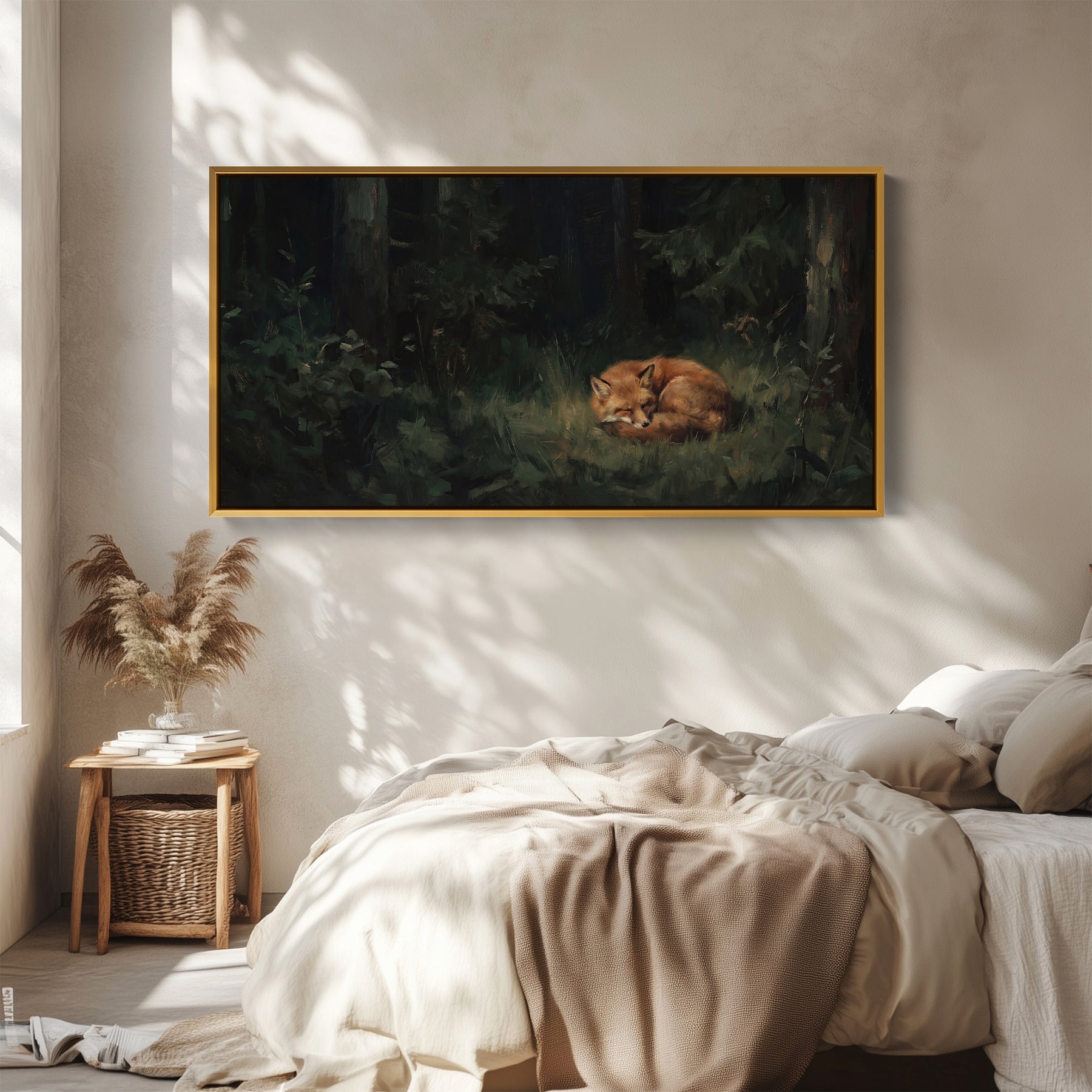 A fox is curled up asleep on the forest floor among dark green foliage. The warm brown fur contrasts gently against the deep green surroundings. This above soft wall art scene captures a peaceful woodland moment, with the fox resting quietly beneath the trees. The panoramic wall art format extends the forest setting across the frame, creating depth and calm. Designed for a bedroom, this wide wall art adds a tranquil natural element while keeping the overall mood intimate and soothing.