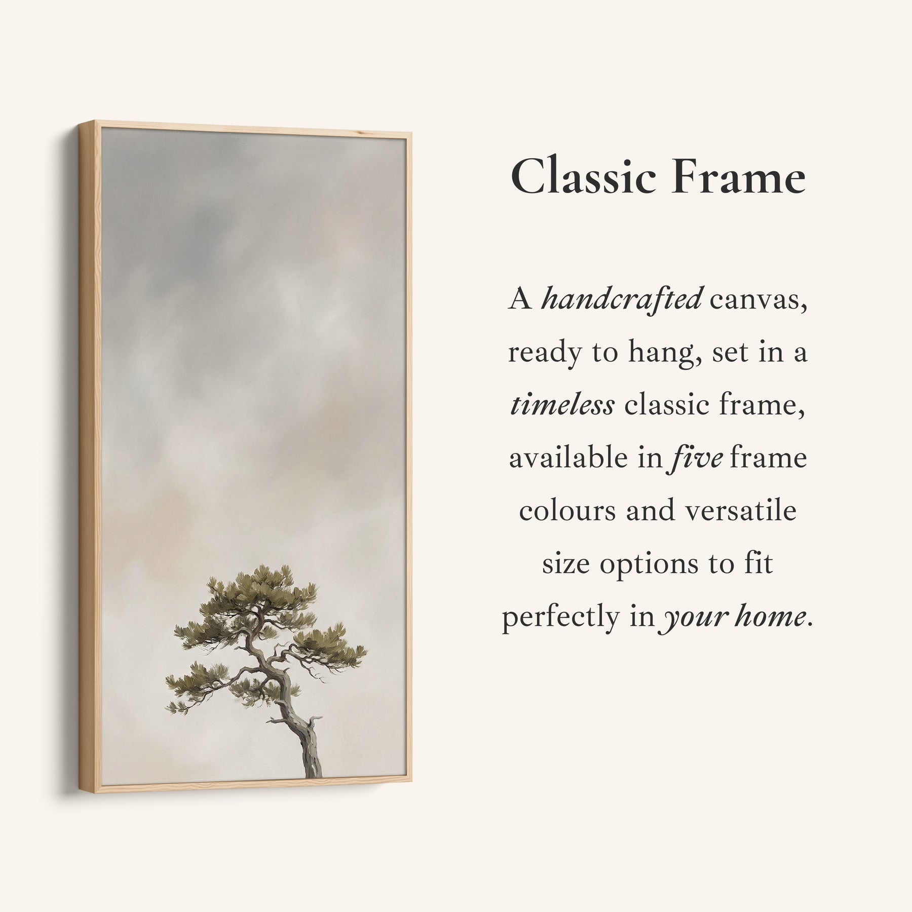 A windswept tree appears on the right side against a foggy sky. The visible colours stay within grey and beige. This tall narrow canvas suits walls that need height and balance, keeping the layout calm and proportion-led. Use it as a tall canvas in a kitchen to add scale without taking up extra width.