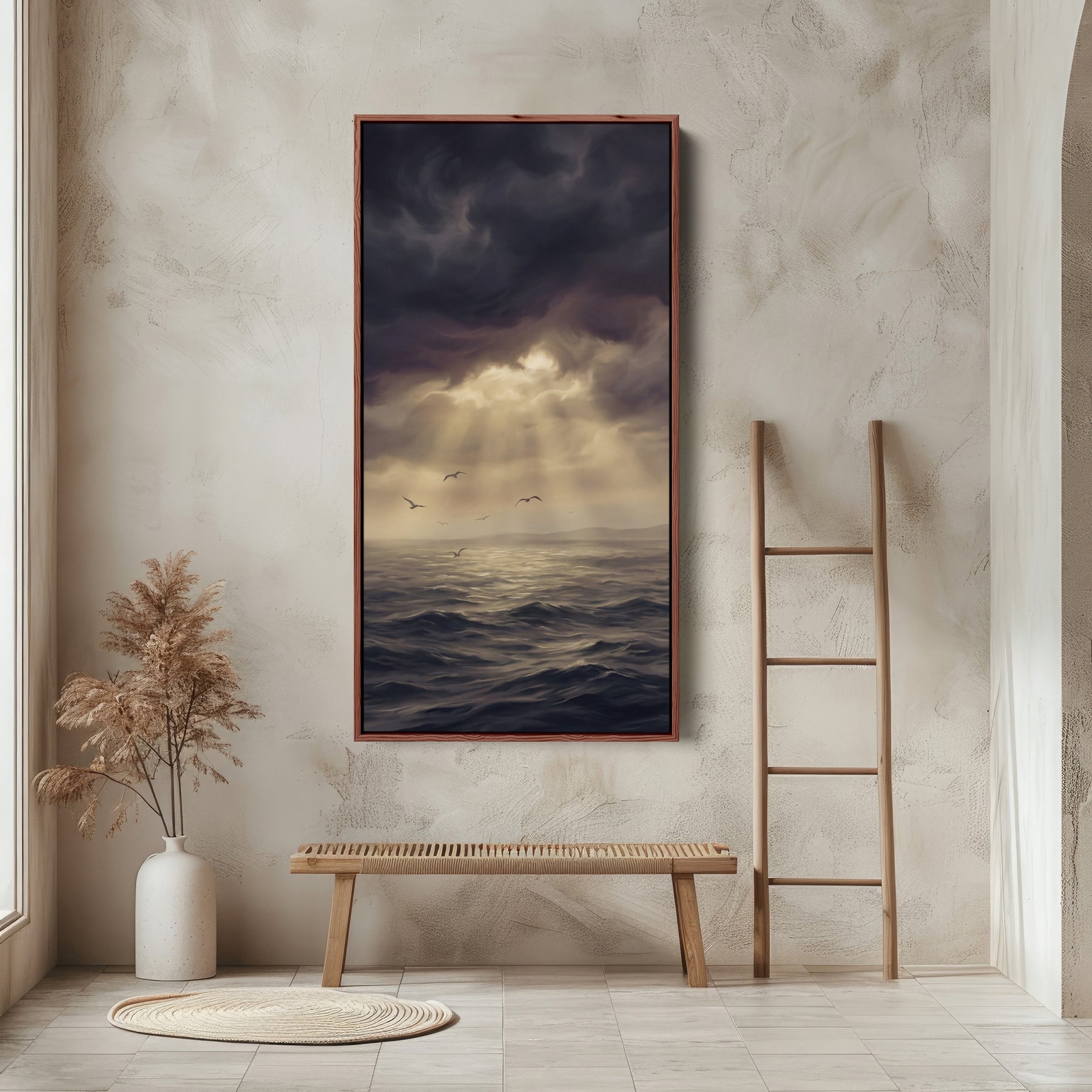 Sunbeams shine through dark clouds onto choppy water with birds below. The visible colours stay within black, grey and beige. This tall wall art suits walls that need height and balance, keeping the layout calm and proportion-led. Use it as a tall canvas in a office to add scale without taking up extra width.