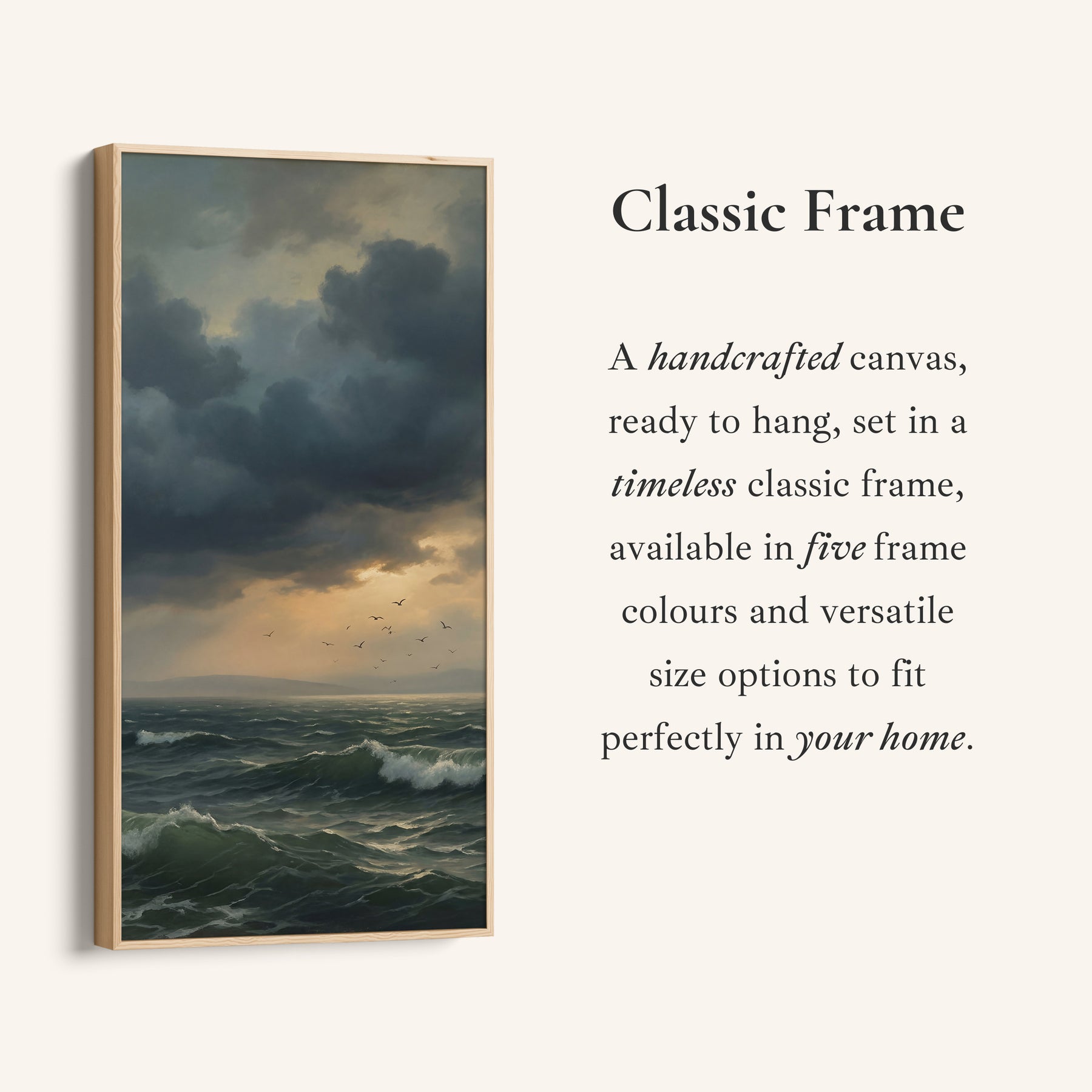 Dark waves roll beneath storm clouds with birds flying near the horizon. The visible colours stay within brown, grey and green. This tall wall art suits walls that need height and balance, keeping the layout calm and proportion-led. Use it as a tall canvas in a living room to add scale without taking up extra width.