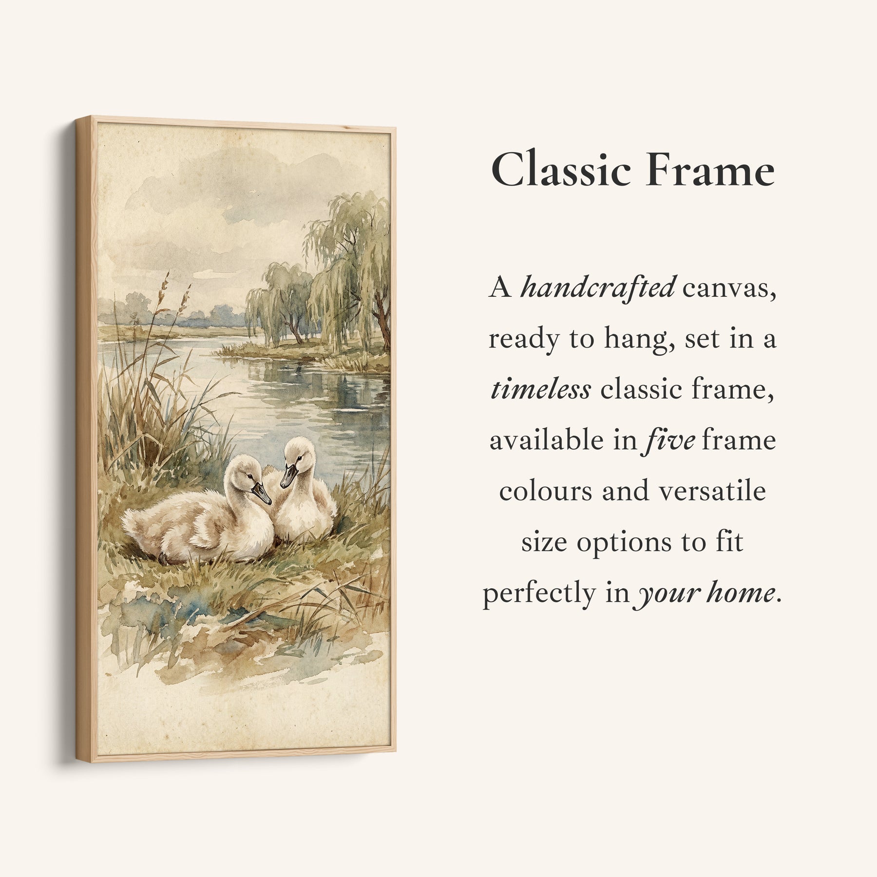 Two swans rest near reeds along a calm river with willow trees in the distance. Beige and green tones blend across water and foliage. The vertical orientation highlights the tall willow forms while centring the swans in the foreground. Reflections in the water add depth to the composition. In a kitchen, this portrait wall art introduces calm natural colour. Its tall canvas proportions work well in narrower spaces.