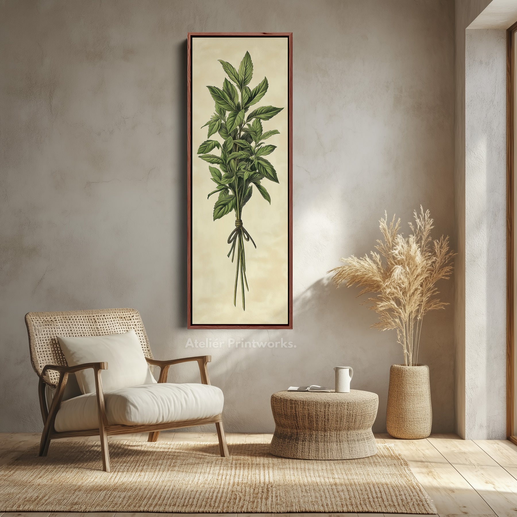 Ideal as large canvas wall decor, this piece works wonderfully in both expansive areas and as a subtle addition to narrower walls. Celebrate the enduring beauty of botanical art with this exquisite mint leaf illustration, crafted to bring a sense of freshness and classic sophistication to your home.