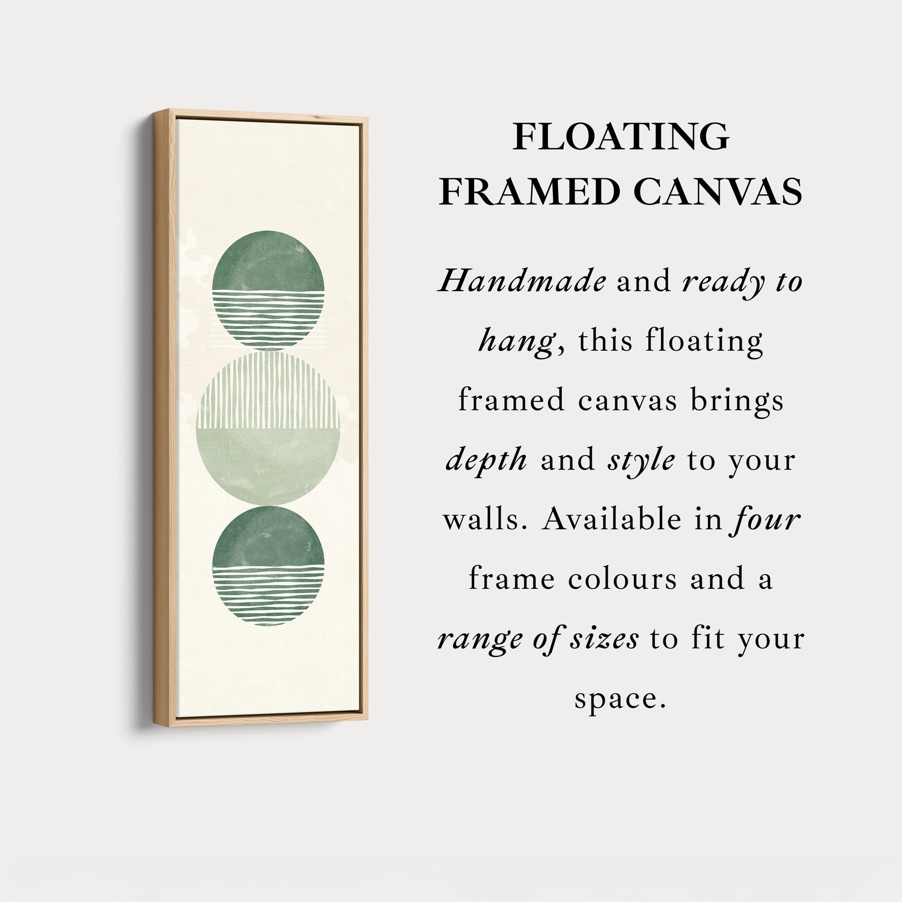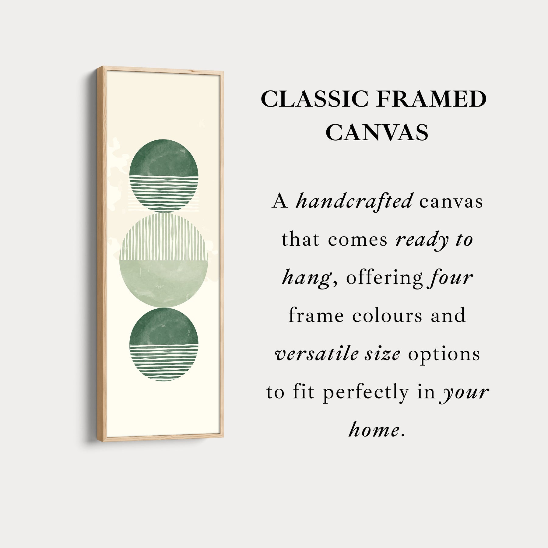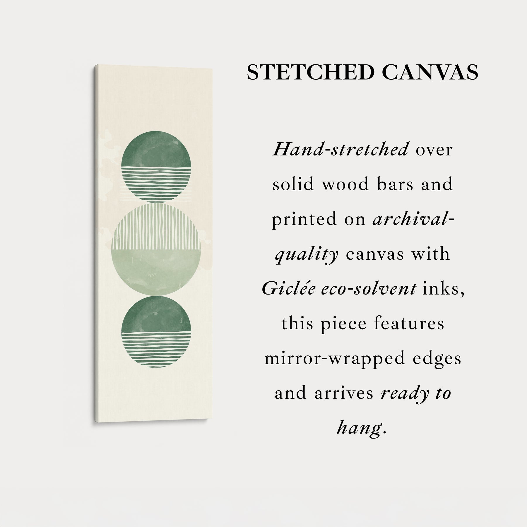 Three circular shapes in alternating soft green hues create a stacked composition that feels modern and rhythmic. The vertical wall art format frames the shapes beautifully. As narrow wall art, it is perfect for hallways or above console wall art setups where height and clean form enhance the interior. This tall canvas design gives calm energy. Ideal for minimalist spaces looking for subtle colour and balance without overwhelming the room.